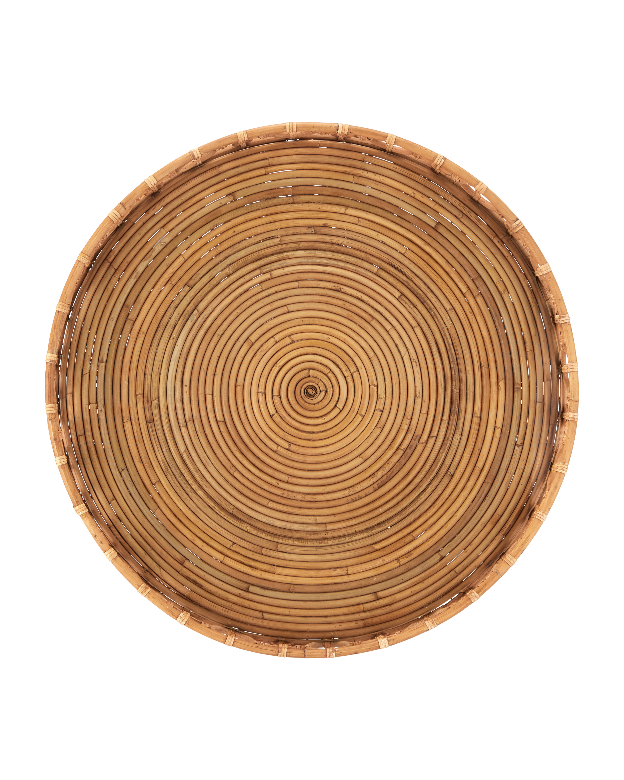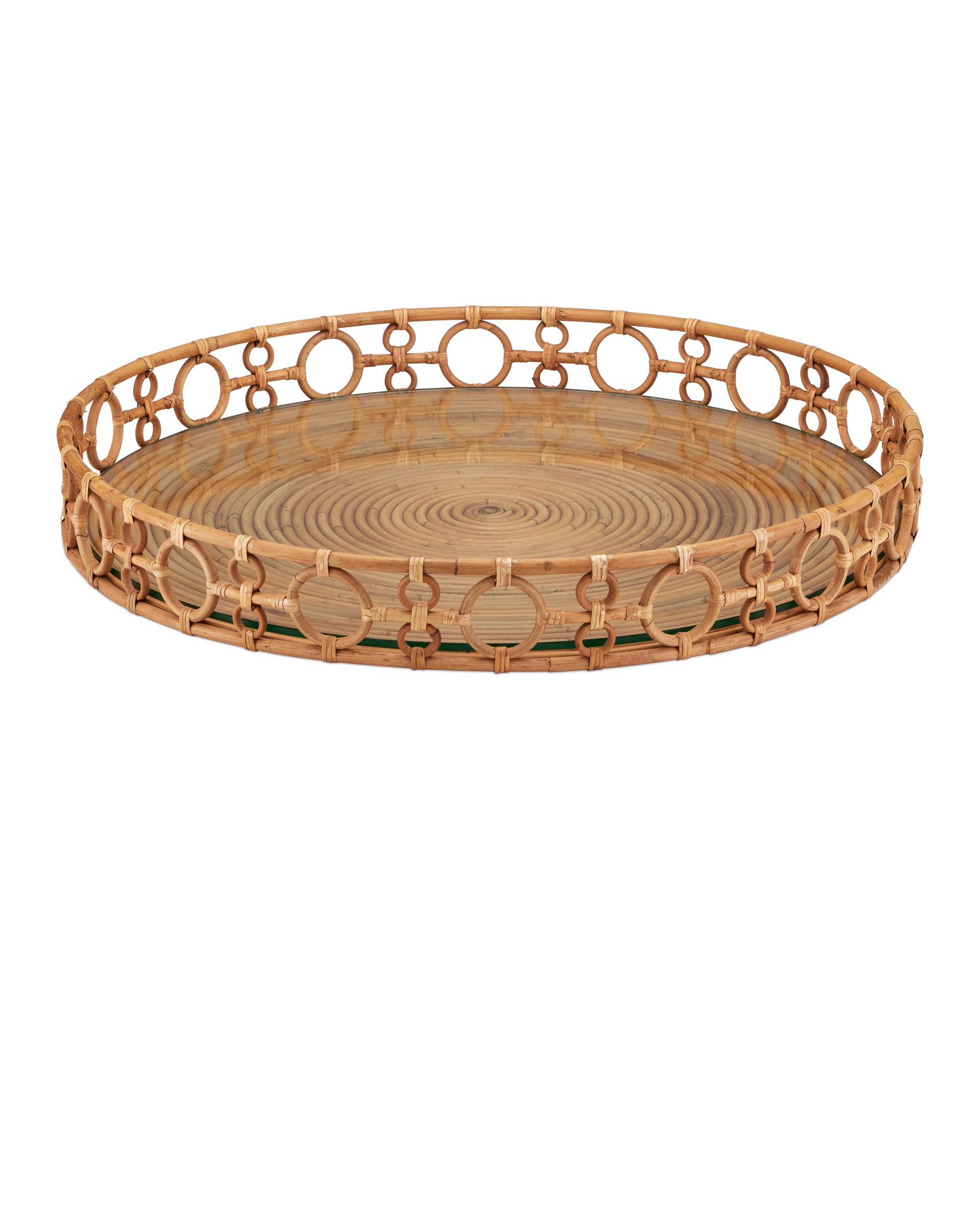 • The Tegal Decorative Serving Tray is over 23 inches in diameter and has a glass inset, which makes it an ideal choice for using as a table-space on an oversized ottoman. Made of Arurog, a reed that is known for its pliability, the decorative tray is also perfect for serving, as the glass forms a protective shield on the bottom. The looping pattern on the sides forms natural handles so it’s easy to grip almost anywhere.