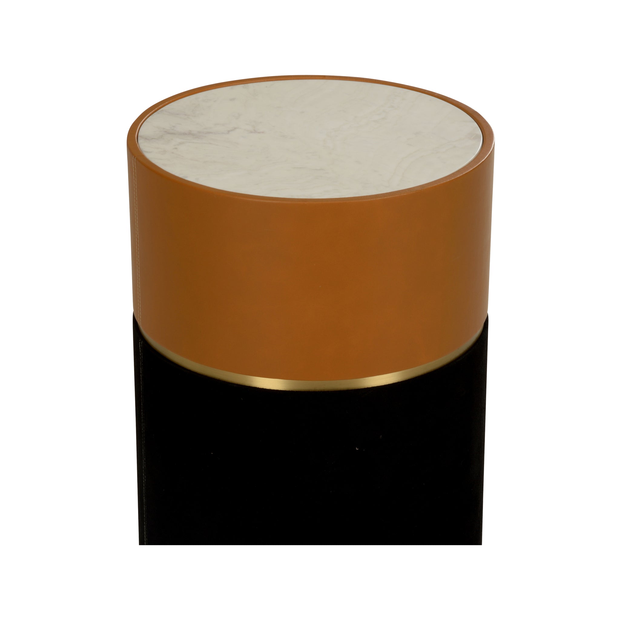 • Introducing the Casey Drinks Table, a luxurious and contemporary accent piece designed to elevate any living space. Topped with a sleek white marble surface, this table exudes sophistication and is perfect for holding drinks, decor, or small essentials. The base of the table features a stunning combination of tan leather and black suede, creating a striking contrast that adds visual depth and texture to the design. These two leather tones are elegantly separated by a brass band, which enhances the table’s modern aesthetic and adds a touch of warmth. Compact yet impactful, the Casey Drinks Table is the perfect addition to living rooms, lounges, or intimate sitting areas, providing both style and functionality.