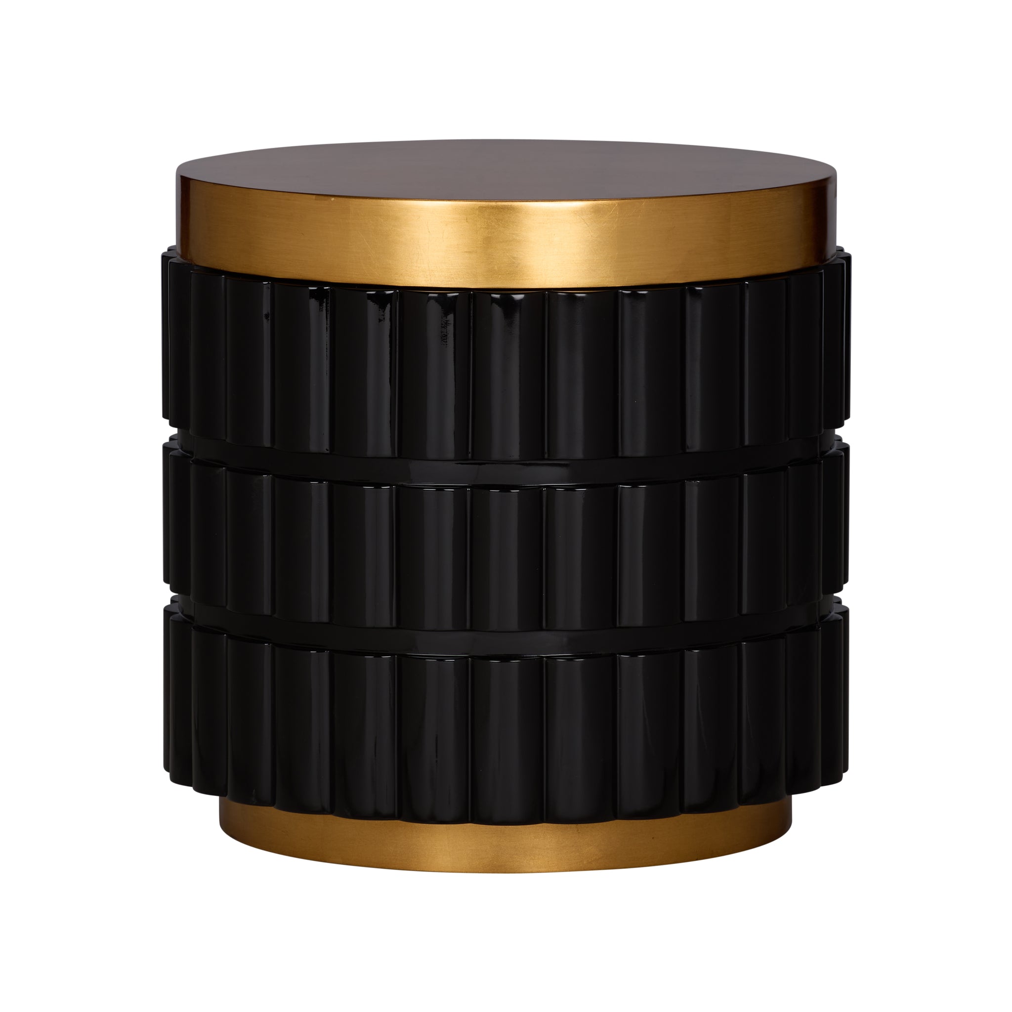 • Bold, modern, and functional—the Ridgeworth Table features a striking black ribbed body accented by a radiant gold leaf top and base. This sculptural piece isn’t just for show. It opens to reveal hidden interior shelving, making it a stylish solution for discreet storage.