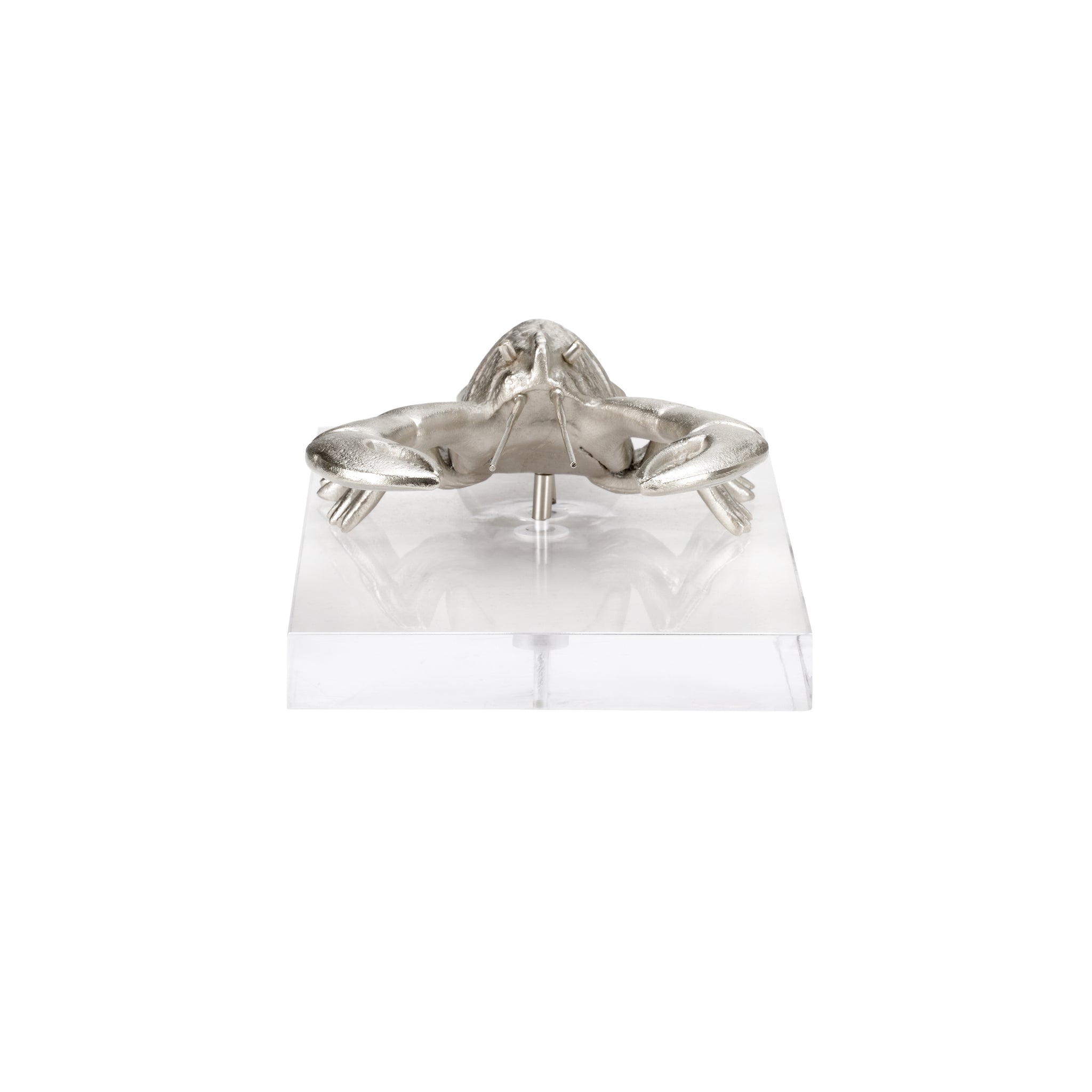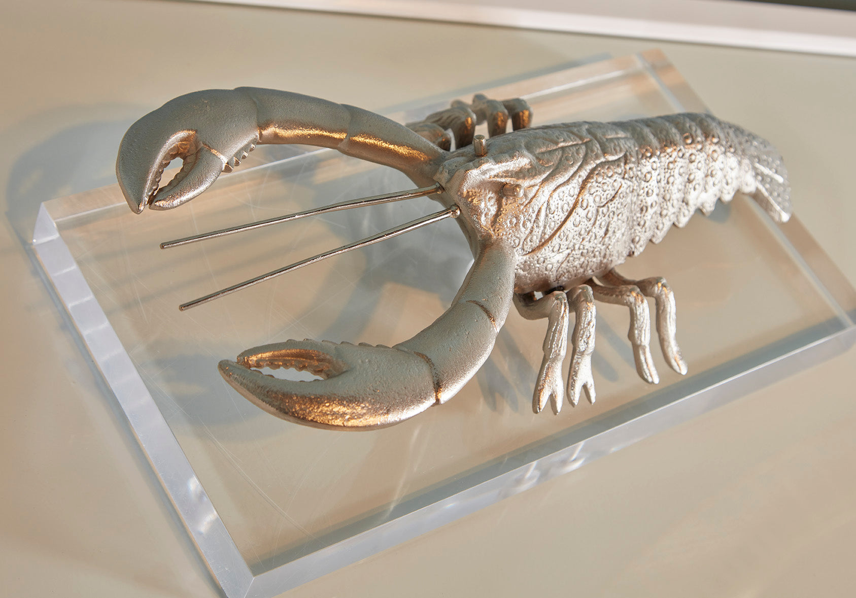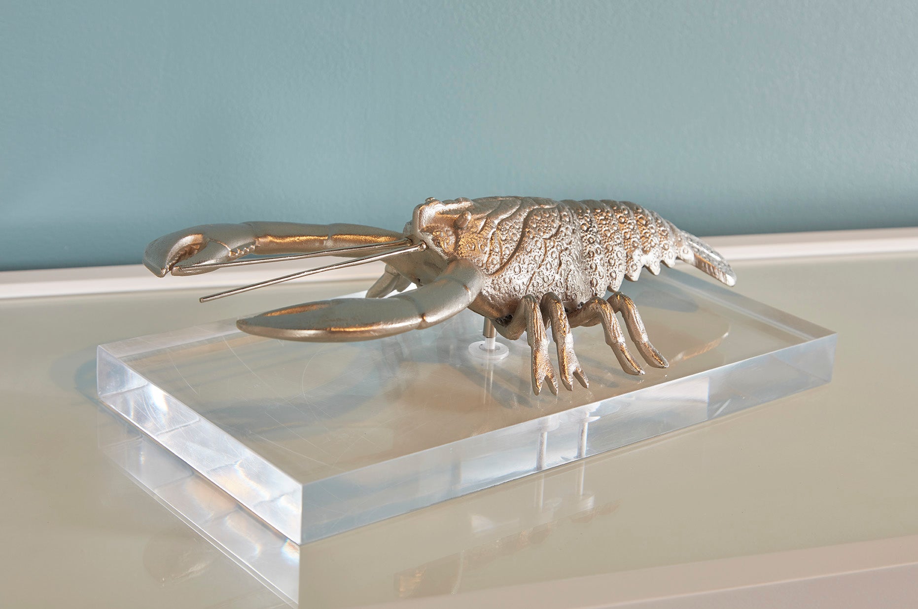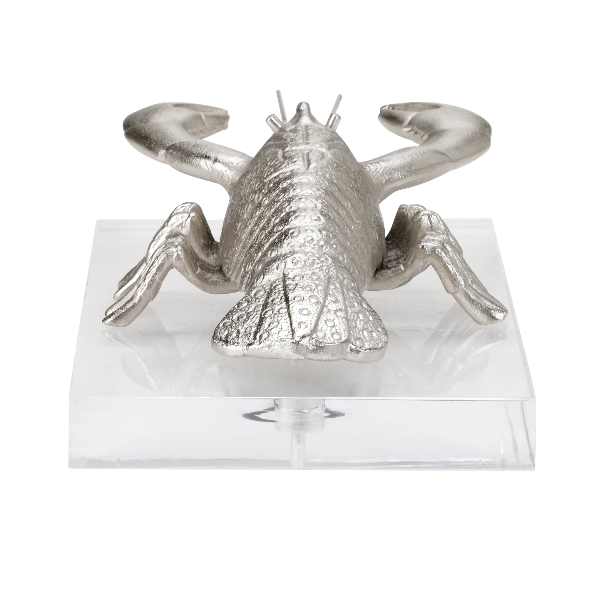 • Thibault is the perfect addition to any cottage or nautical themed room. Mounted on a clear acrylic base, this charming lobster is crafted of aluminum with a brushed nickel finish. Designed for bookshelves and table surfaces.
