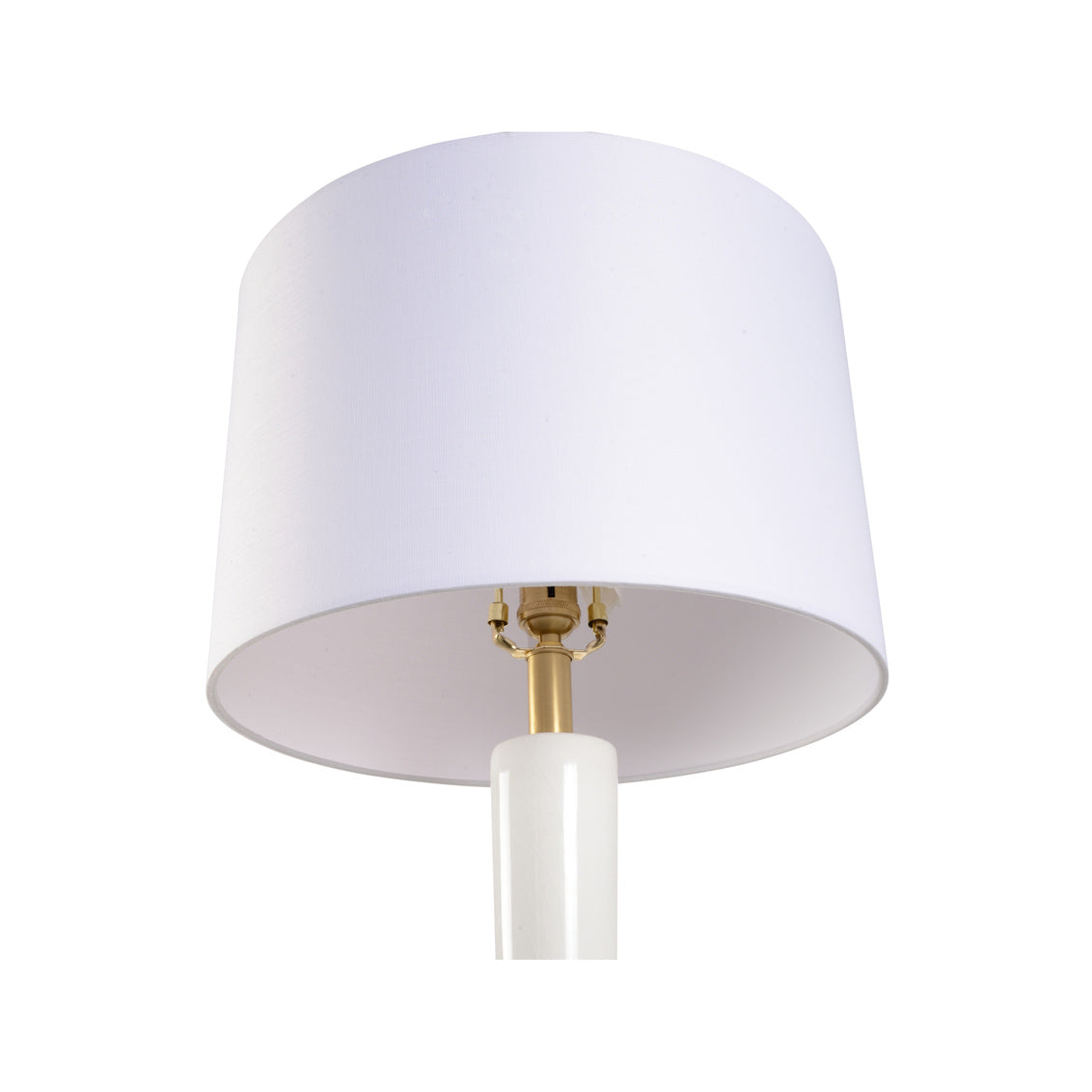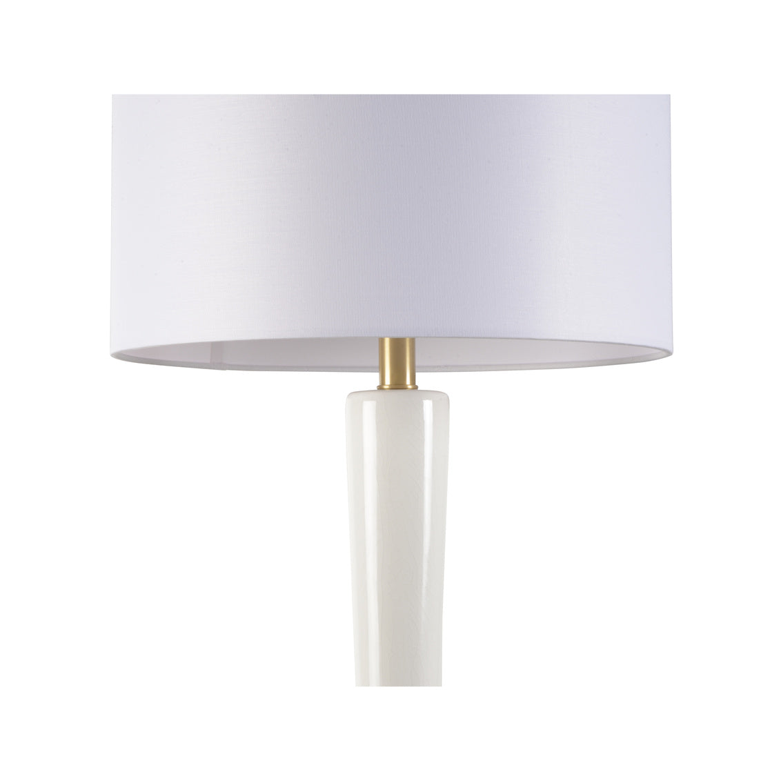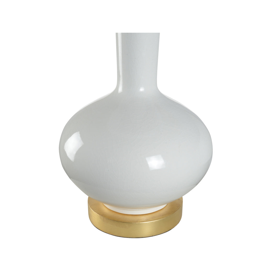 • The Georgia Lamp is a refined and elegant addition to any space, featuring a classic single gourd-shaped ceramic body with a beautiful cream crackled glaze. The subtle texture of the glaze adds depth and a touch of vintage charm, making it a versatile piece that complements both traditional and modern interiors. The lamp is set on a gold leaf base, which adds a hint of luxury and warmth, enhancing its sophisticated look. Topped with a simple white drum shade, the Georgia Lamp emits a soft, inviting glow, perfect for living rooms, bedrooms, or entryways. Its timeless design and understated elegance make it a standout accessory for any decor.