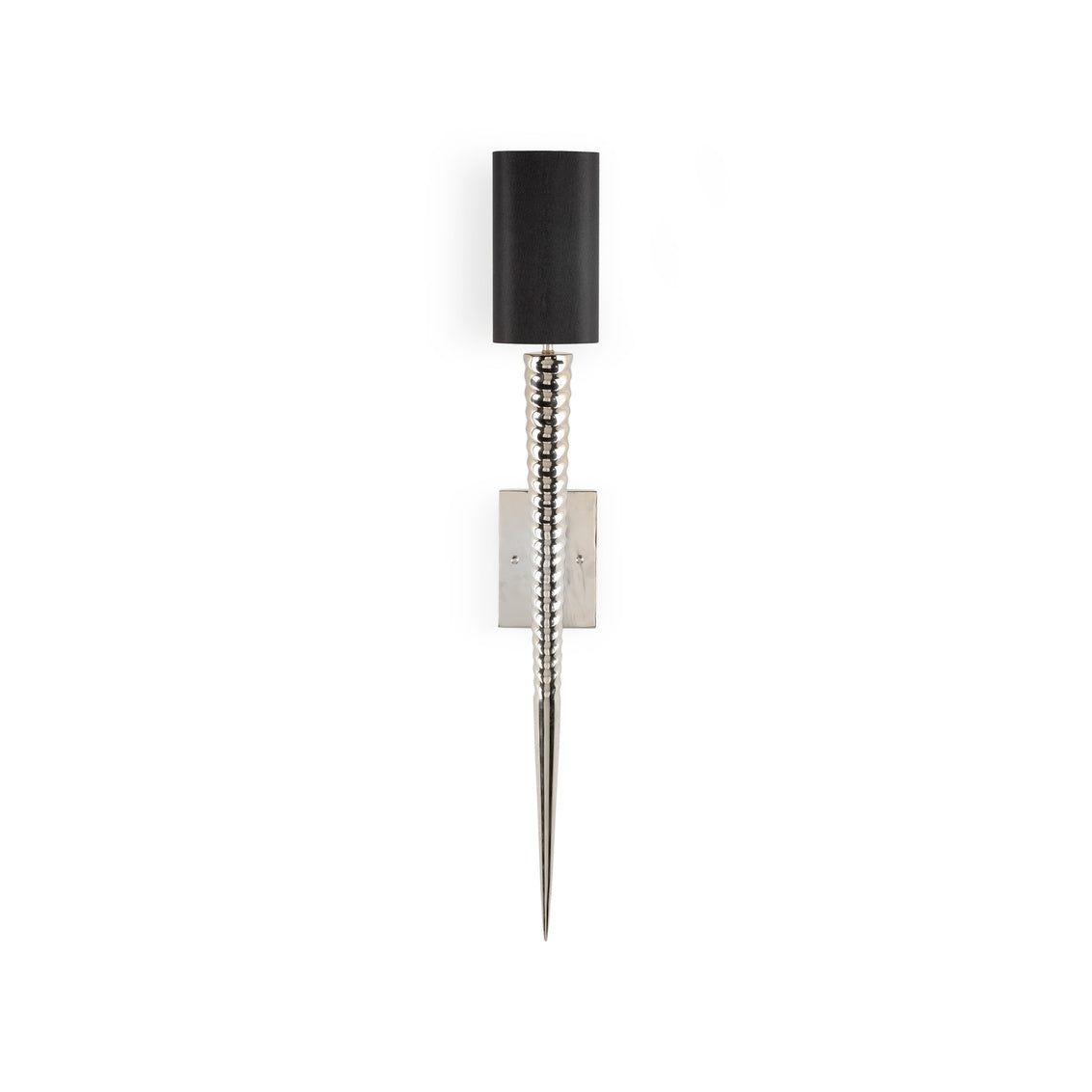 • Polished nickel, one light, modern wall mounted sconce with black silkette shade.