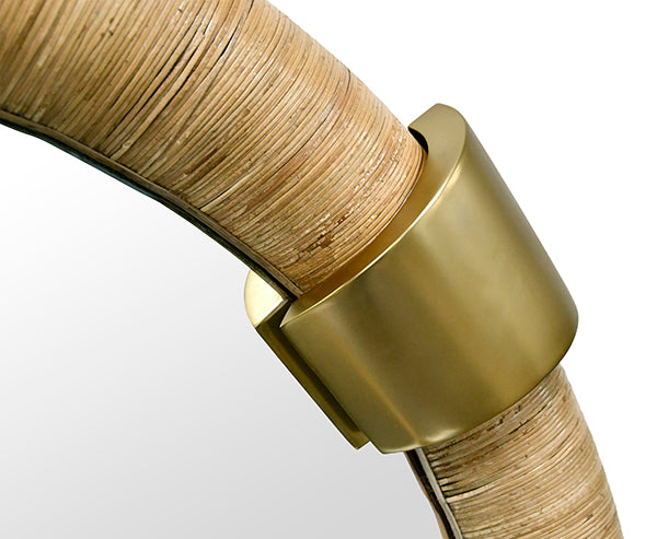 The Worlds Away Saylor Mirror is a stunning round mirror wrapped in rattan, featuring elegant brass detailing that adds a touch of sophistication to any space. This mirror combines natural texture with modern accents, making it a perfect focal point for your home décor.