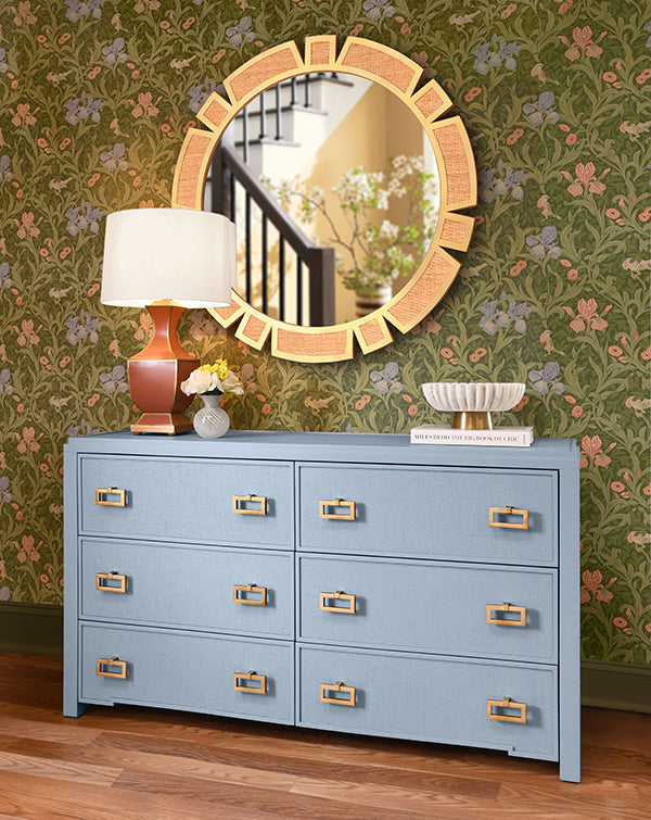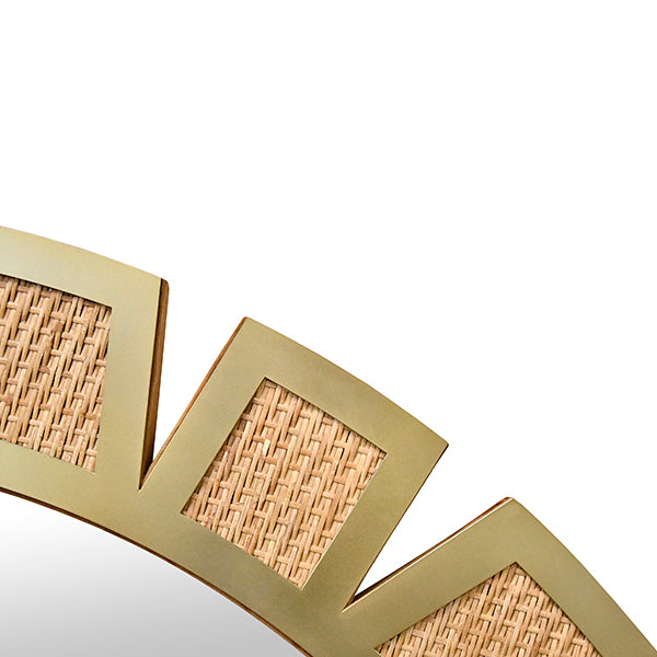 ROUND MODERN SUBURST MIRROR WITH FRAMED RATTAN IN BRASS