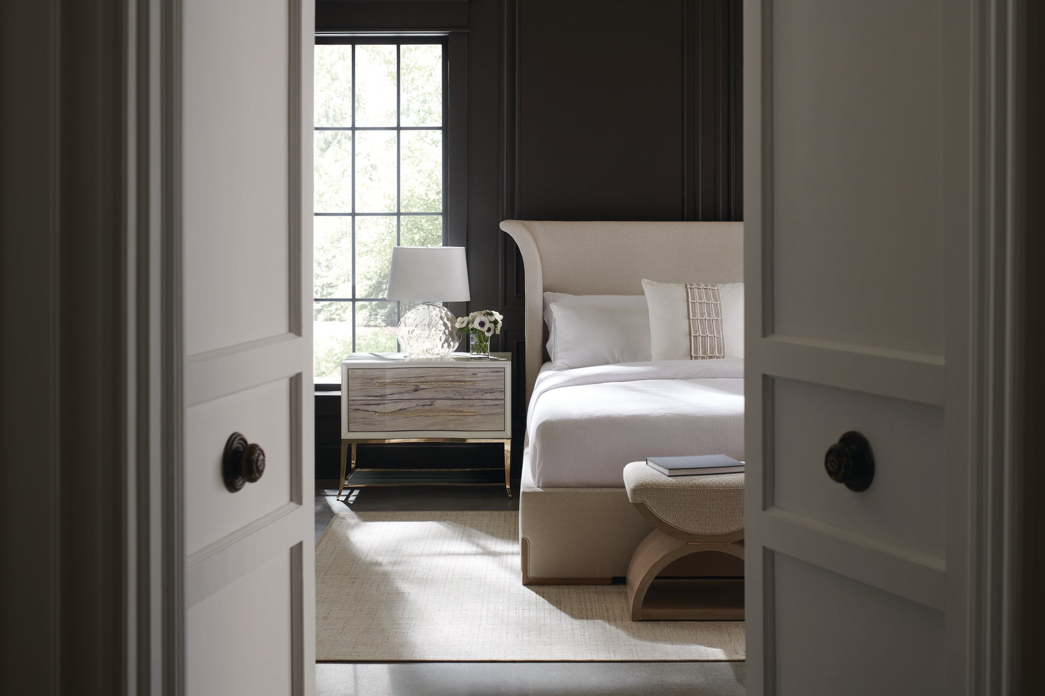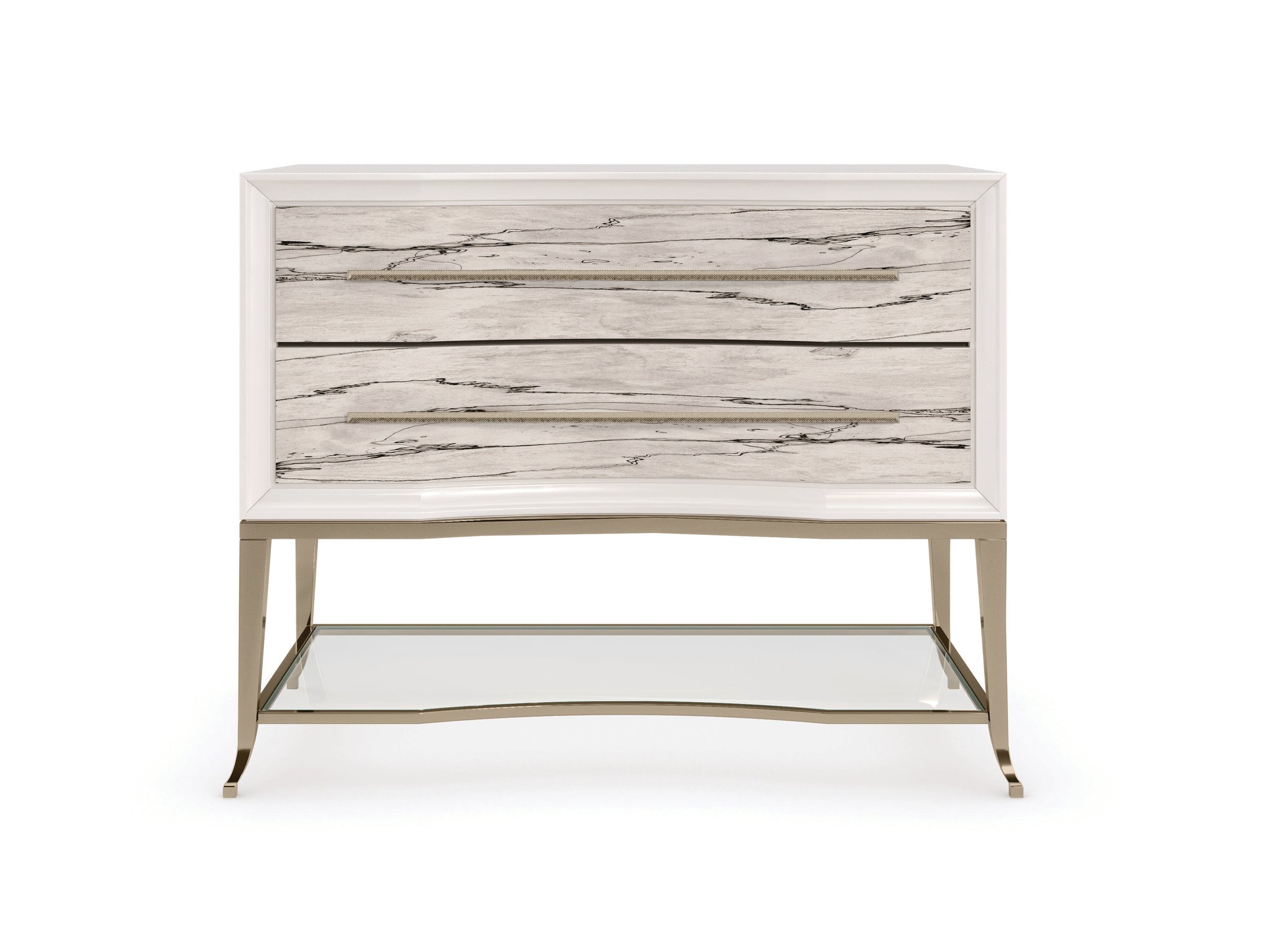 • An elevated take on found beauty in the natural world, this nightstand introduces an organic element with a touch of luxe. Drawer fronts crafted in our exclusive, bleached white printed spalted maple add depth and dimension with dark veining patterns over a light ground reminiscent of fallen snow. Dimpled bar drawer pulls and a Majestic Gold base are a glamorous complement to its Pearly White finish, which pairs well with other pieces in our bedroom storage collection. Top drawer features dividers and a removable sliding jewelry tray, with a glass shelf beneath for open storage and display.
