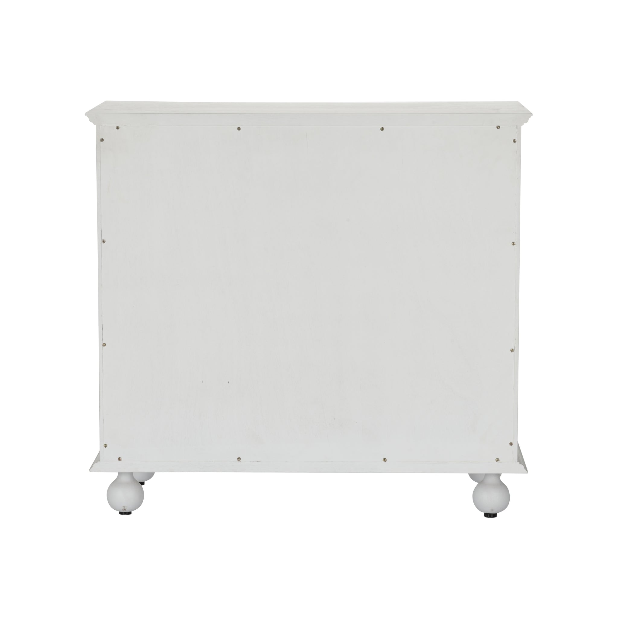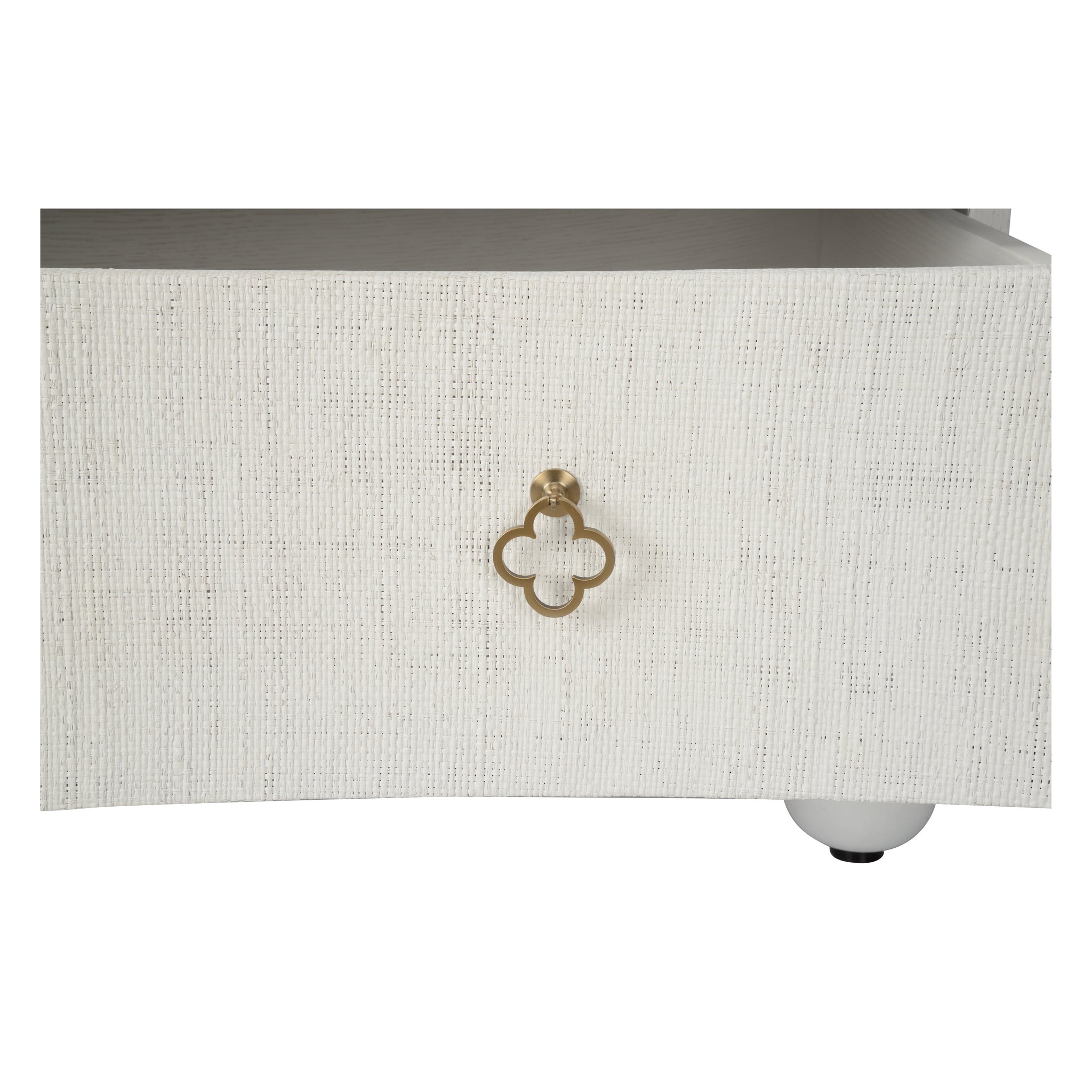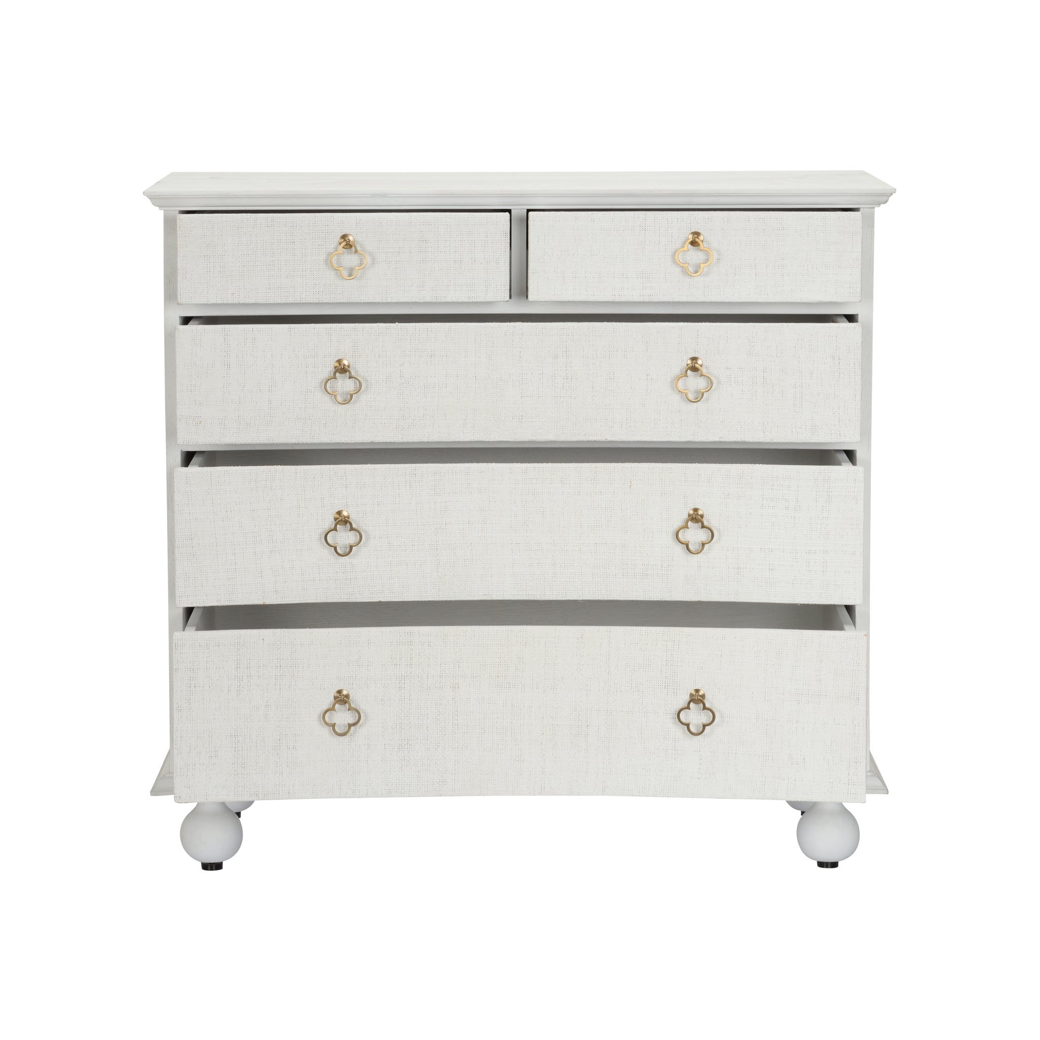 • The Maxwell Chest is a stylish five-drawer piece featuring a wooden frame finished in crisp white, elevated by classic ball feet. The drawers are wrapped in green or white raffia, adding texture and a coastal charm, while antique brass hardware enhances its timeless elegance. Designed by Bill Cain.
