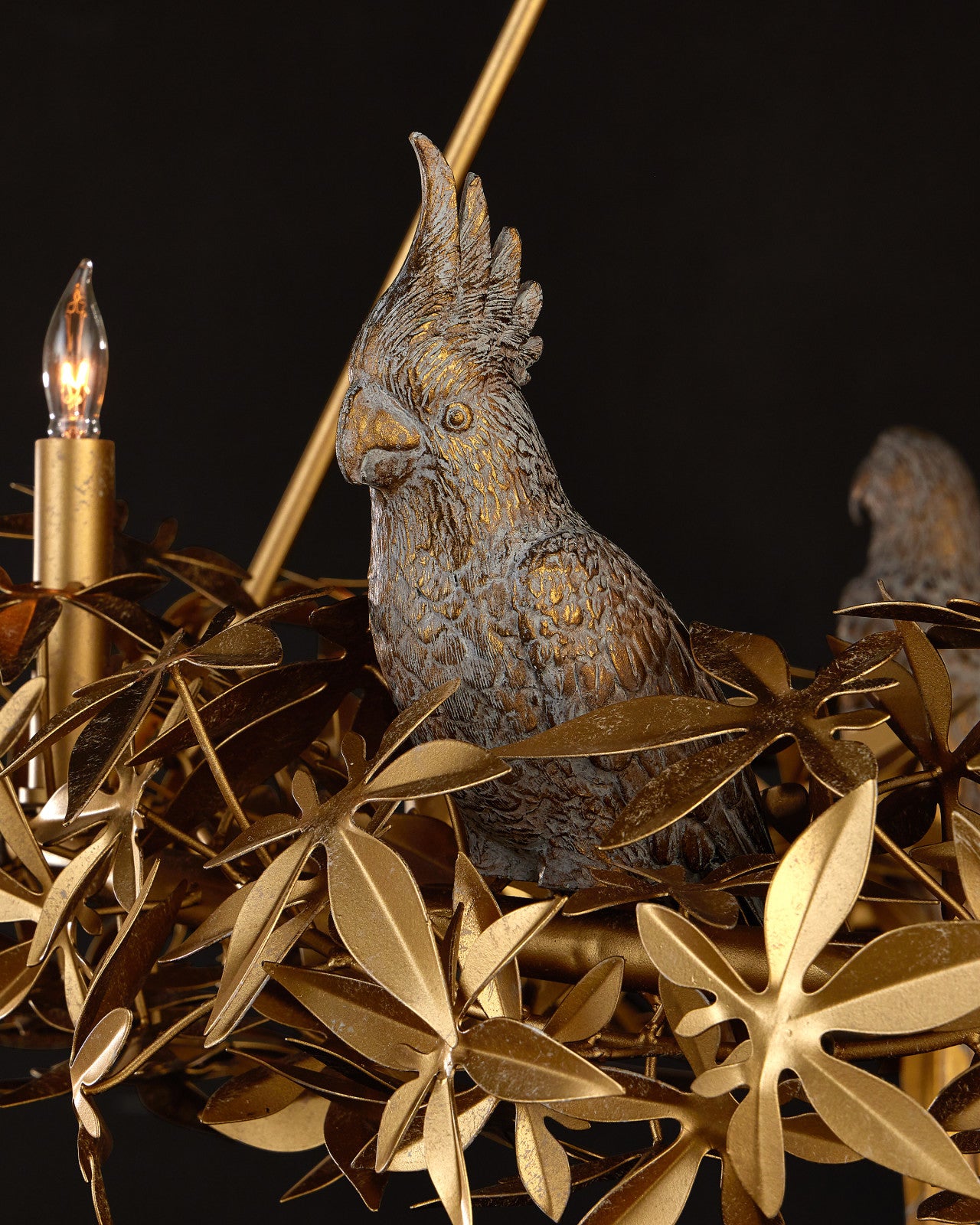 • The Aviary Gold Ring Chandelier showcases flowing leaf and floral motifs in a refined Swedish Gold finish. Perched among the botanical elements are sculptural birds—cockatiels, sparrows, and macaws—based on original carvings by a skilled sculptor. Free-flowing metal feathers add dimension and artistry, making this chandelier a striking fusion of nature and craftsmanship. Adjustable from 41.25" to 116.75" with use of included chain/rod kit/cable. If your space calls for a longer drop, additional chain/rods/cable is available for purchase.