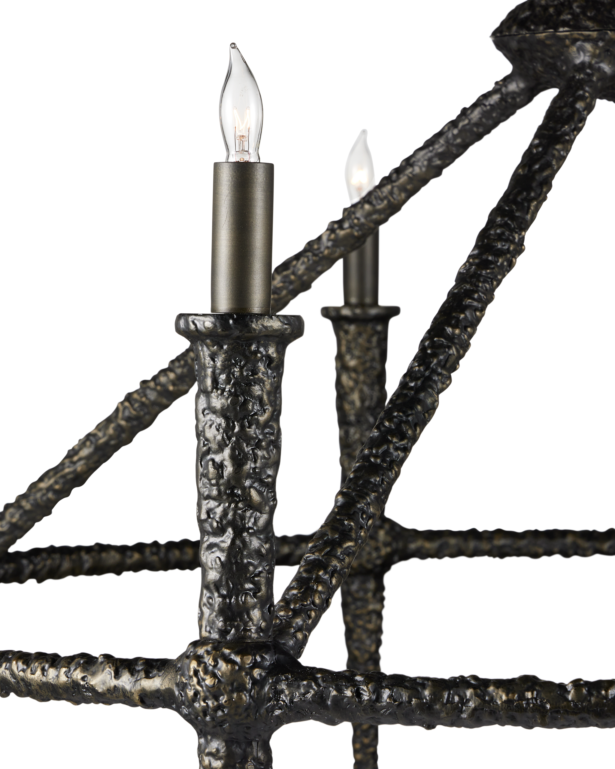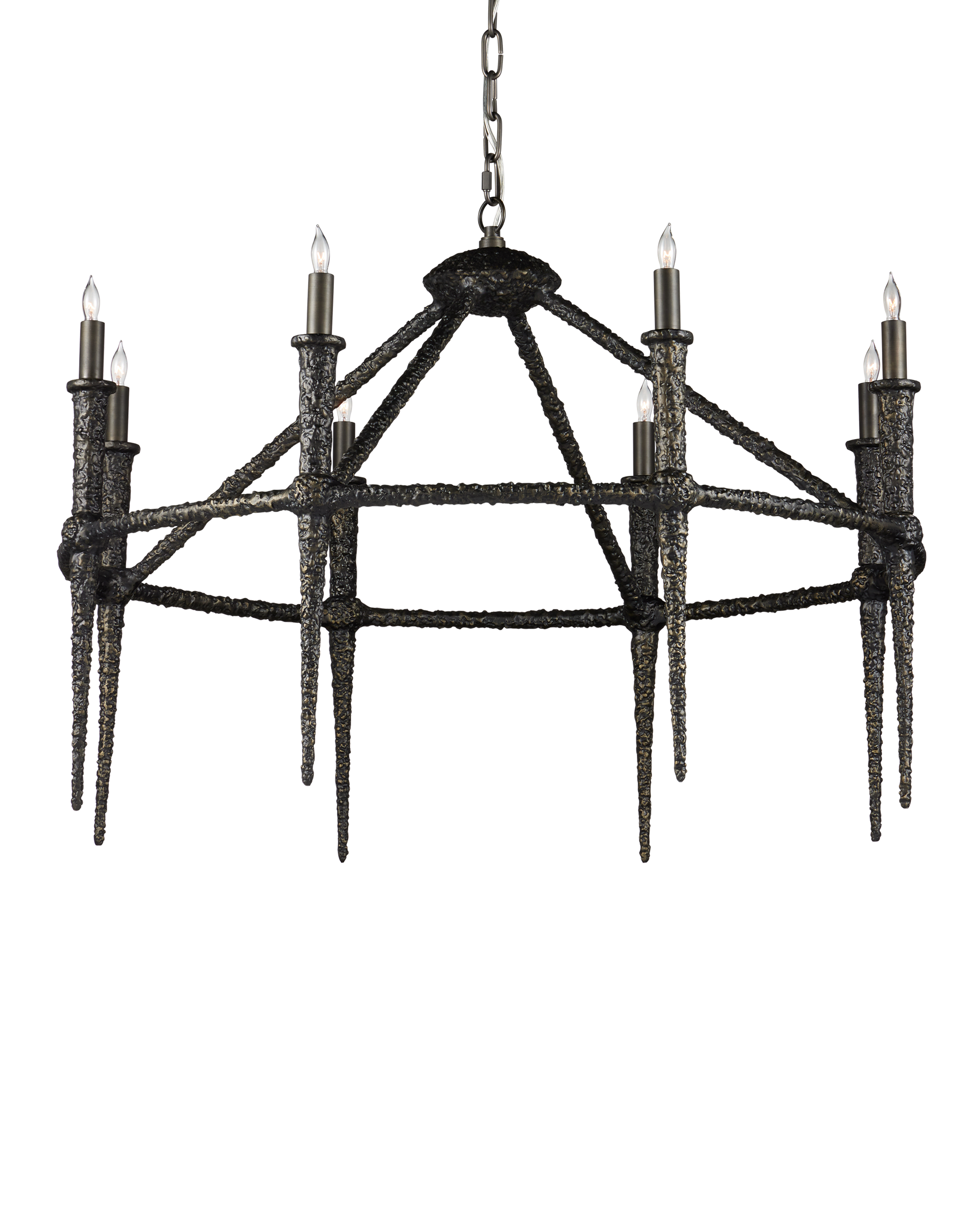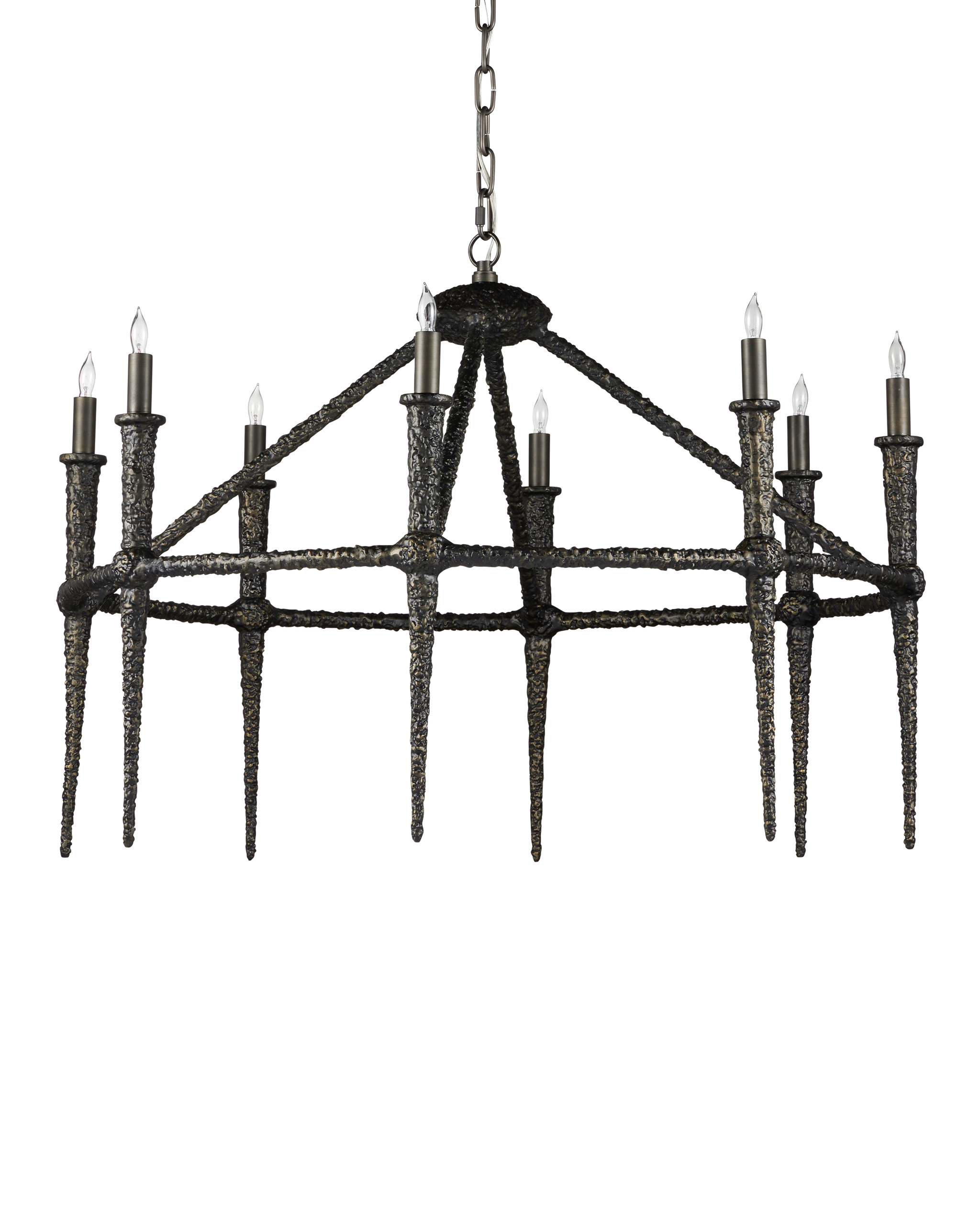 • The Blackthorn Chandelier has a medieval feel that pays homage to its namesake plant that has been springing up in European gardens since the Middle Ages. Made of aluminum, the metal is covered in an aged bronze finish that gathers in the crevices, adding the texture and richness. Adjustable from 34.5" to 101" with use of included chain/rod kit/cable. If your space calls for a longer drop, additional chain/rods/cable is available for purchase.
