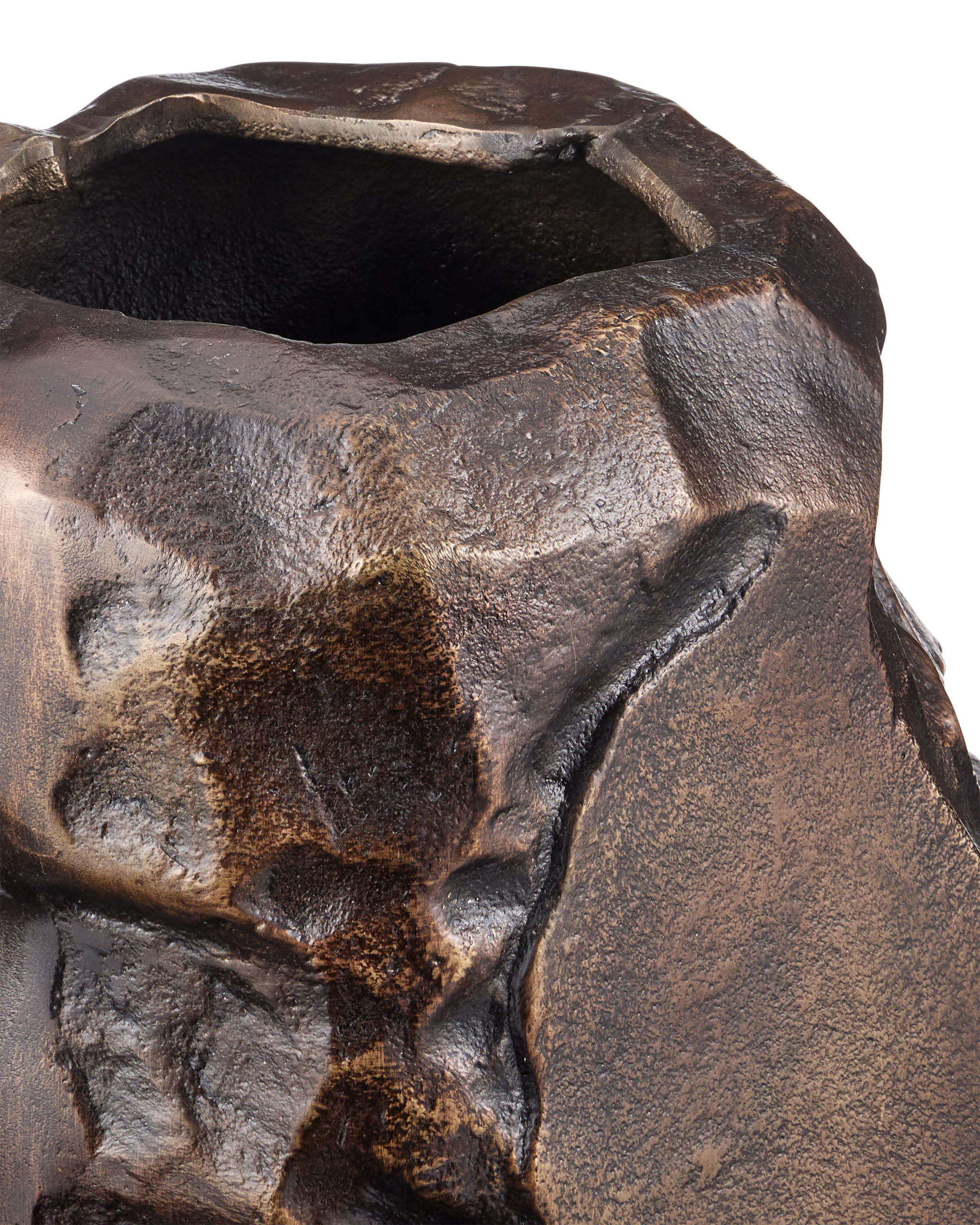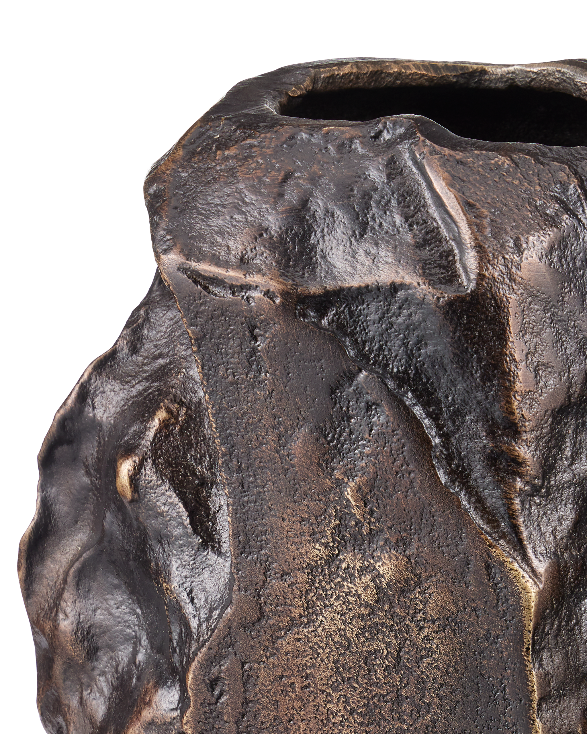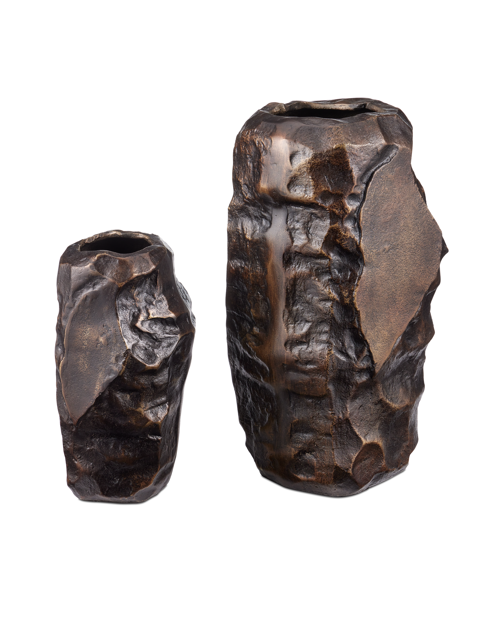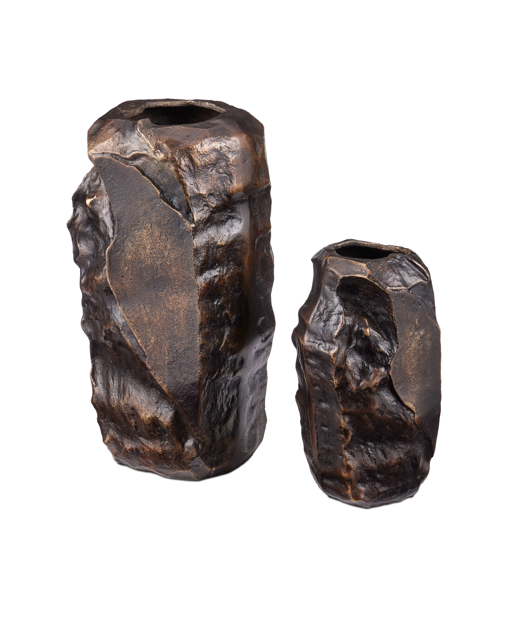 • Brutalist in style, the Carmelo Vase Set includes two cast aluminum vessels in a scorched bronze finish that brings the surfaces a warm gleam. The organically shaped profiles look as if they were born during the famous time in design history when brutalism was at its height. Made in two parts and joined with a welding process, these vases are designed for use only with artificial flowers.