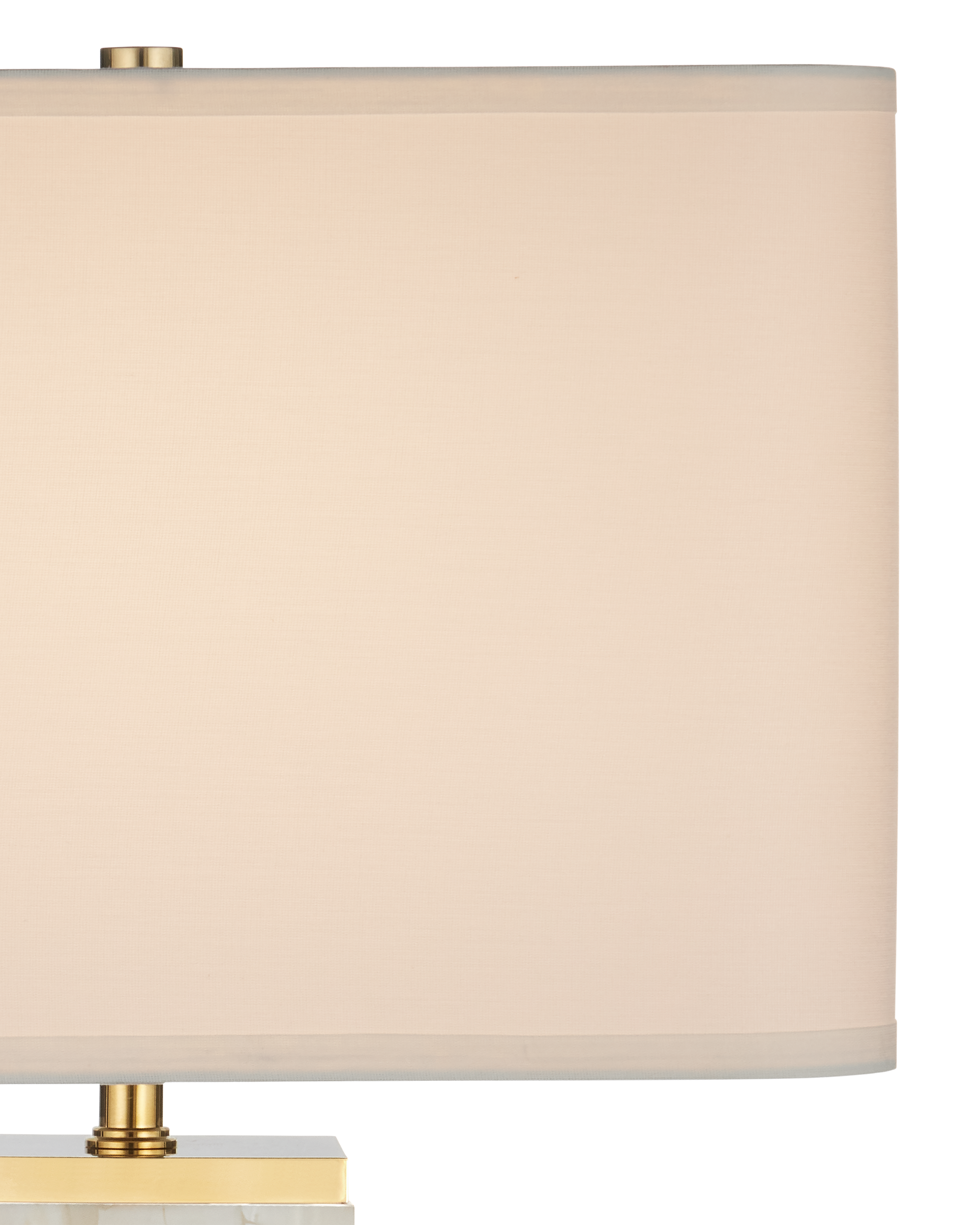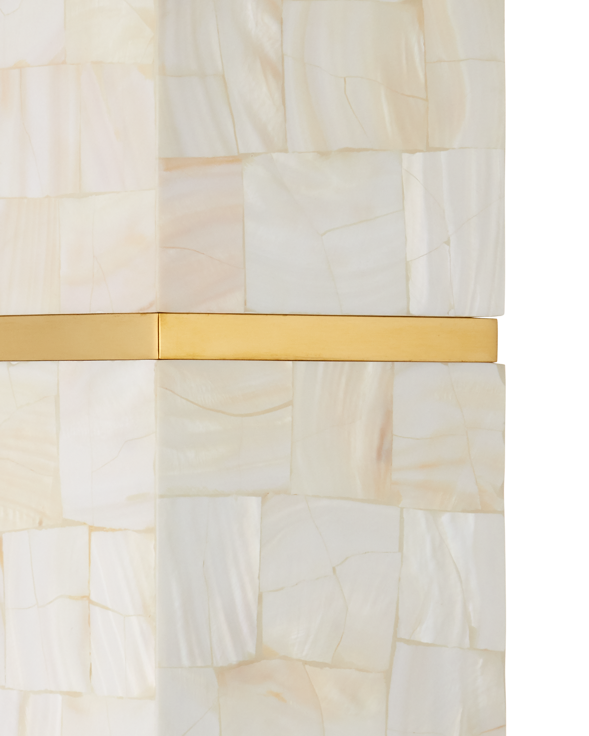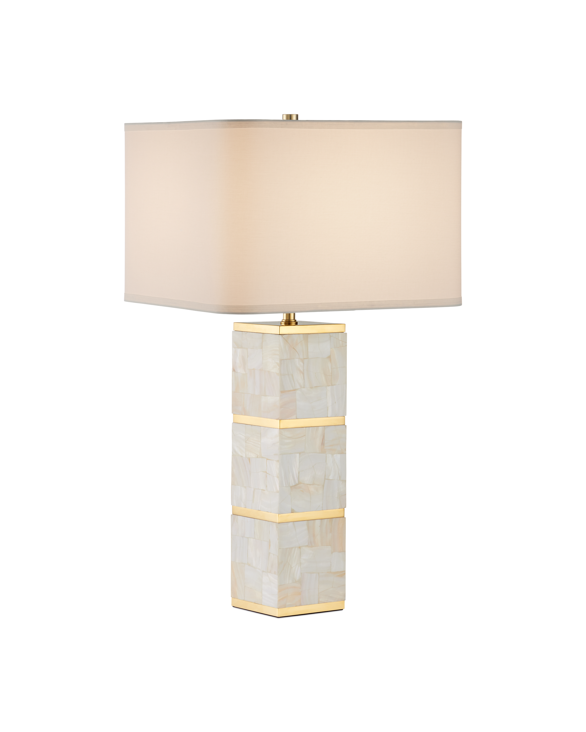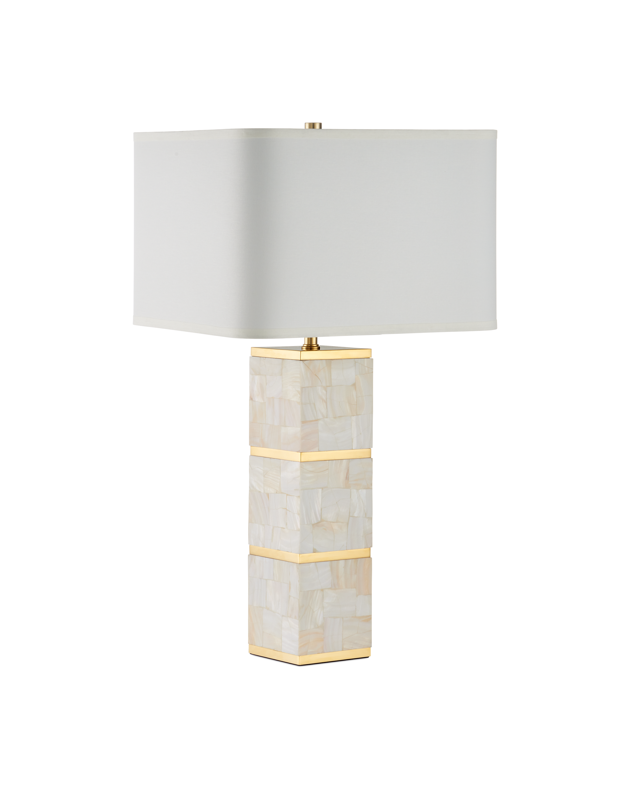 • The Casey Table Lamp has a stacked column of cubes covered in matte mother of pearl separated by recessed metal strips in a bright brass finish, one of which creates a plinth base and another caps the square column. The pieces of shell are hand-applied in a mosaic that makes this an artisanal piece. The rounded edges on the self-trimmed square shade nicely contrast the angular body of the gold and ivory lamp.