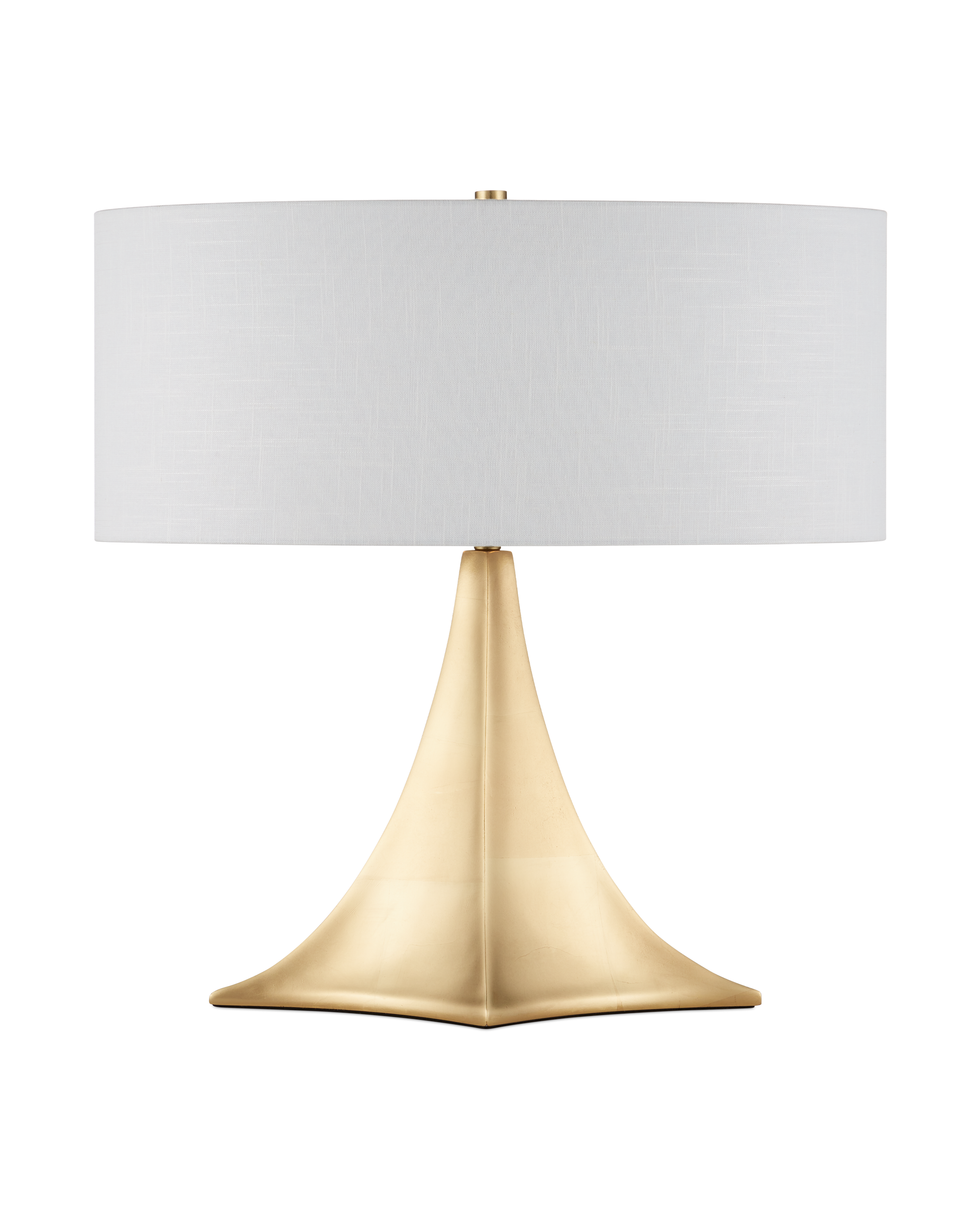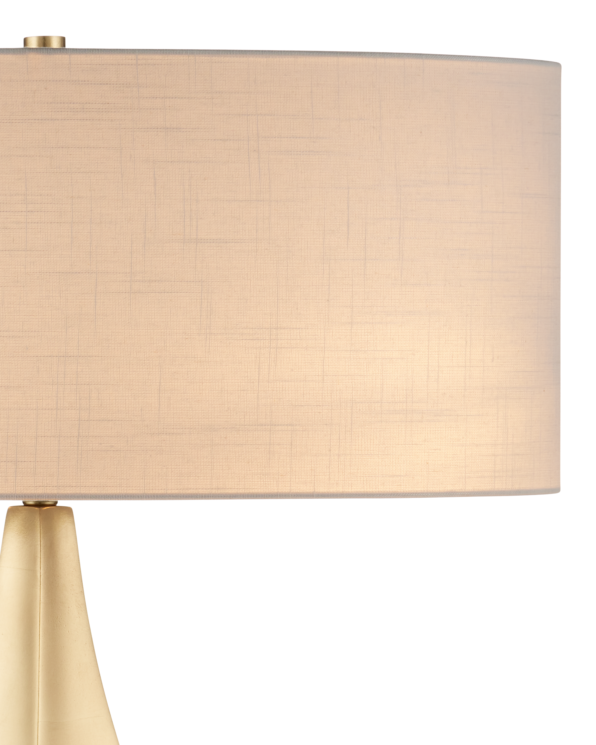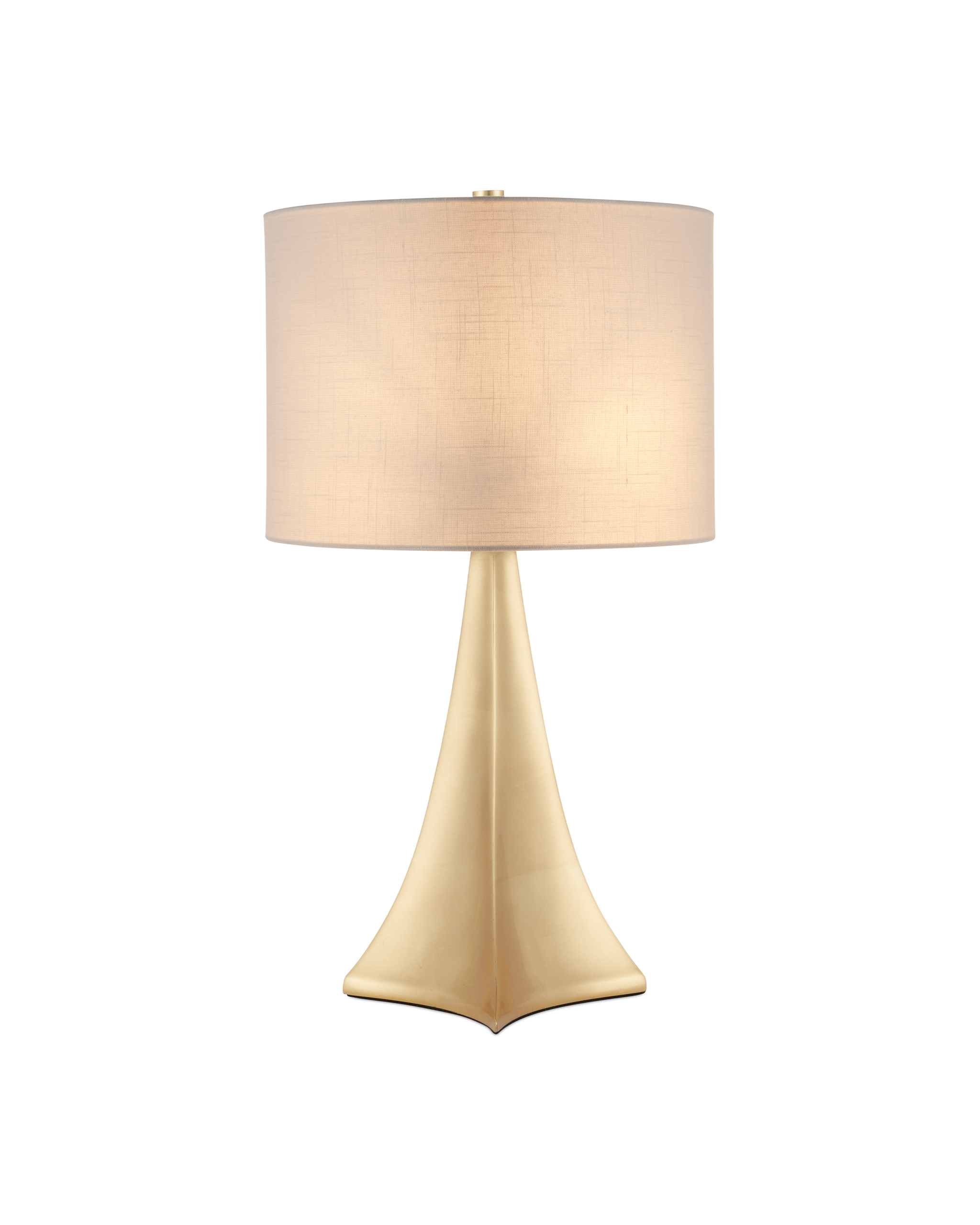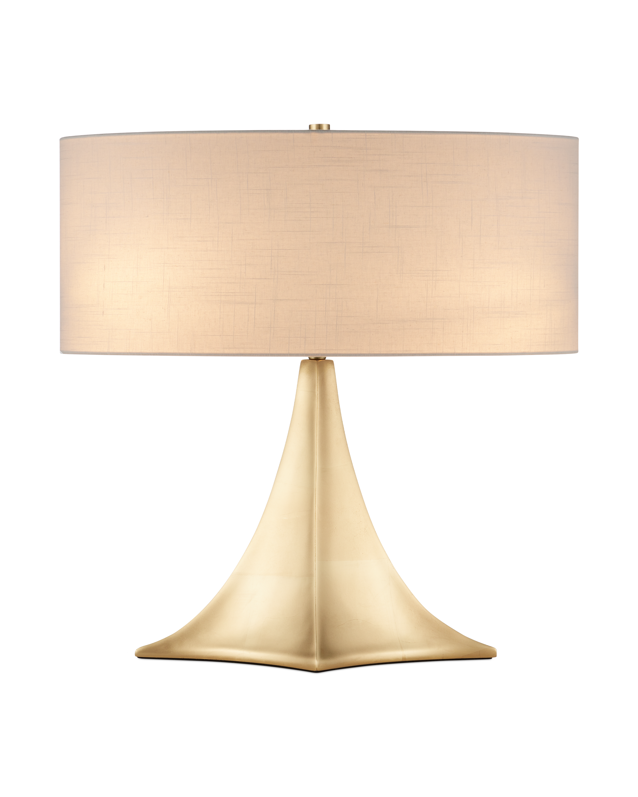 • The brilliant gold metallic finish on the Cassia Table Lamp brings its profile a striking richness. Made of composite, the bottom with its stretched diamond shape flows up through four concaves to narrow just before it meets the shade. The softened geometric shape is topped with an oval shade that makes this a great choice for desks or narrow tables like consoles and buffets.