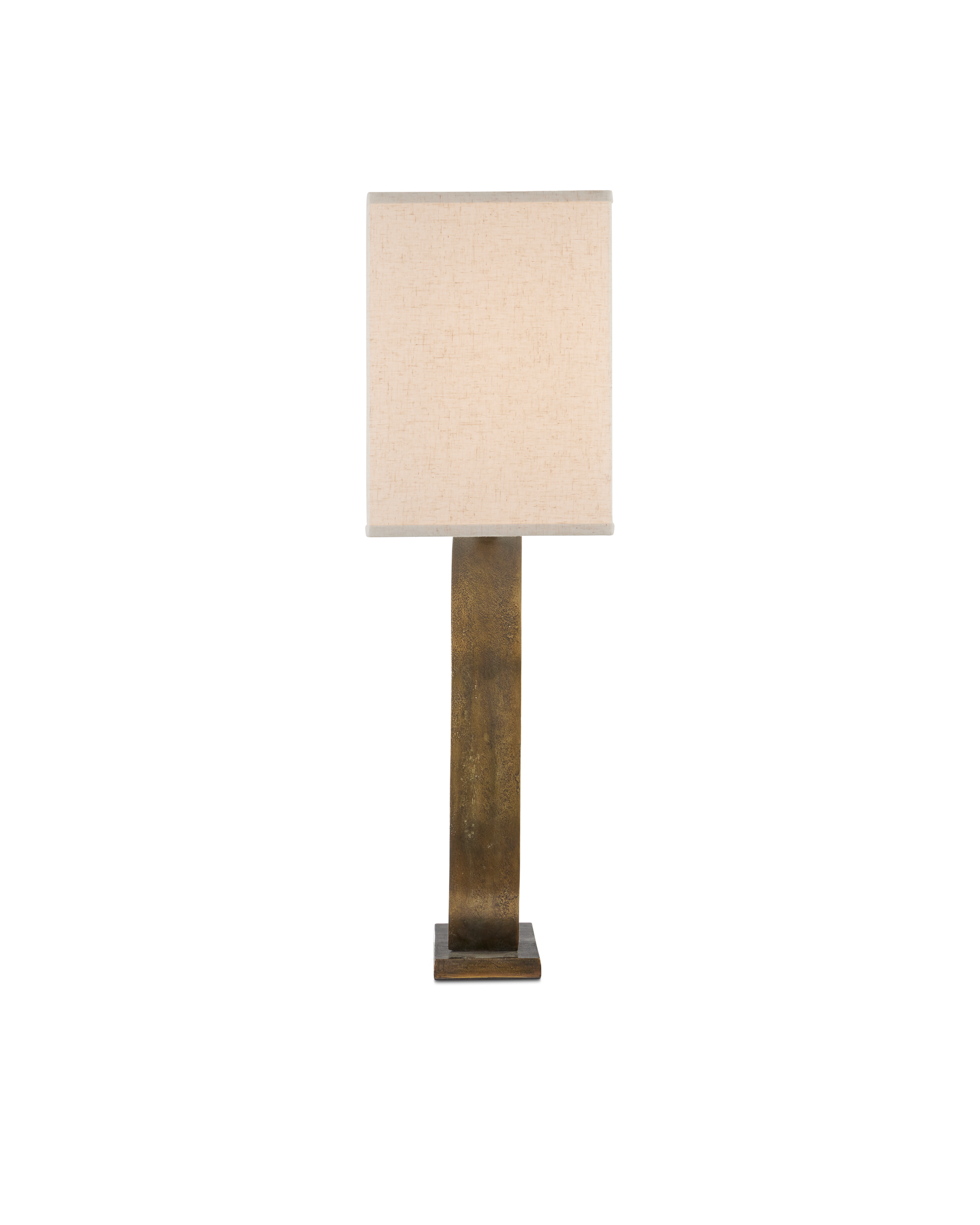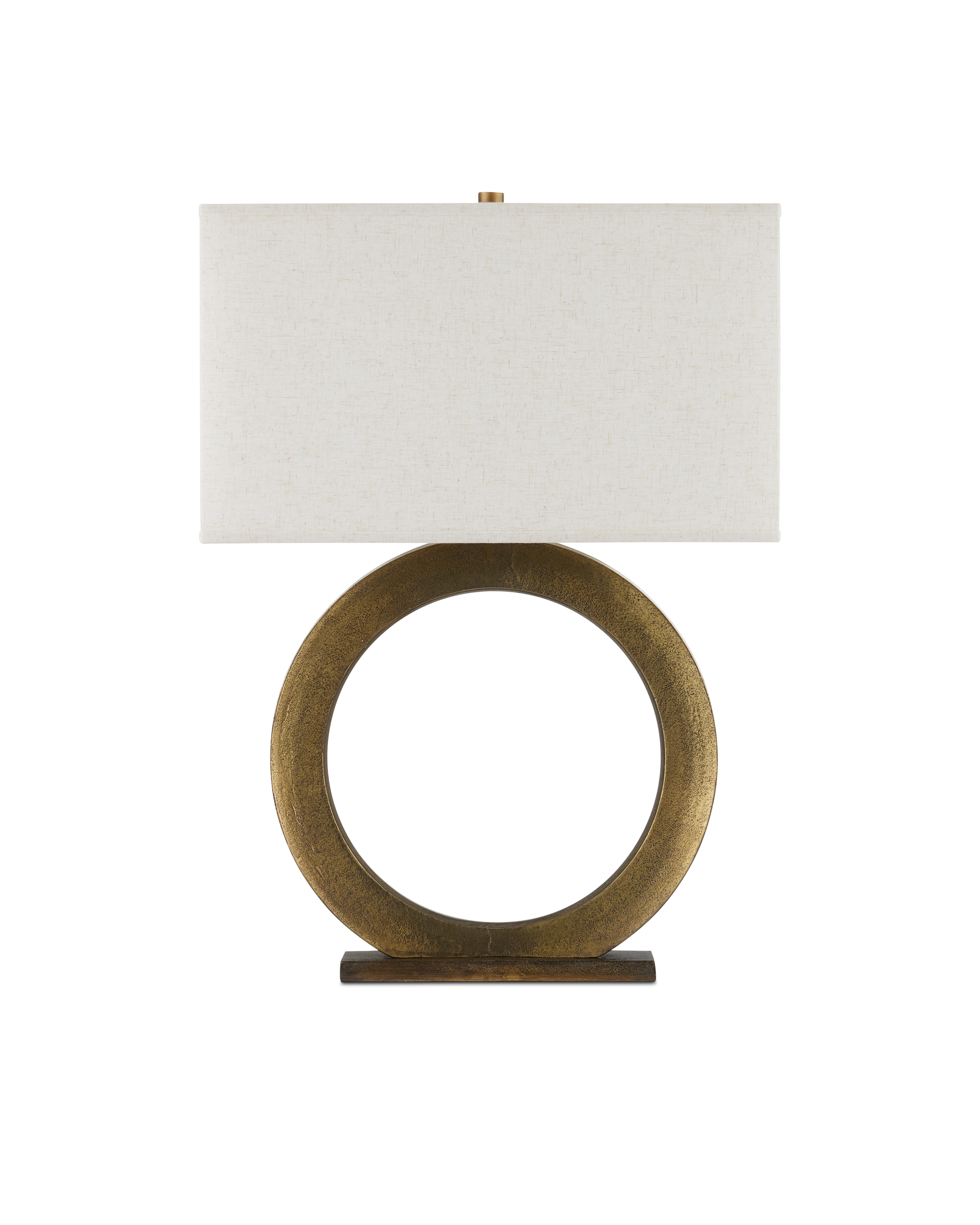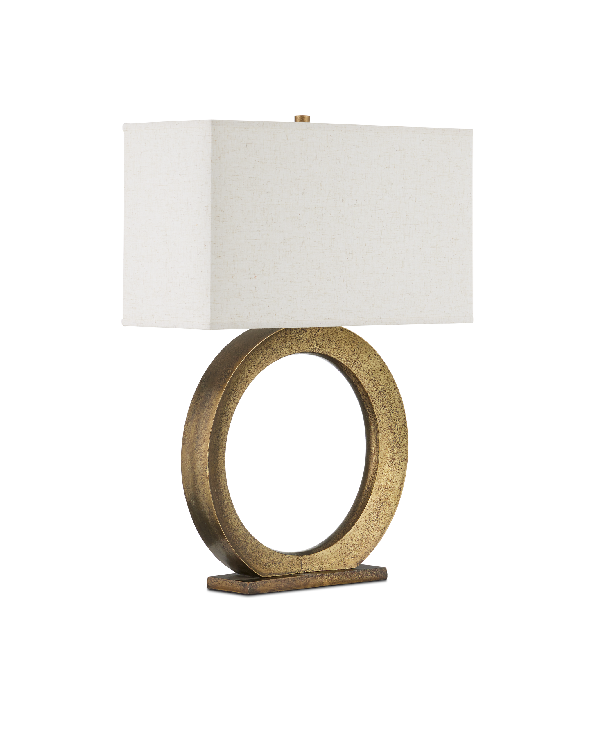 • The Cercle Table Lamp is a shapely deep gold lamp that reflects the playful shape behind its French name. Made of cast aluminum, the elegant ring is affixed to a minimal rectangular base in the same dark brass antique finish. The clean-lined rectangular shade, which is perfectly in scale with the body, has a sophisticated trim on the top and bottom edges.