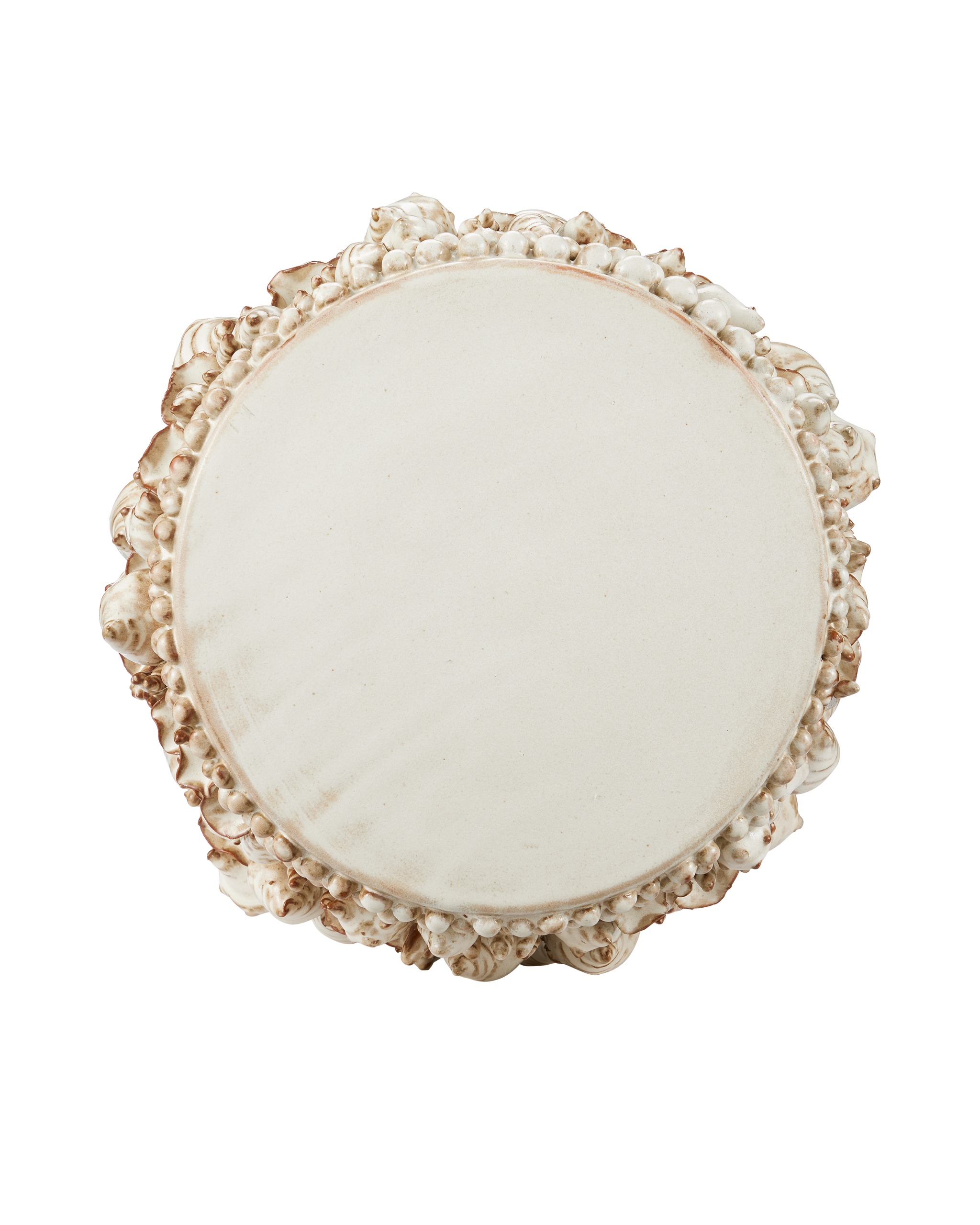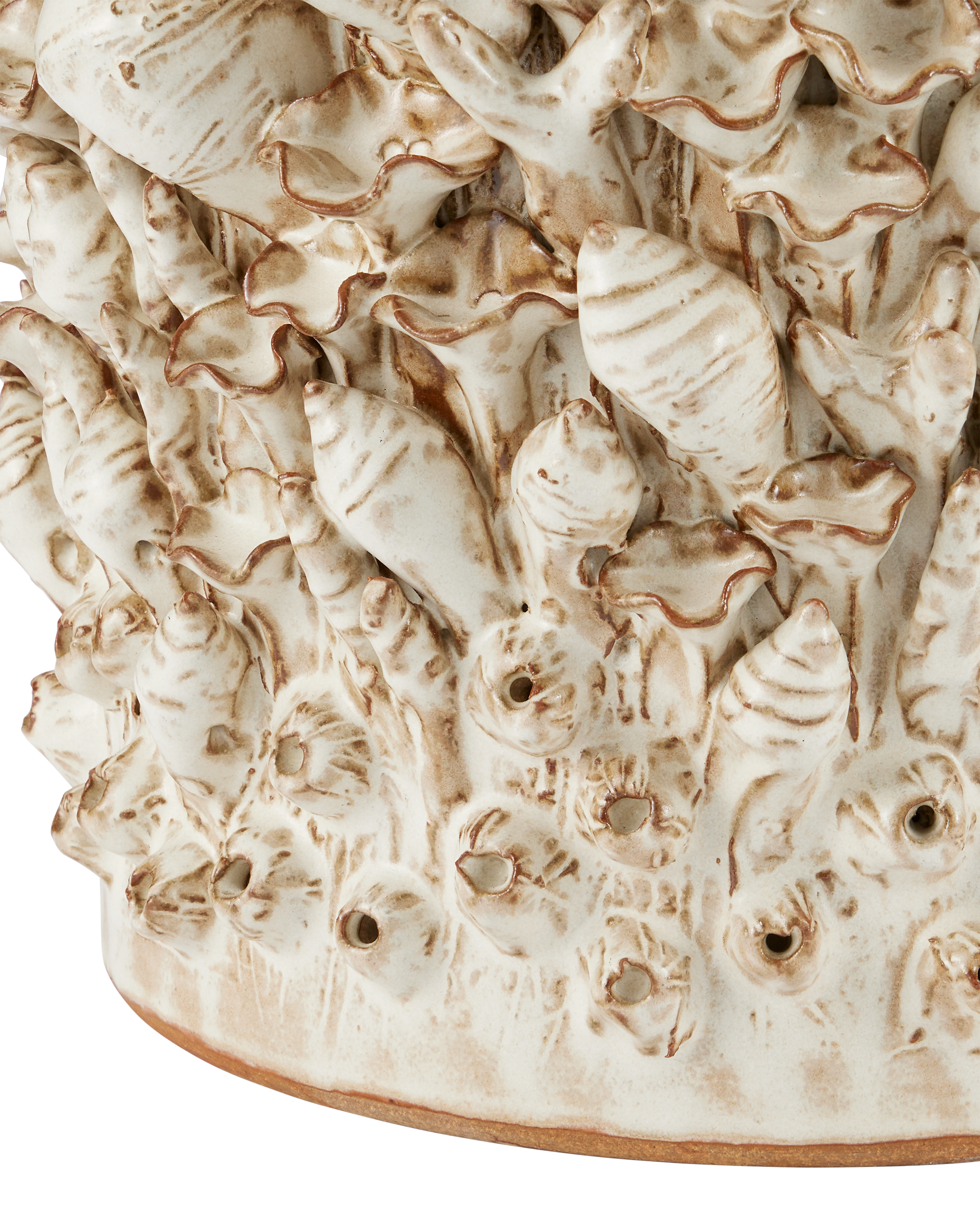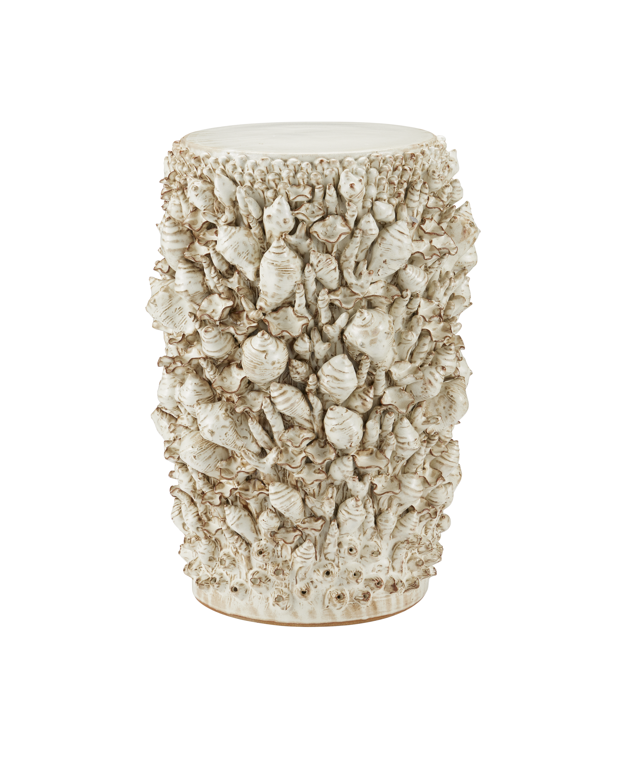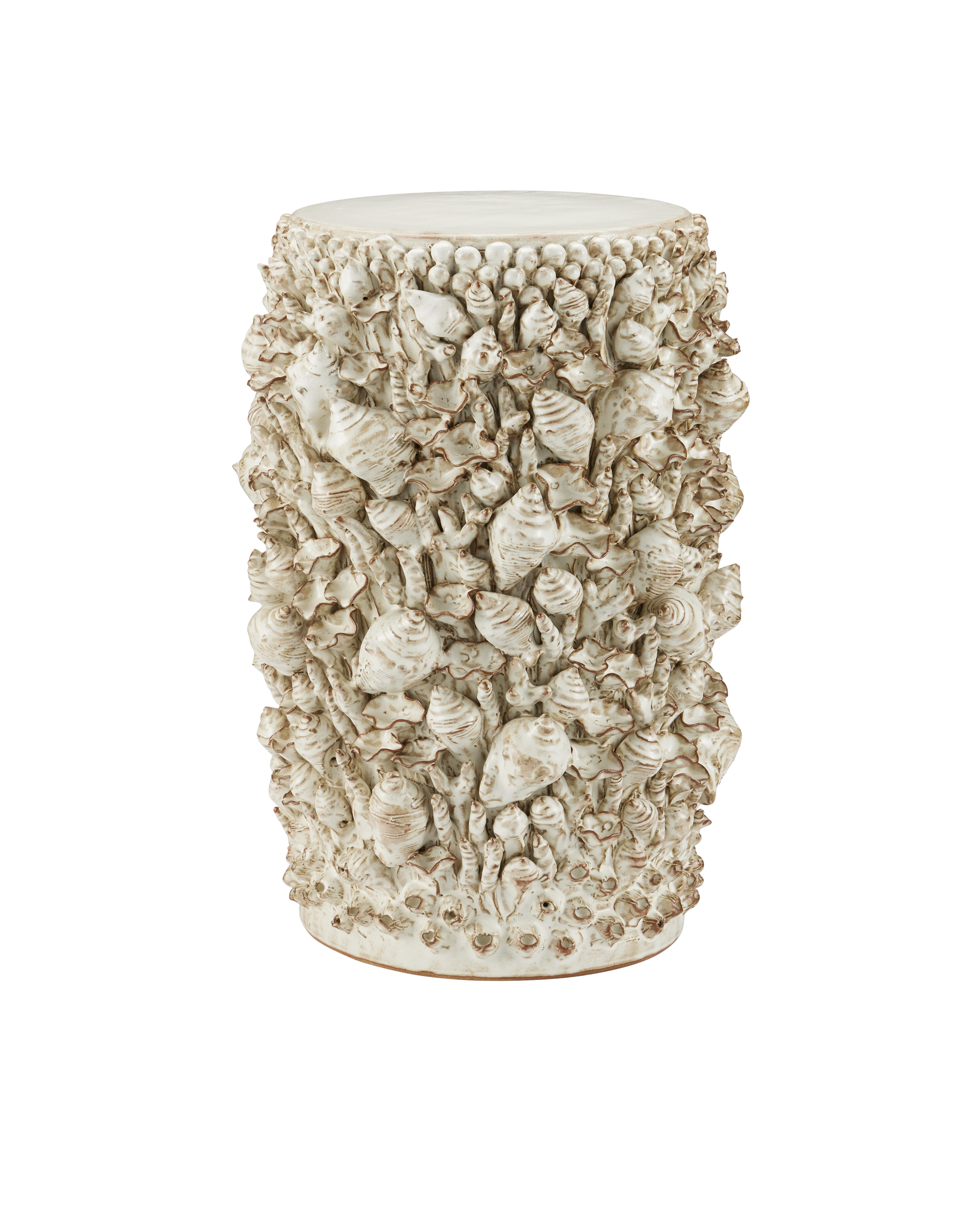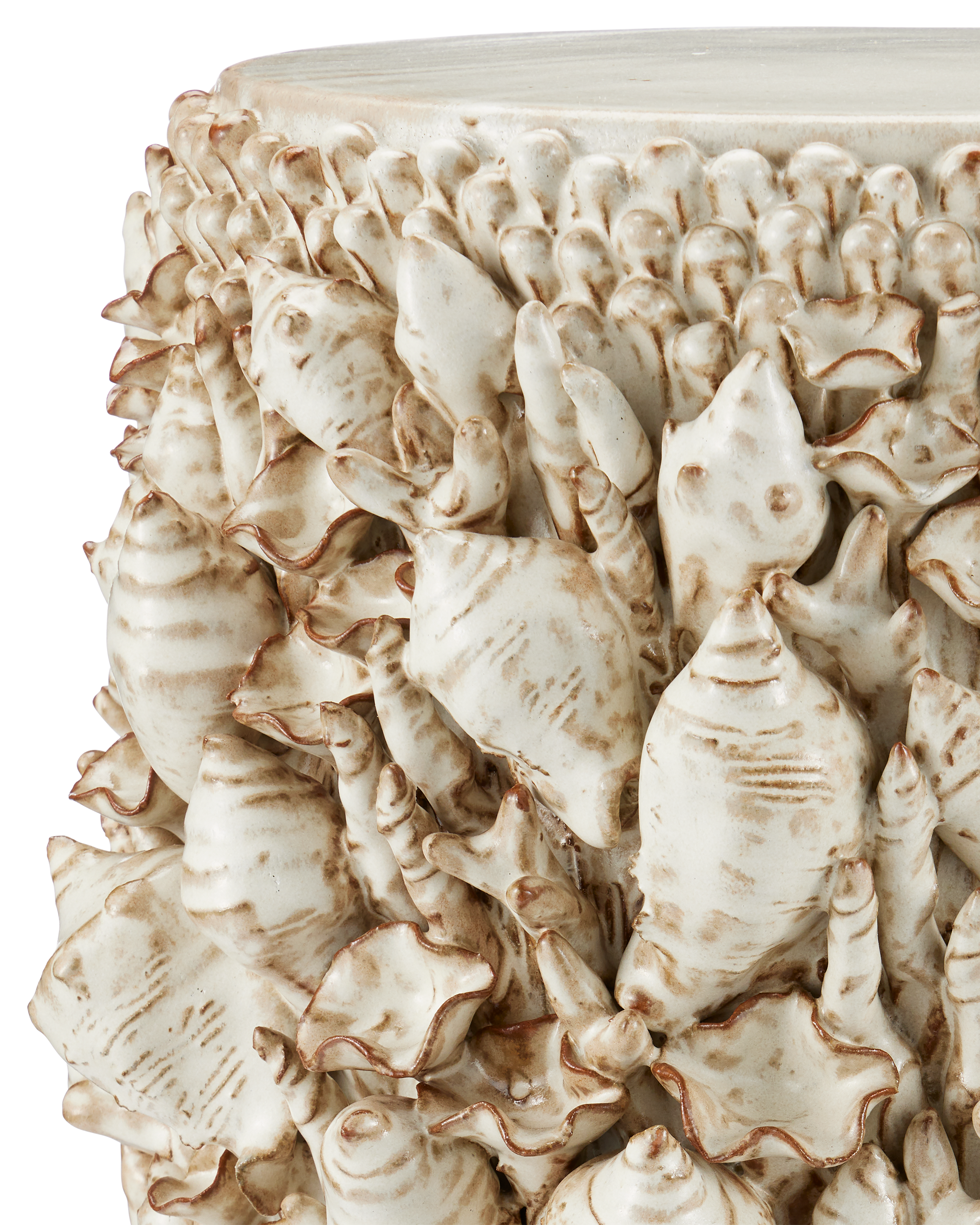 • Though the Corfu Ivory Accent Table looks as if it is covered with lovely shells, the intricate shapes are actually handmade of ceramic. The table, which is also ceramic, has a round pedestal body that is shaped before it is covered with each of the shells, one at a time, by hand. This is a painstaking process. To complete the illusion that it is covered with sea-life, the surface has barnacle shapes on its top and bottom.