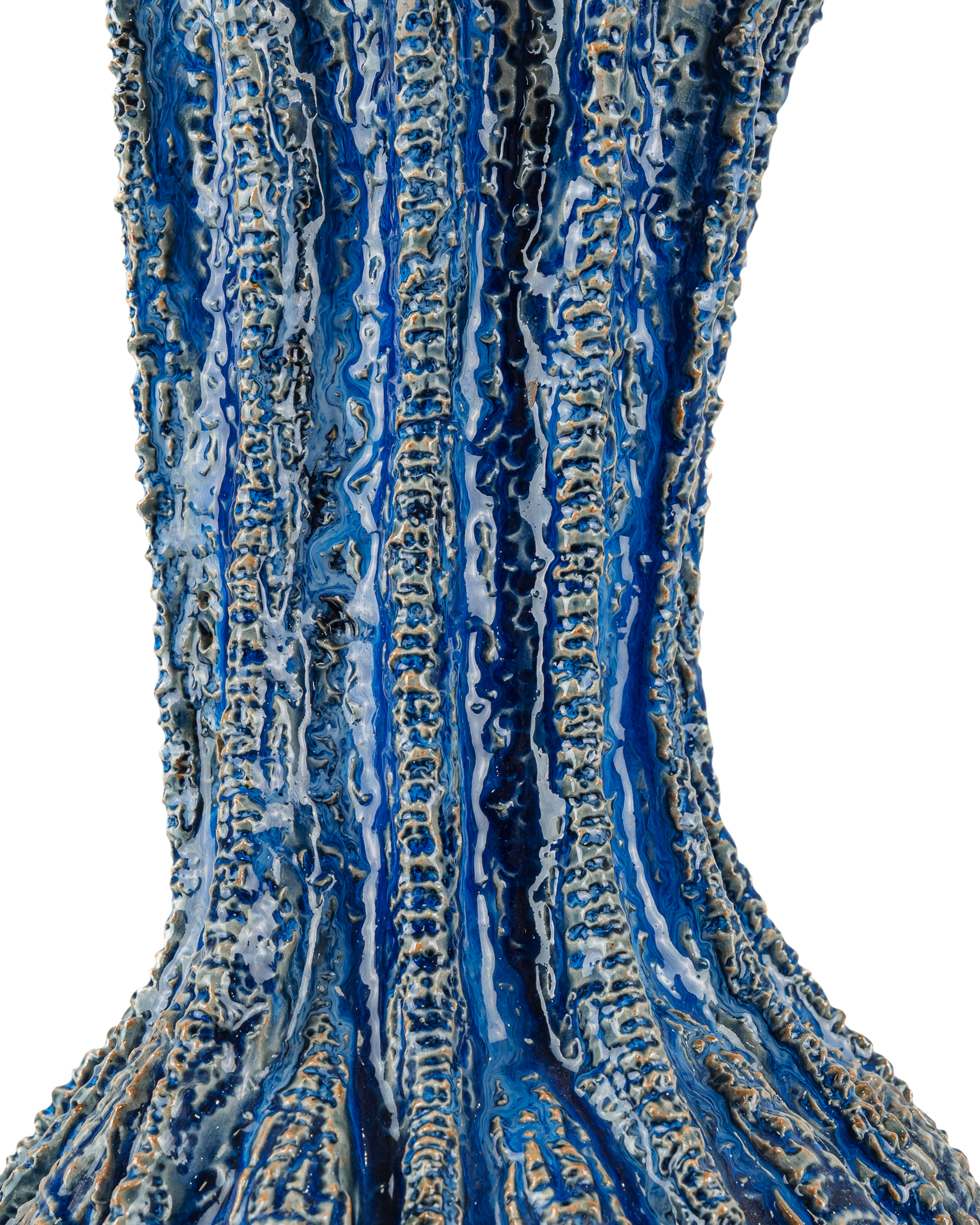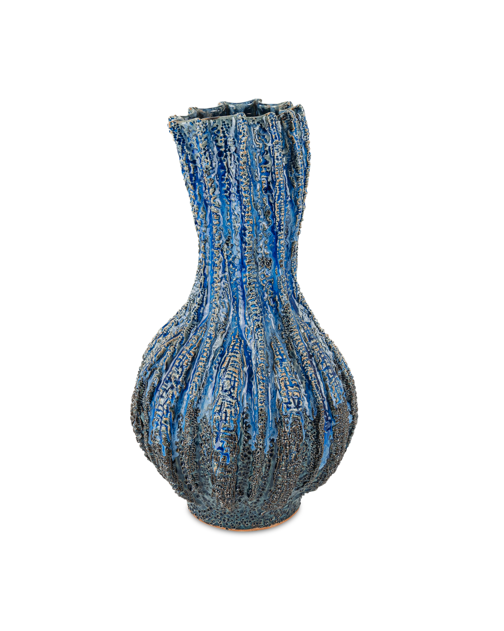 • The Folio Vase is made of dark clay ceramic with a tremendous amount of texture. Not only is each indention pressed into it by hand, the stippling on the raised portions are extremely nubby. The organically shaped vase is thrown and carved before the dark blue reactive glaze is applied, a lighter blue falling glaze accentuating the valleys to make each vessel unique. The vase stands 17 inches tall.