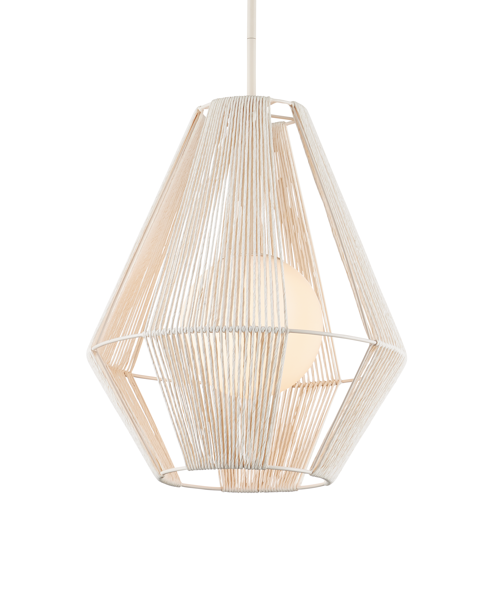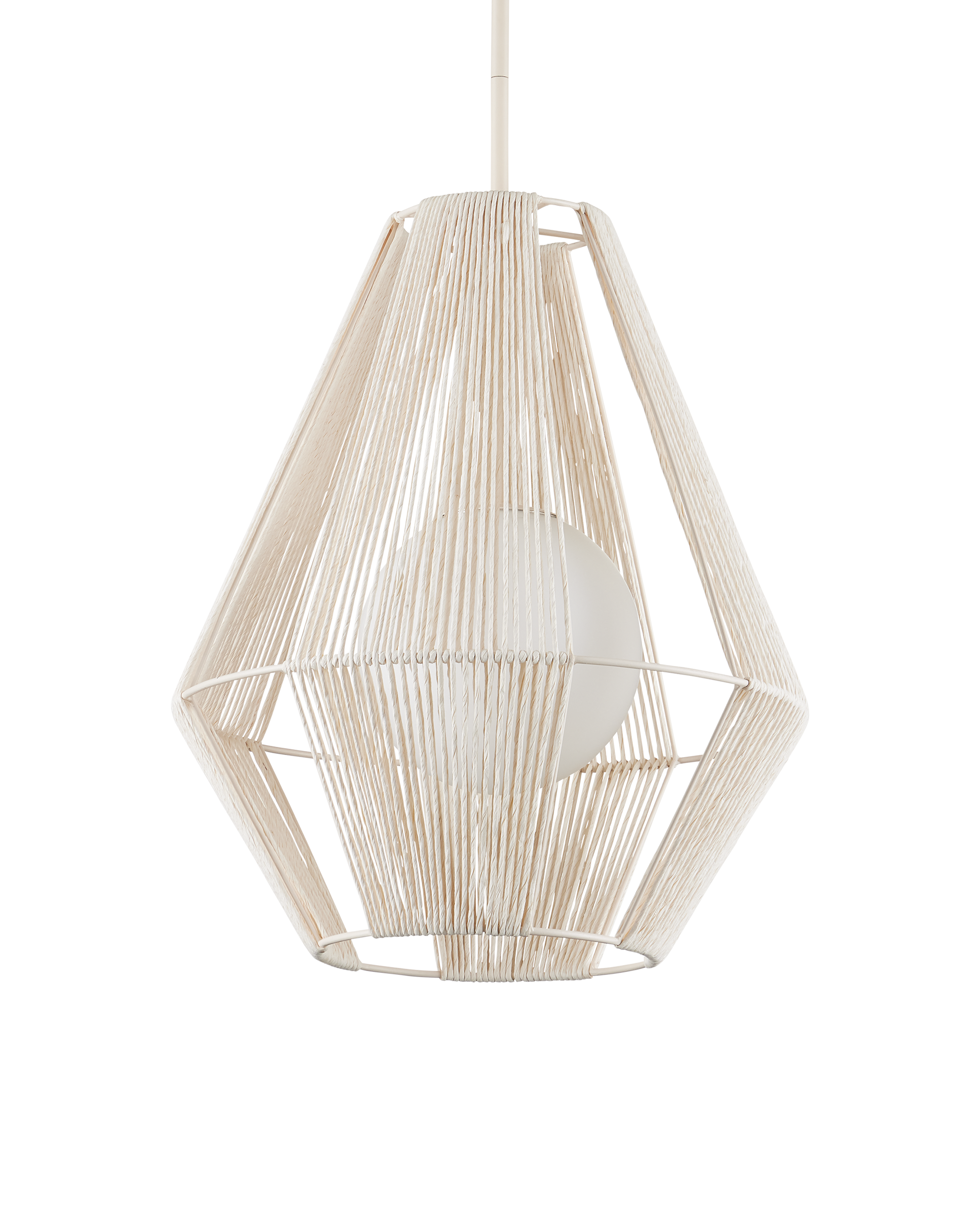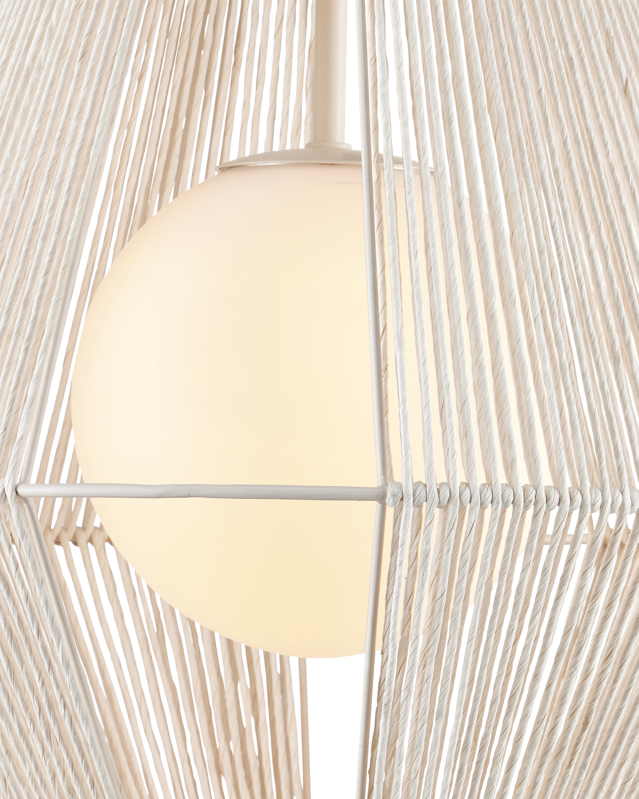 • The Fraxel Pendant has a shade made of creatively wrapped Kraft Paper twine, the shape and the macramé feel of the string bringing the beige pendant a mid-century modern feel. The twine is painstakingly double-wrapped on both the outside and the inside of the wrought iron frame in a vanilla finish. A frosted white glass globe holds the one light, which is dimmable, within the textured shade that flares to 17 inches in diameter at its widest point. Adjustable from 27.5" to 69.5" with use of included chain/rod kit/cable. If your space calls for a longer drop, additional chain/rods/cable is available for purchase.
