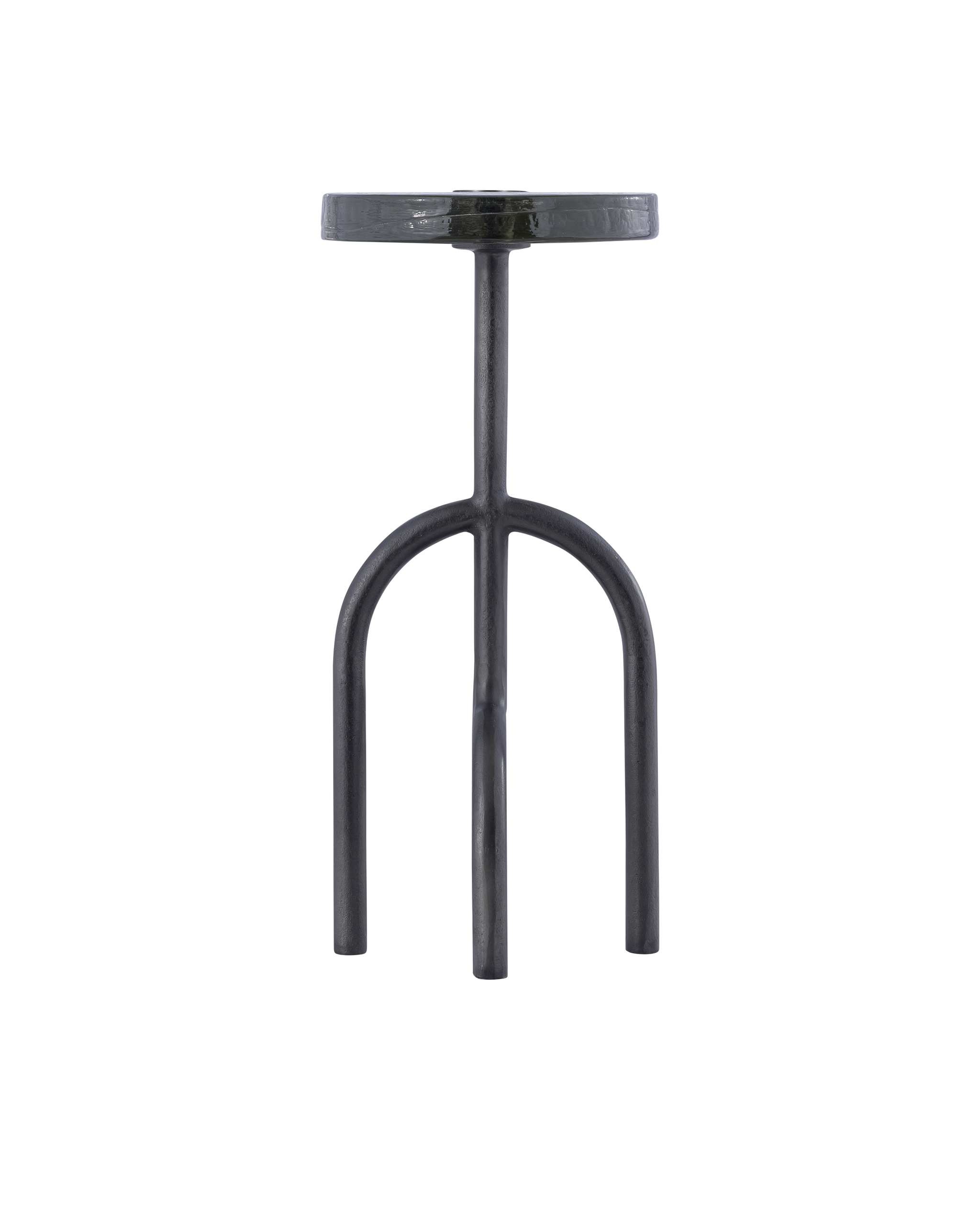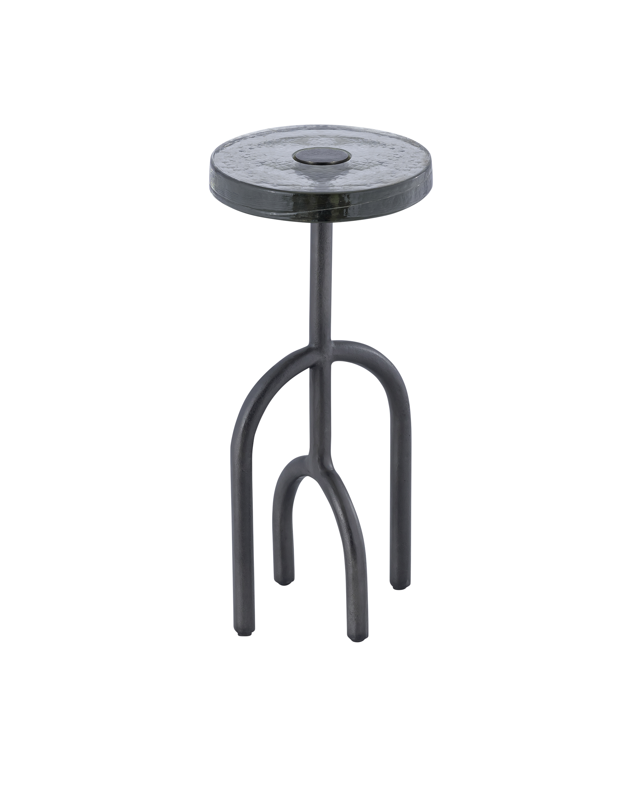 • The Grove Drinks Table has legs designed to be a clean, contemporary version of mangrove roots. The aluminum shape in a black nickel finish holds a cast glass top that is extremely artisanal given it is made by hand in a mold. This artisal effect brings this black drinks table a strong appeal for such a small piece of furniture.