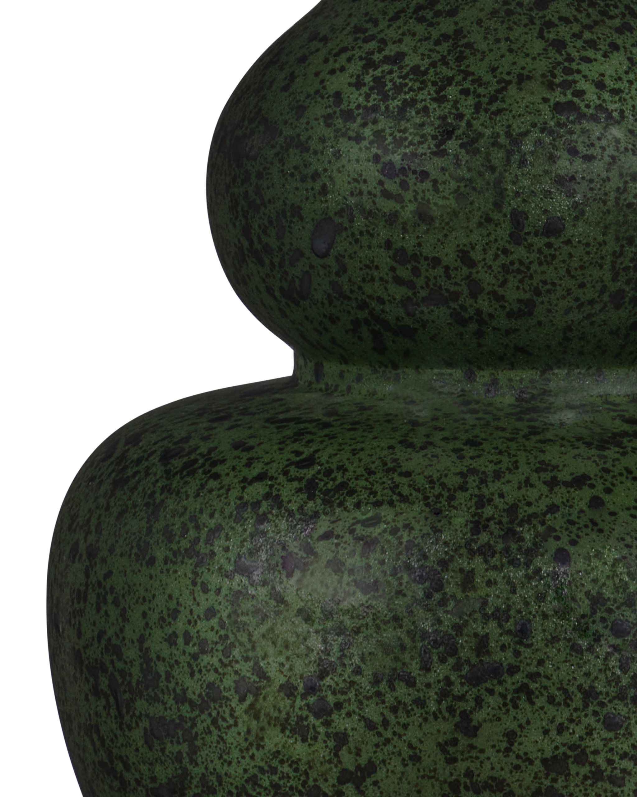 • The splatter finish on the double-gourd-shaped body of the Kinnaird Table Lamp brings the green lamp the feeling that it is artfully aged. Made of ceramic, the glazing is splashed in shades of moss green, the color carried through to the matching finial. The metal base and hardware are made of metal in an antique brass finish to complete the traditional feel of this fixture.