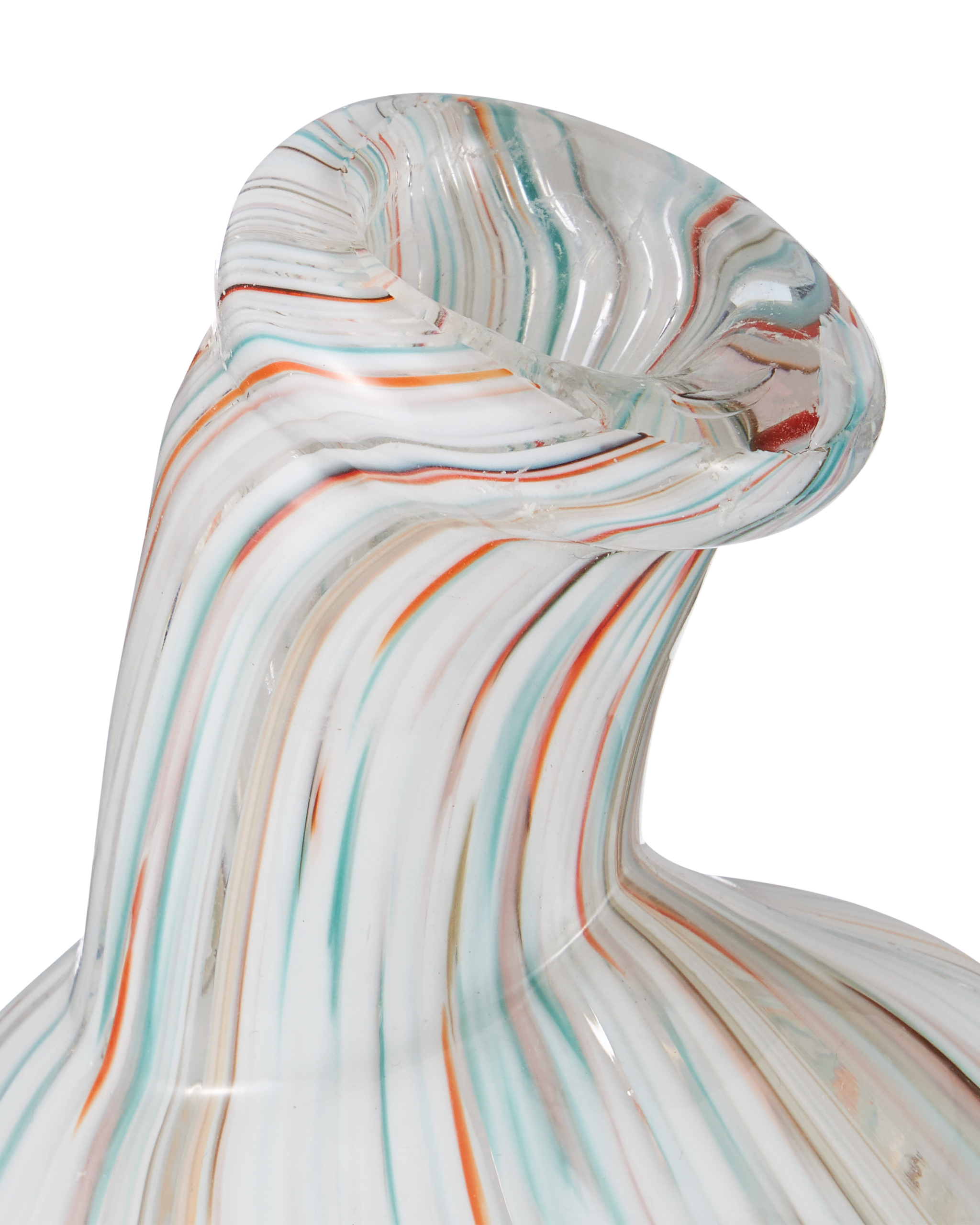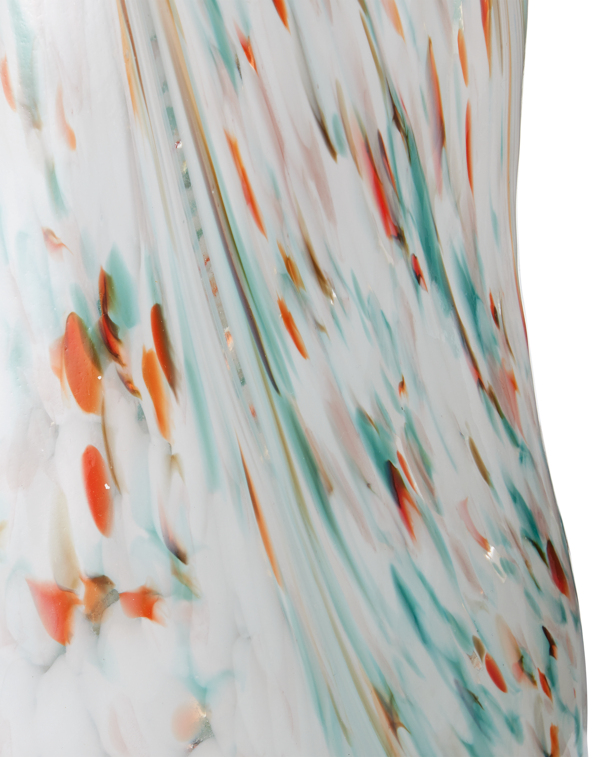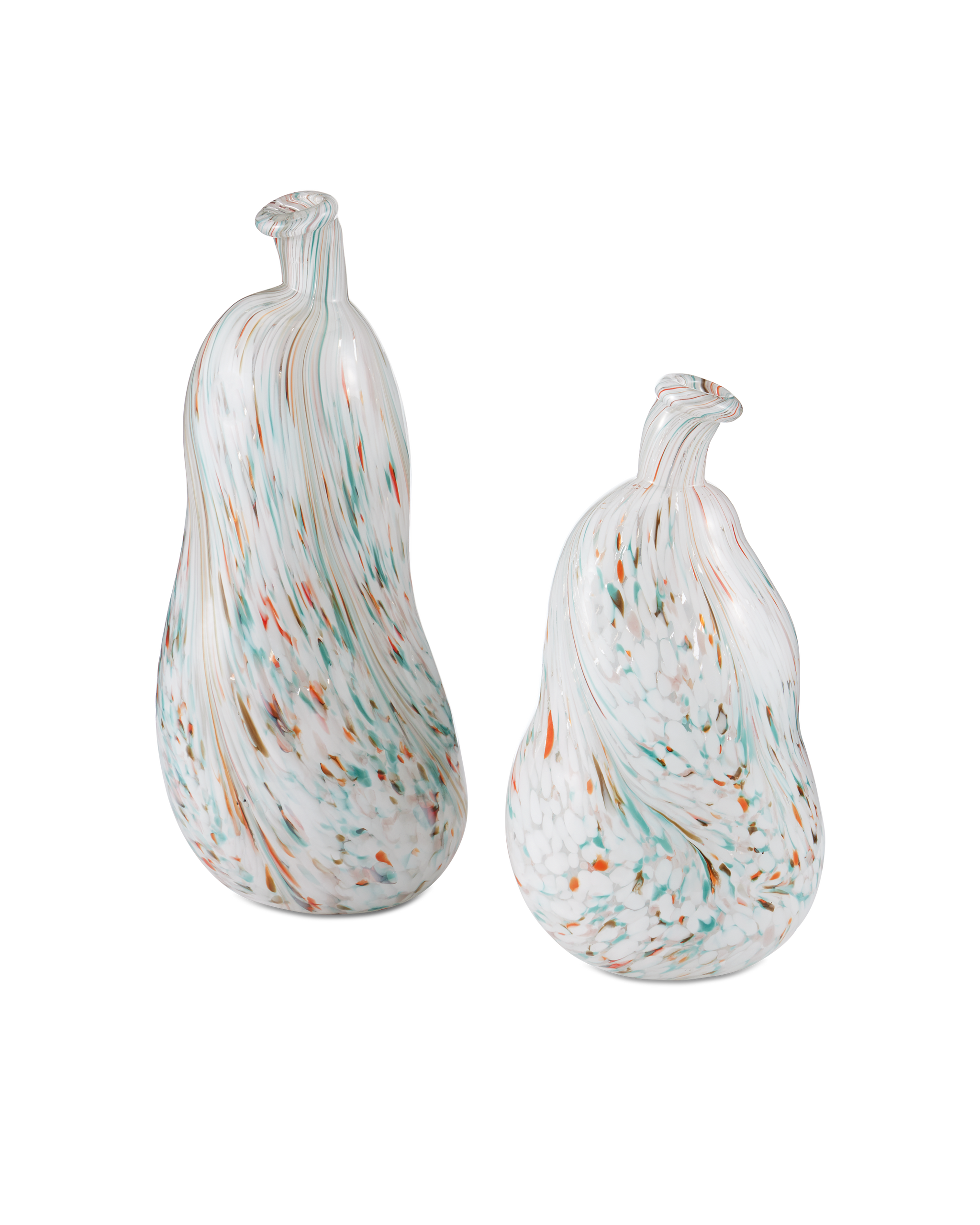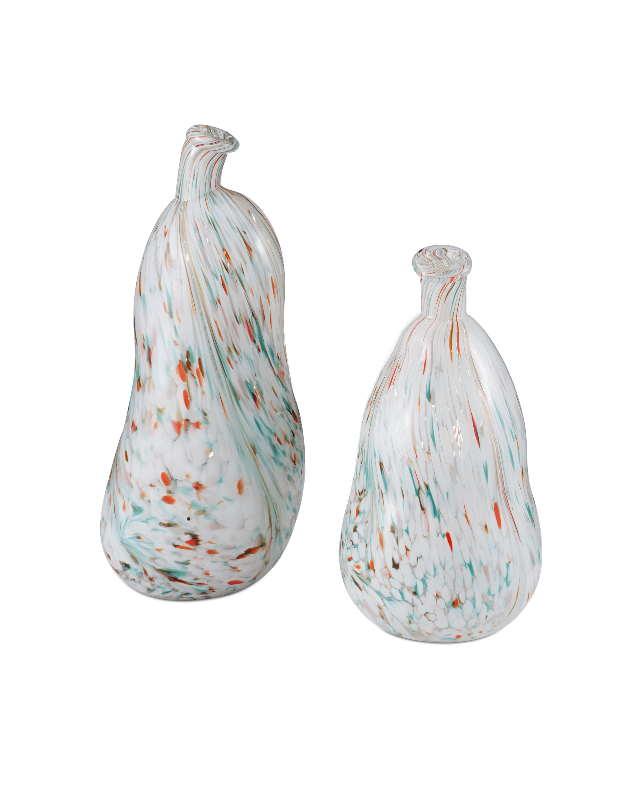 • Made of clear glass streaming with multi-colored flecks and streaks, the Kumo Vase Set includes two organically shaped vases that gleam when light strikes their surfaces. These creations are are mouth-blown to create the effect of clouds in the sky filtering points of light.