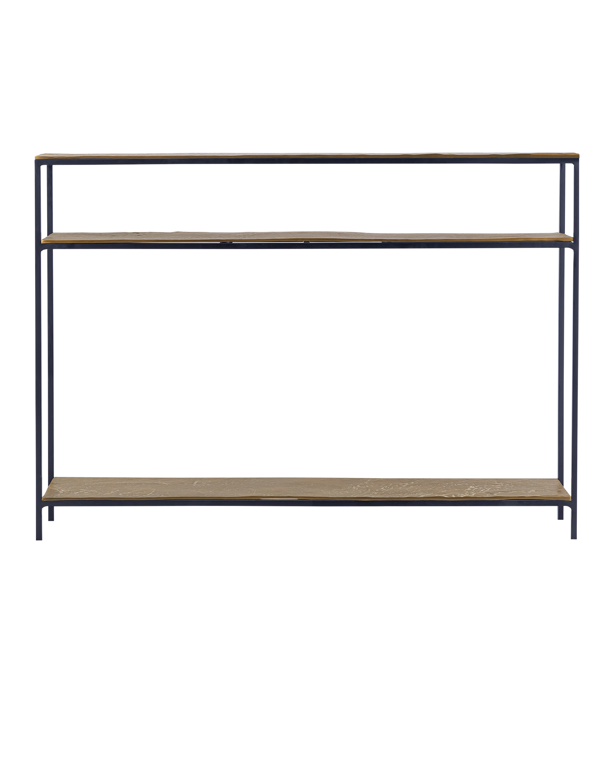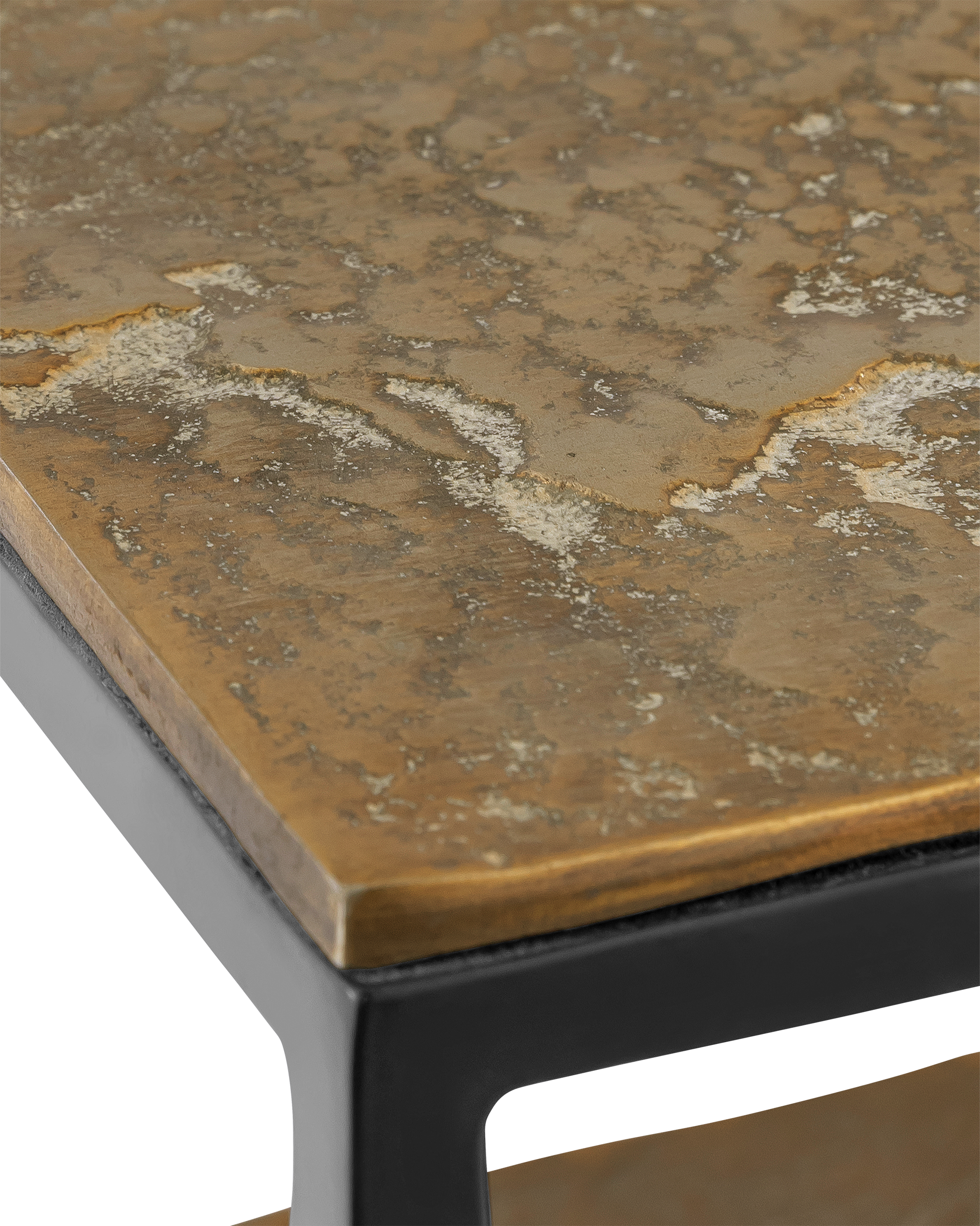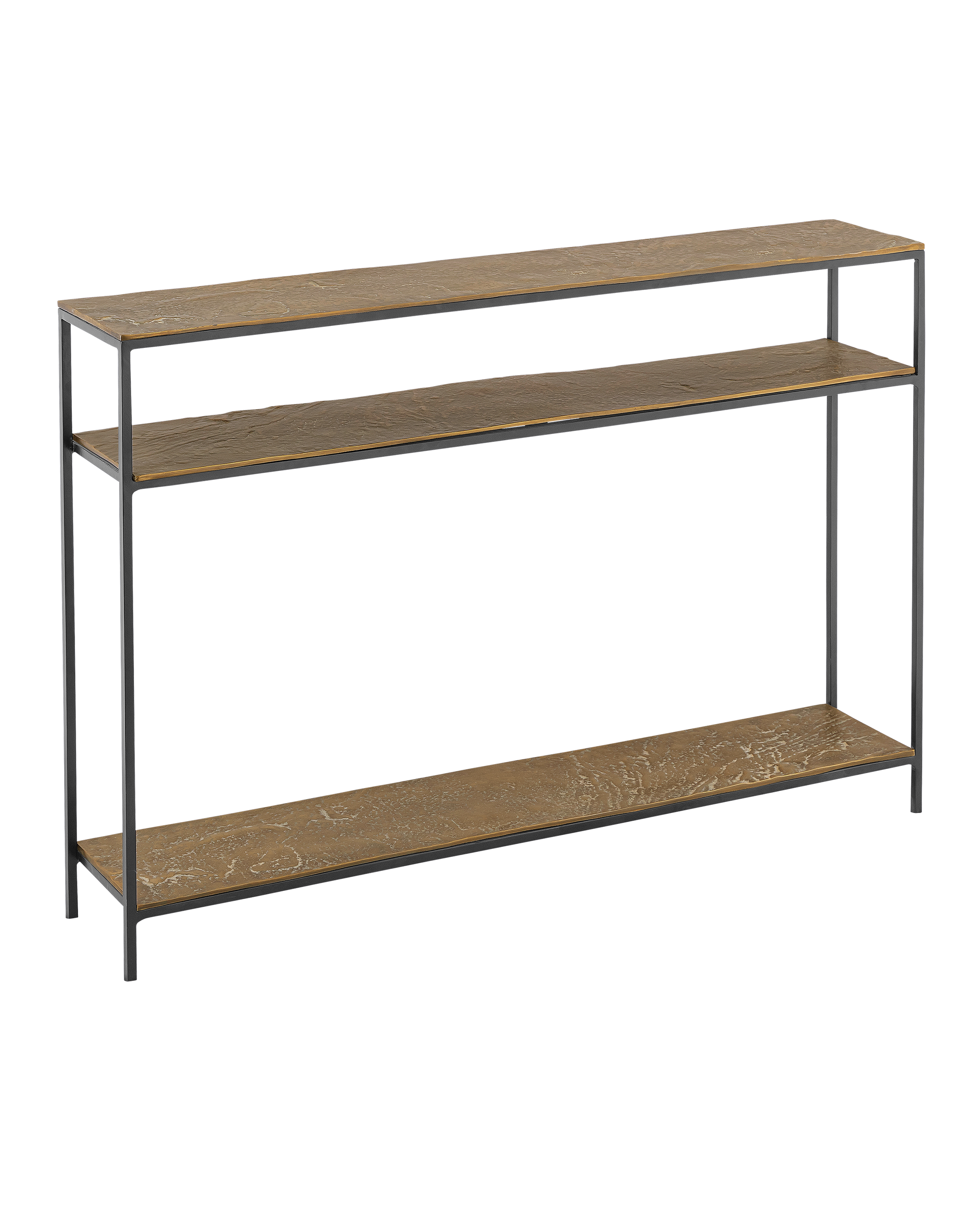 • The Lathi Brass Console Table is narrow, measuring just 8 inches deep. The table has a top and two fixed shelves made of cast aluminum in an antique brass finish supported by legs made of black-finished iron. The finish on the shelves of the gold console table has drifts in it that are similar to cerusing on wood.