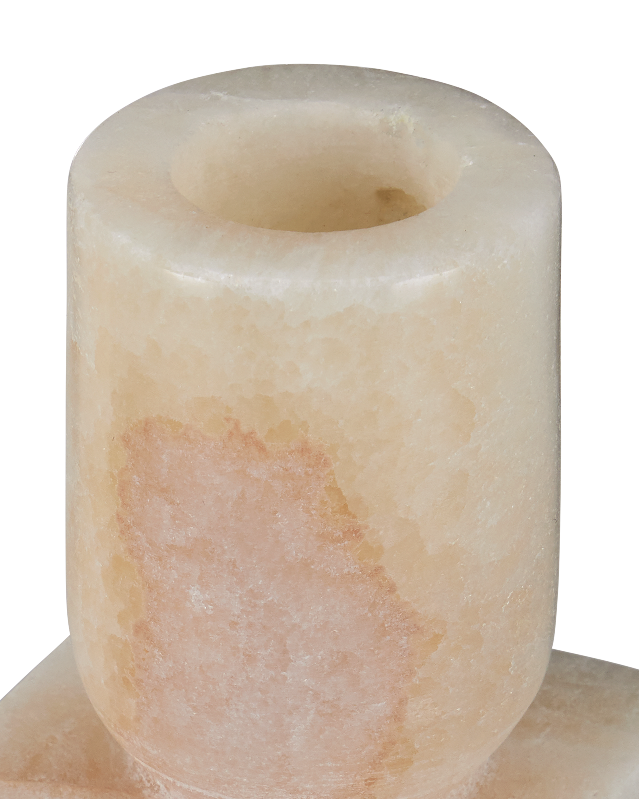 • The Lithos Ivory Candle Holder Set includes two candle holders made of a cream onyx. The geometric shapes that compose its profile are enlivened by the natural veining of the stone, making each one unique. The characteristics of this stone bring a warm peachy and cool ivory interplay to their surfaces.