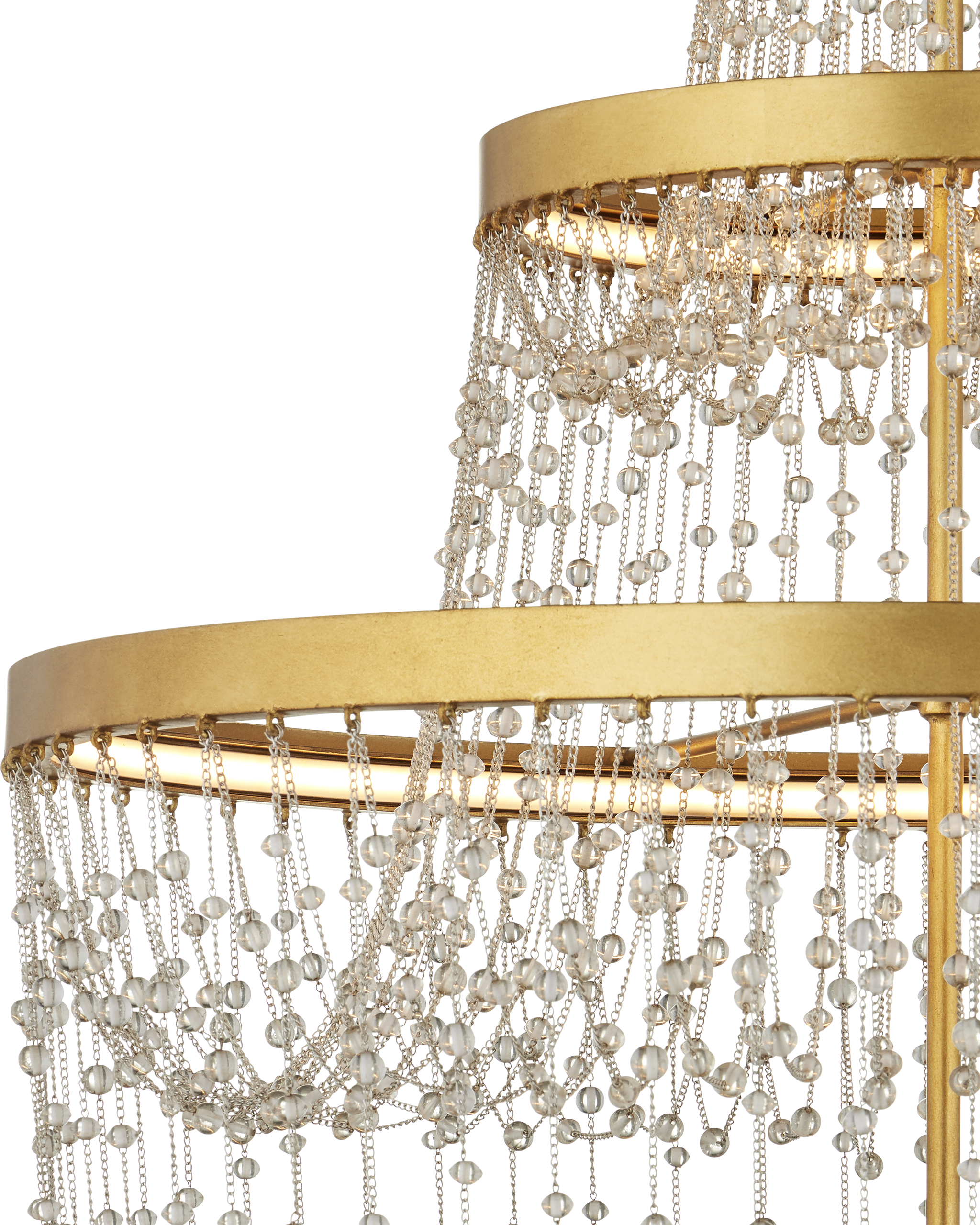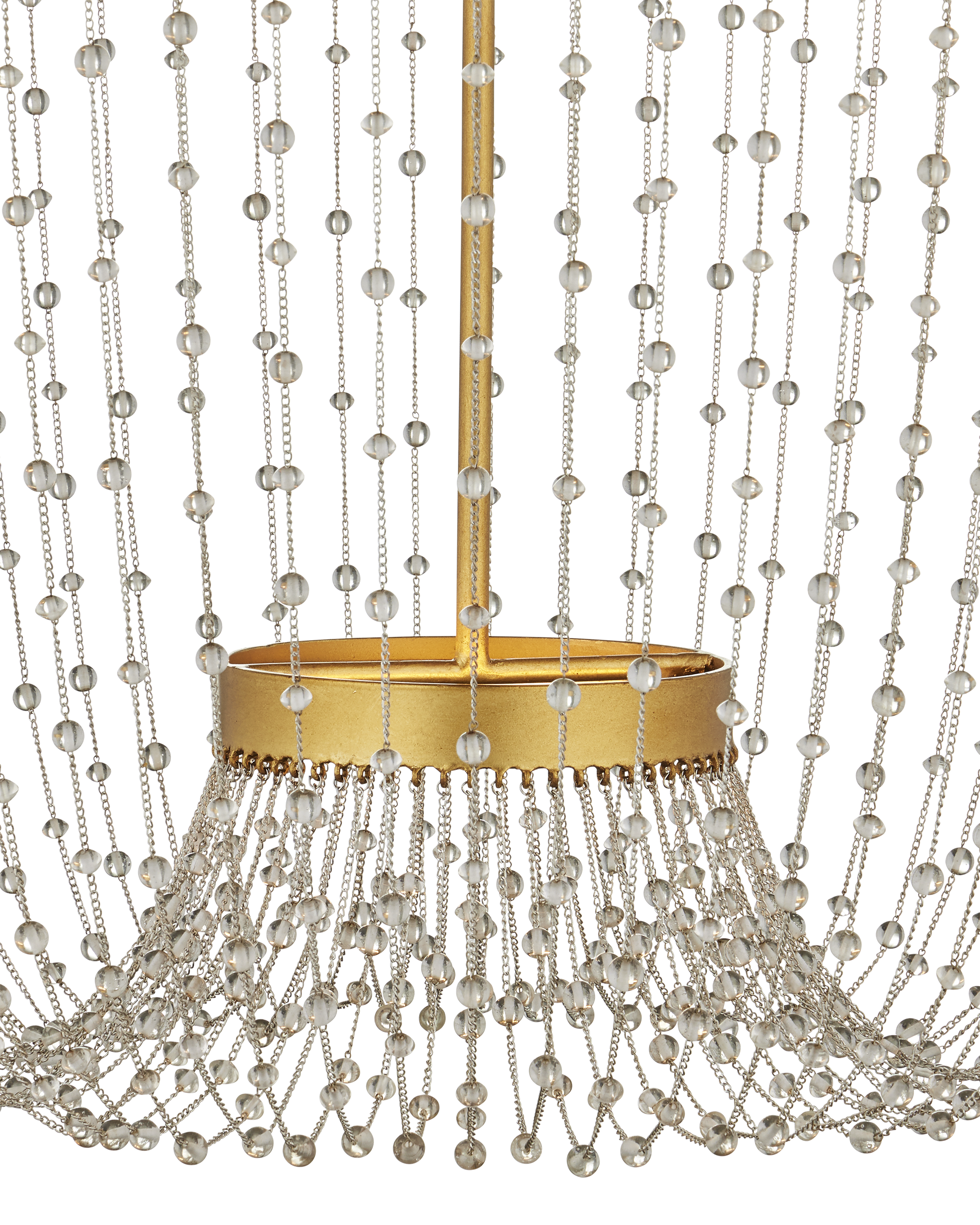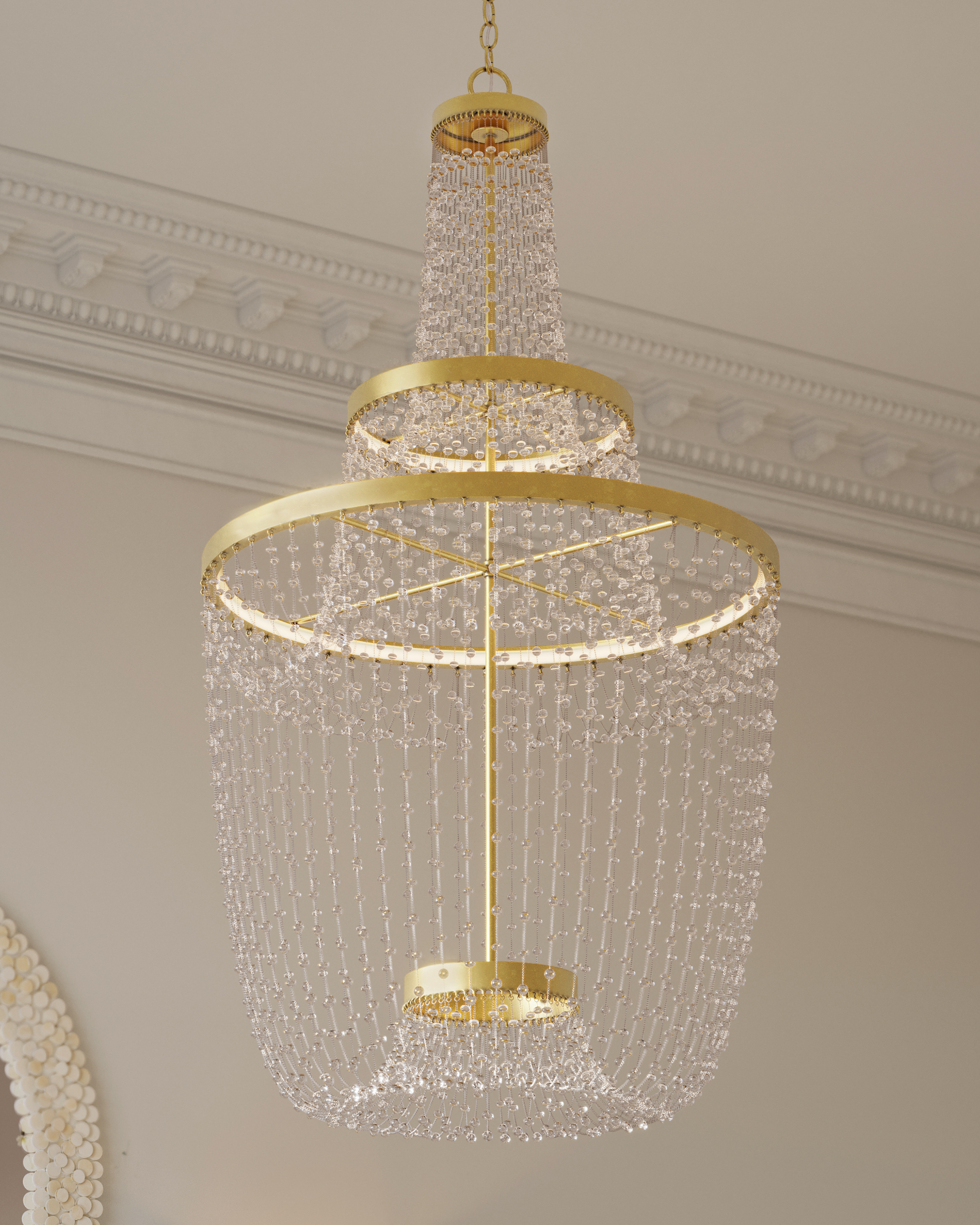 • The glamorous Mademoiselle Chandelier is luminous for a number of reasons: the glass beads that swag from brilliant contemporary gold leaf rings, the brightness of the gold, and the integrated LED strips that sit within the rings to create such a uniform glow. The way the two sizes of beads are strung creates a wonderful sense of movement. Adjustable from 61.5" to 129.5" with use of included chain/rod kit/cable. If your space calls for a longer drop, additional chain/rods/cable is available for purchase.