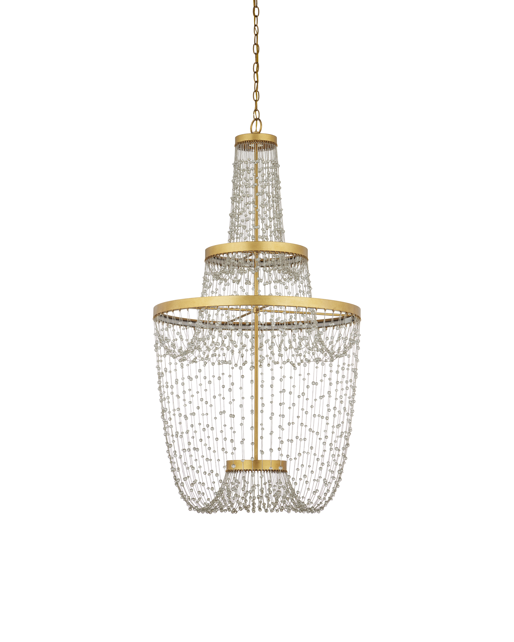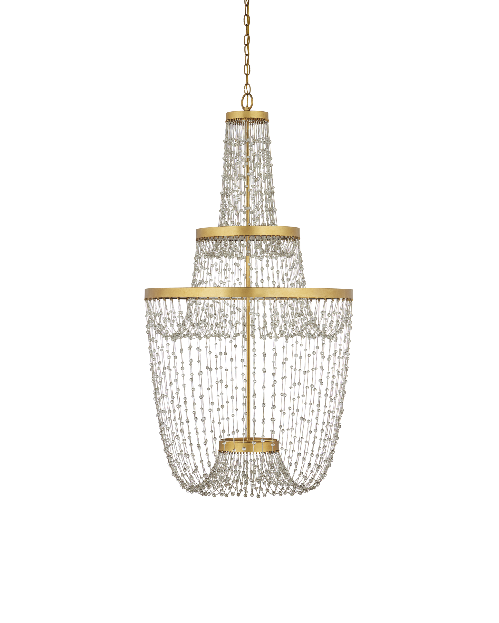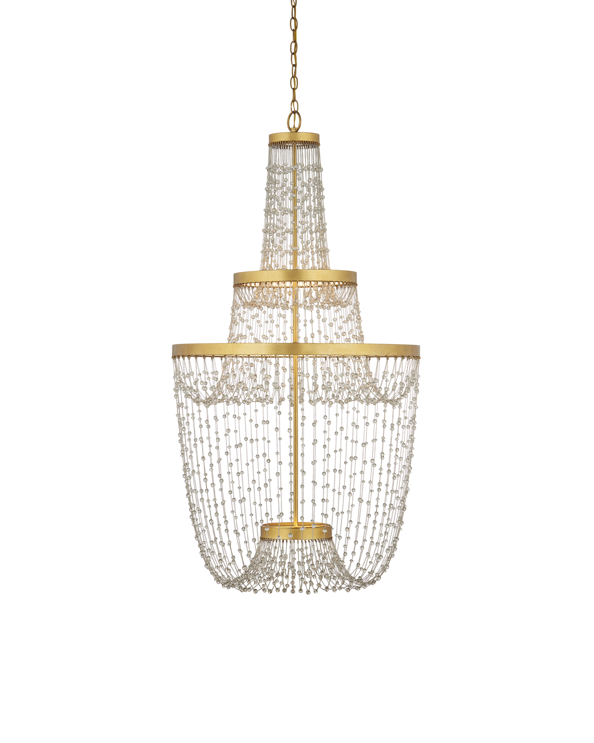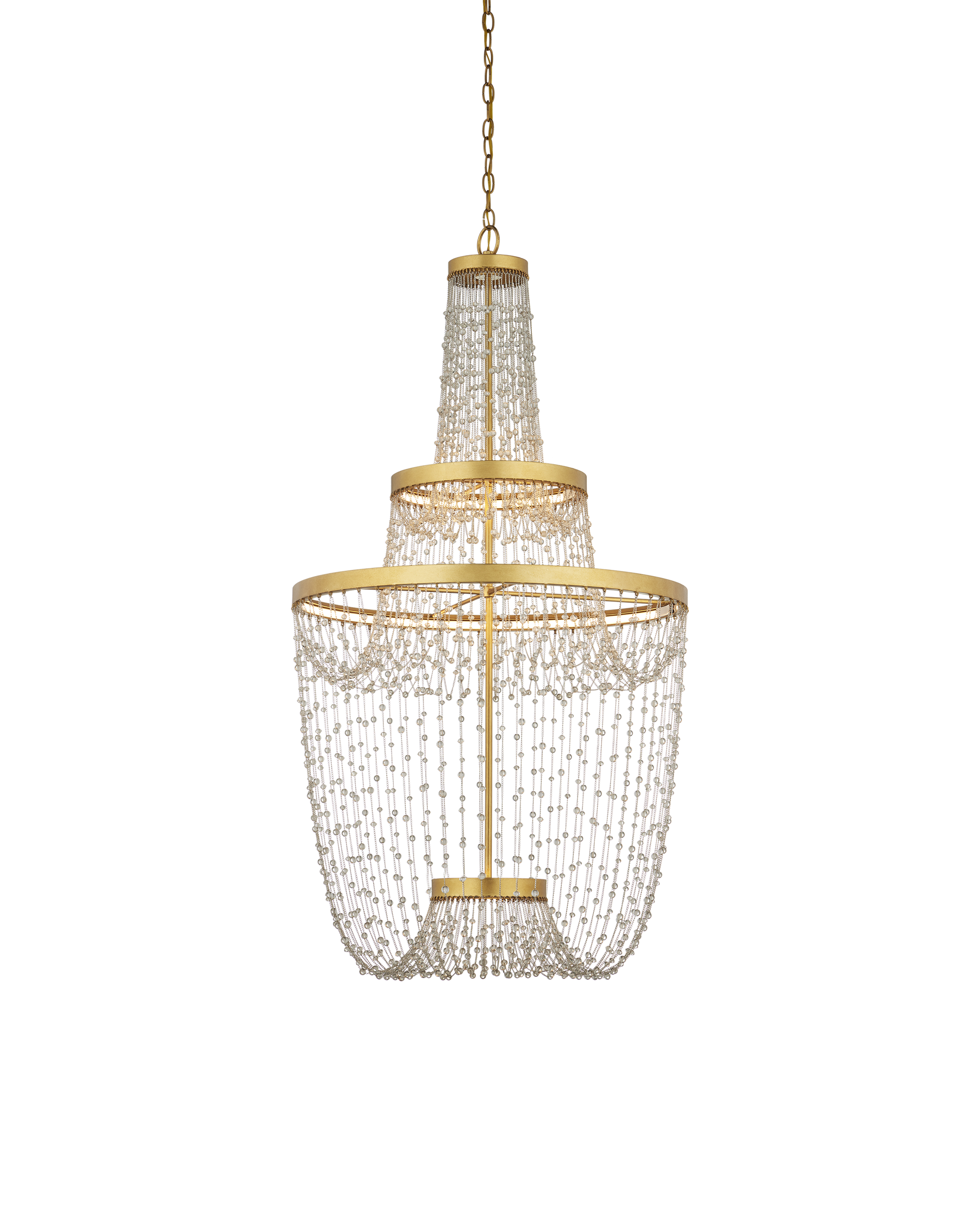 • The glamorous Mademoiselle Chandelier is luminous for a number of reasons: the glass beads that swag from brilliant contemporary gold leaf rings, the brightness of the gold, and the integrated LED strips that sit within the rings to create such a uniform glow. The way the two sizes of beads are strung creates a wonderful sense of movement. Adjustable from 61.5" to 129.5" with use of included chain/rod kit/cable. If your space calls for a longer drop, additional chain/rods/cable is available for purchase.