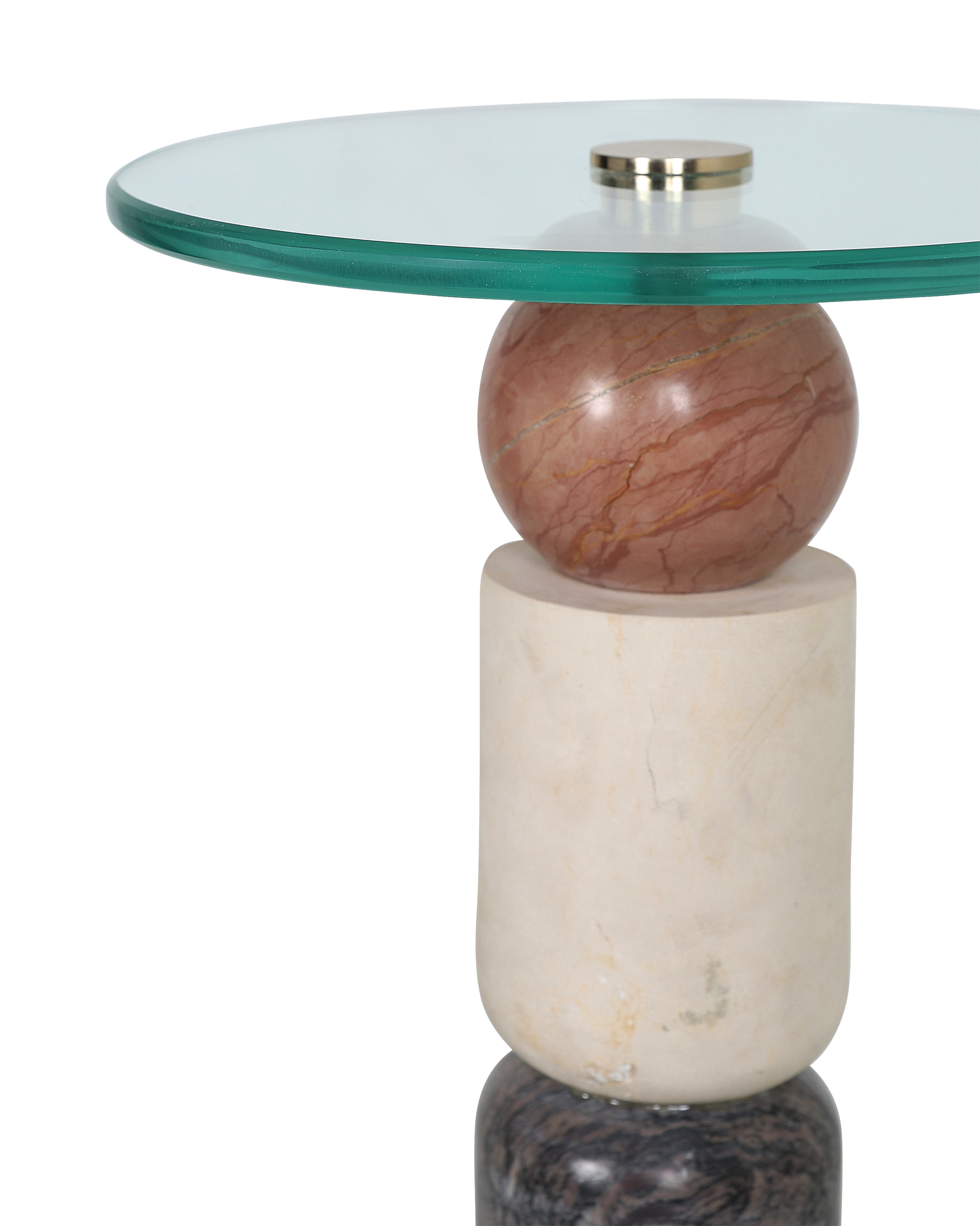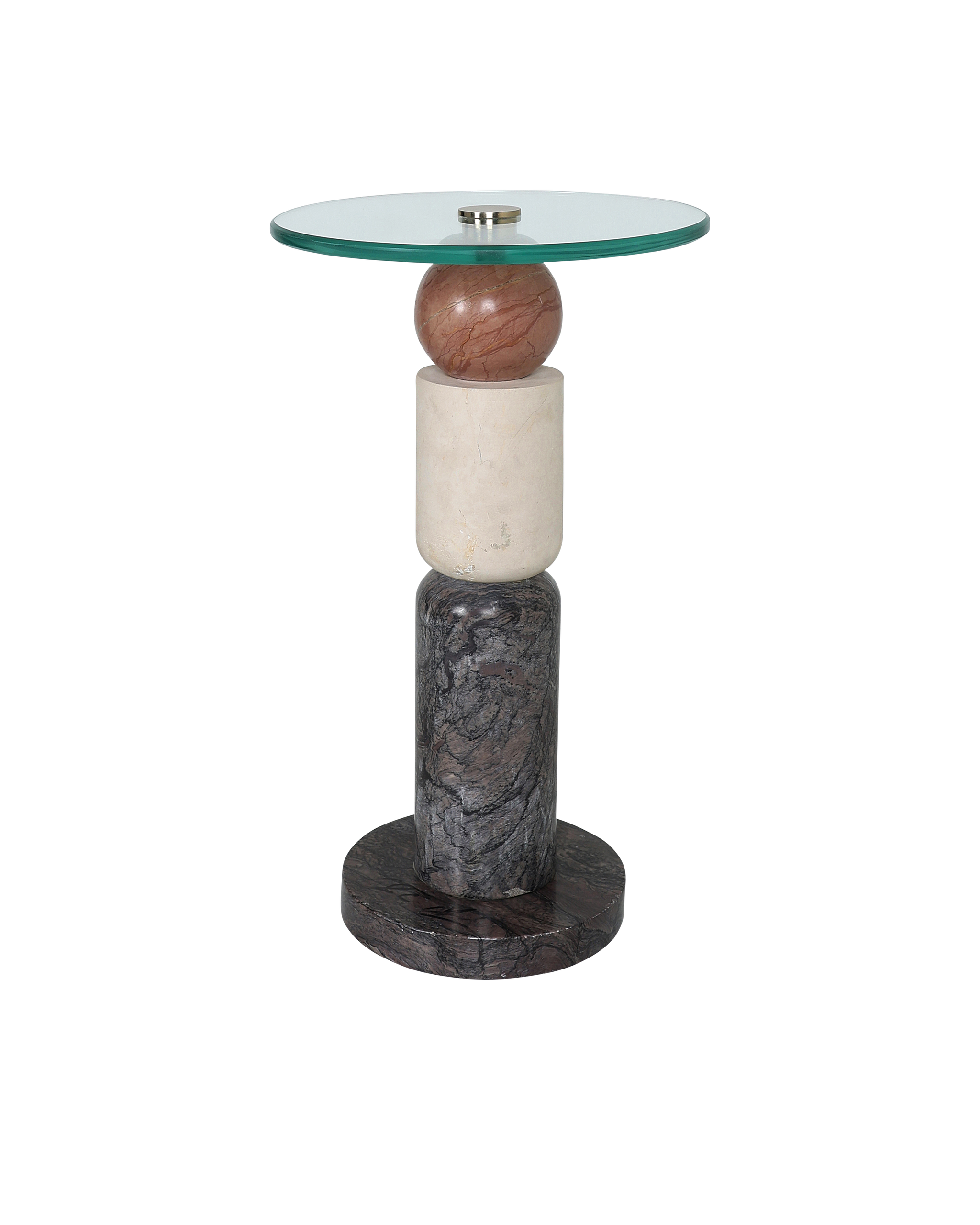 • The Moreno Drinks Table is made of Rosa Cappuccino Marble, Camello Neve Marble, and Breccia Marble. The geometric sculptural piece has tremendous personality because of the veining of the marbles. The surfaces of the table will vary from piece to piece given it is made of natural stone. The Moreno has a glass top with double bevels.