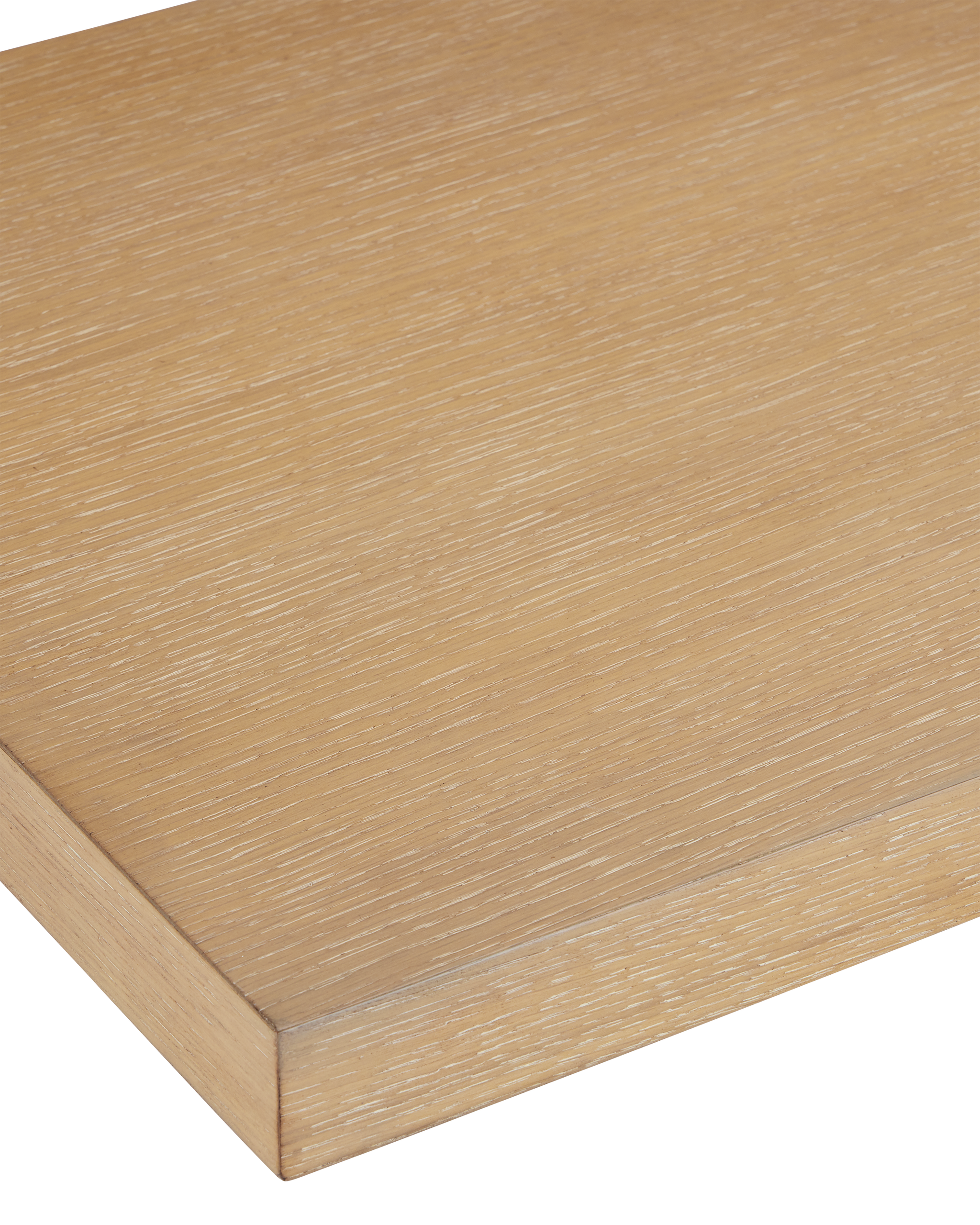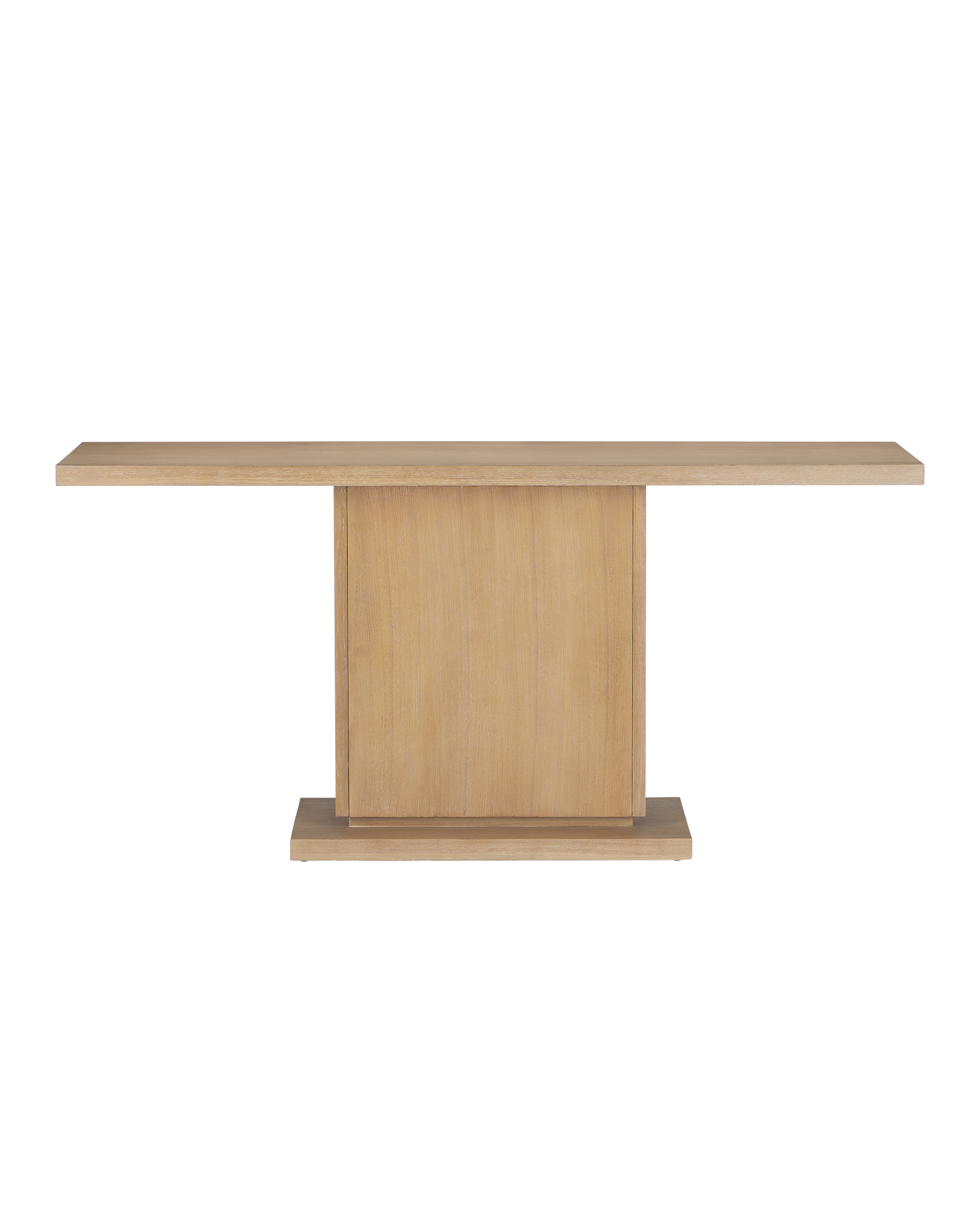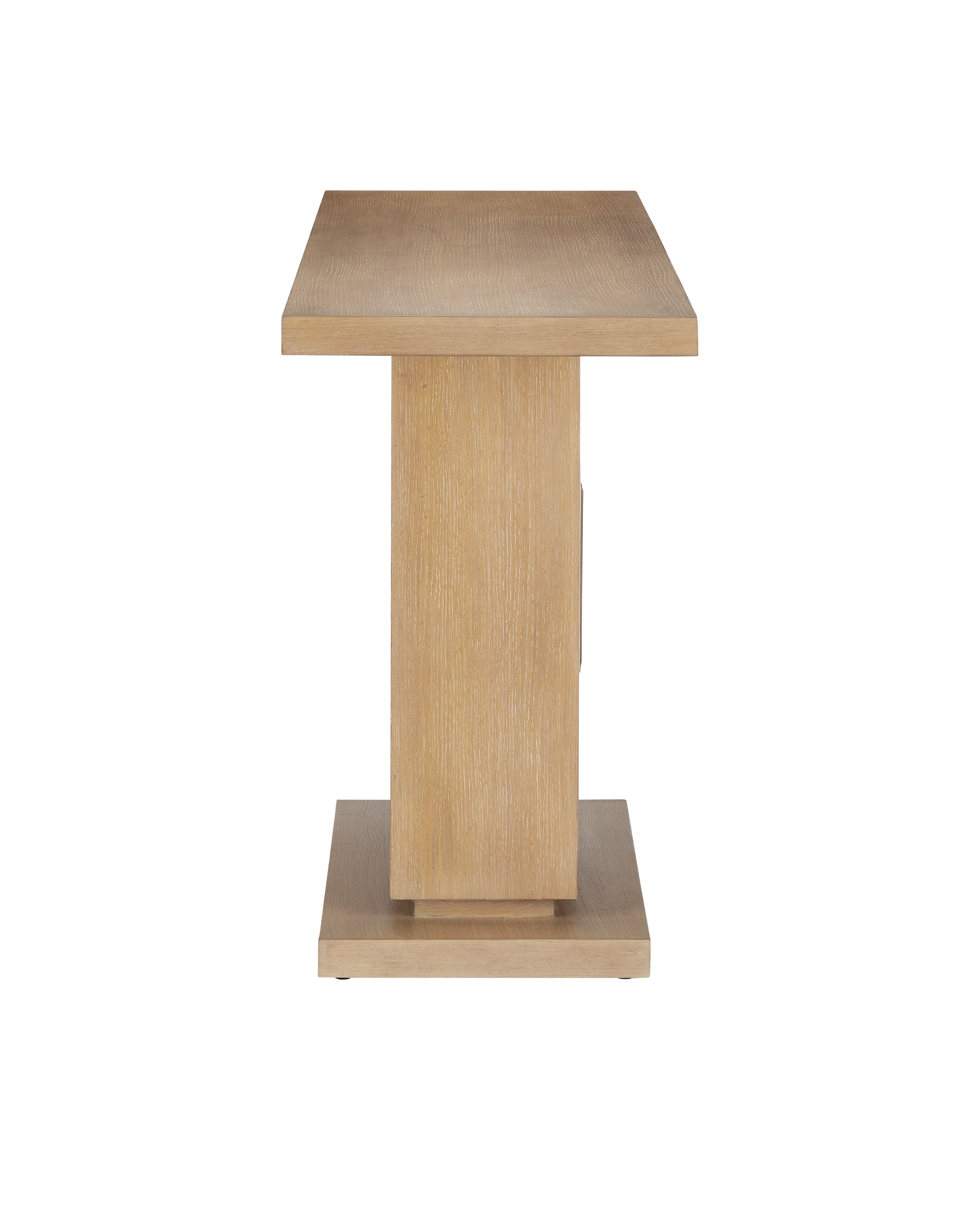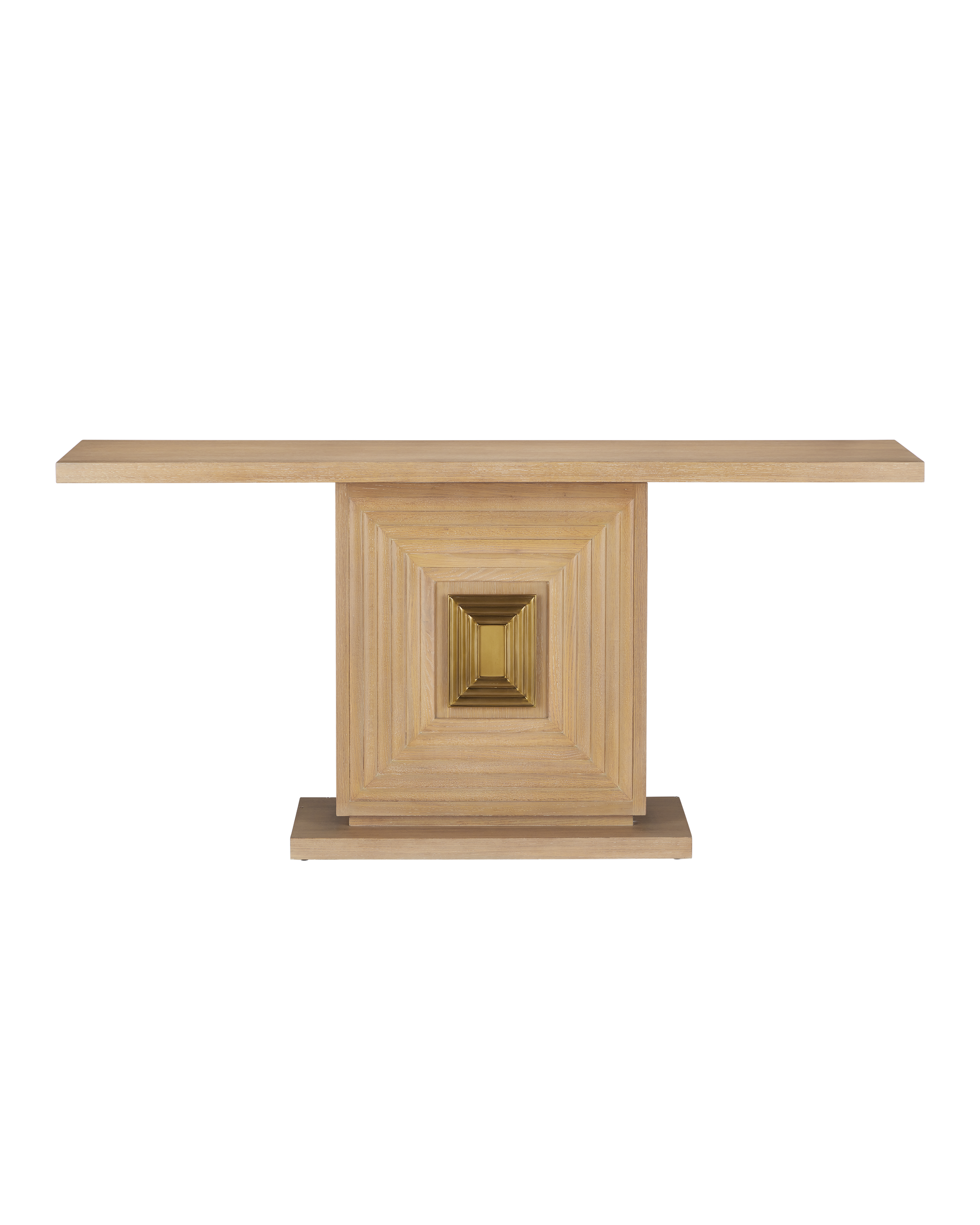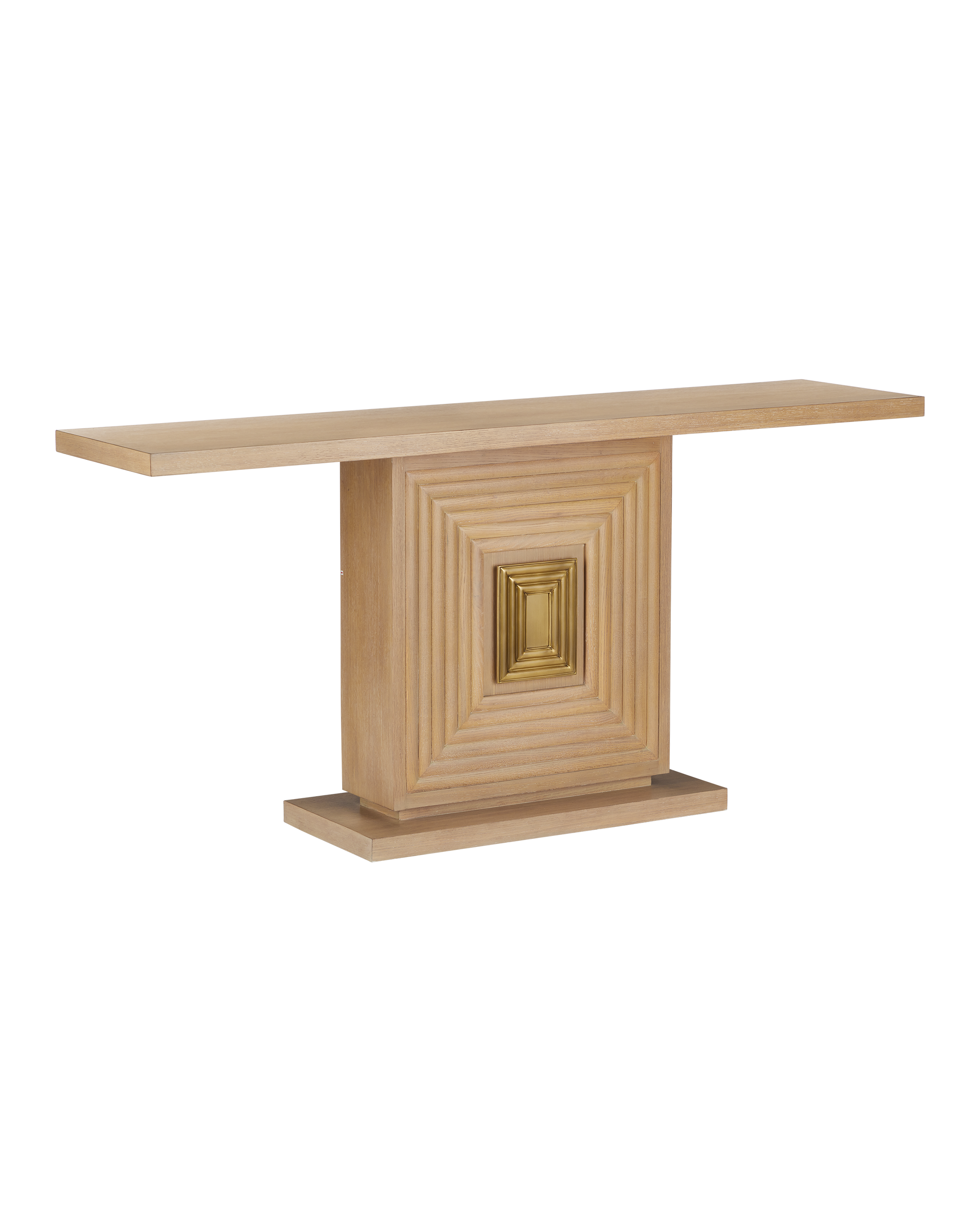 • The finish on the Morombe Washed Oak Console Table highlights the carved patterns of natural wood that form embedded squares in a geometric illusion of depth. Placed in the middle of the pattern is a decorative brass medallion. This is a large console, perfect for a grand entryway or a prominent wall in a great room.