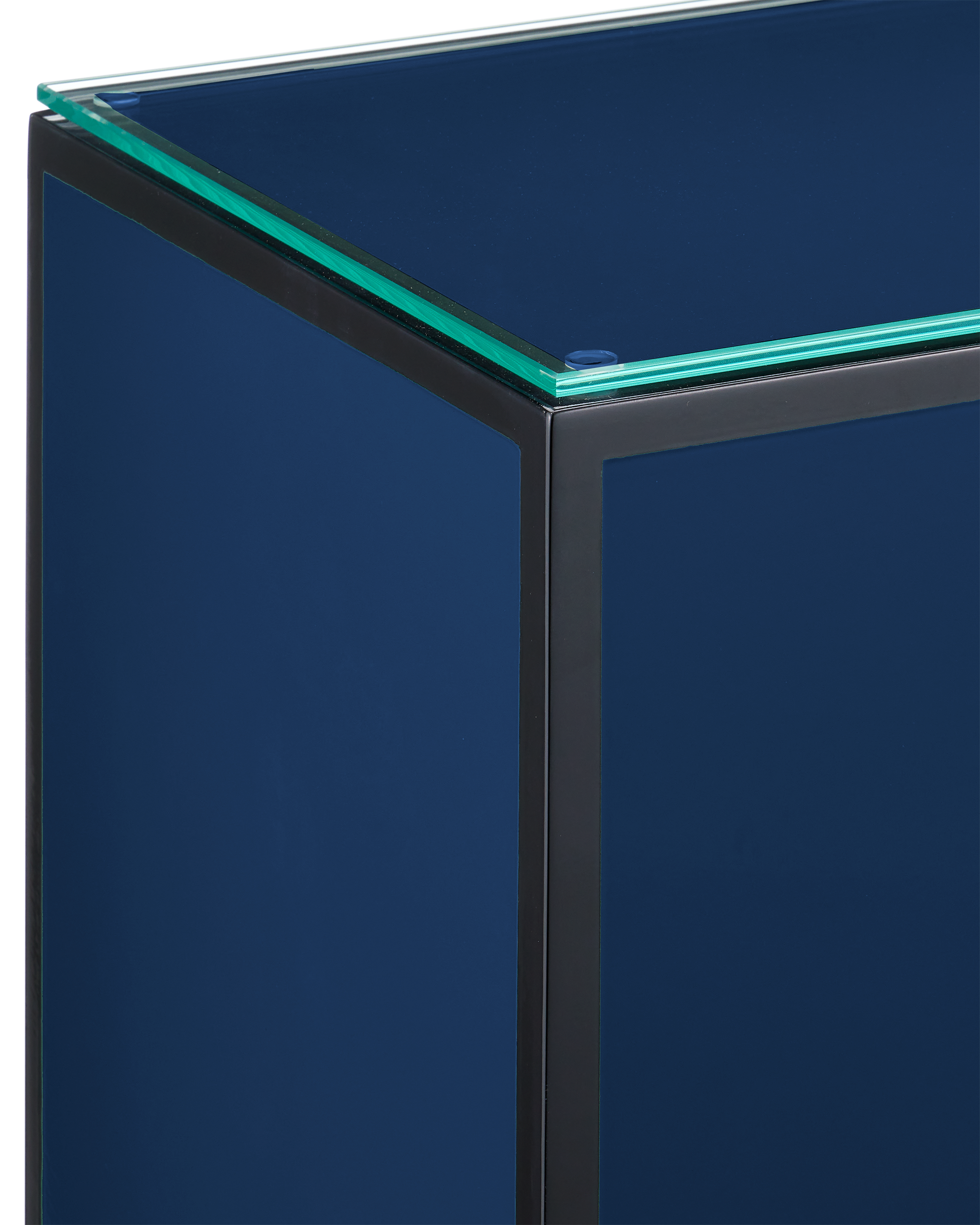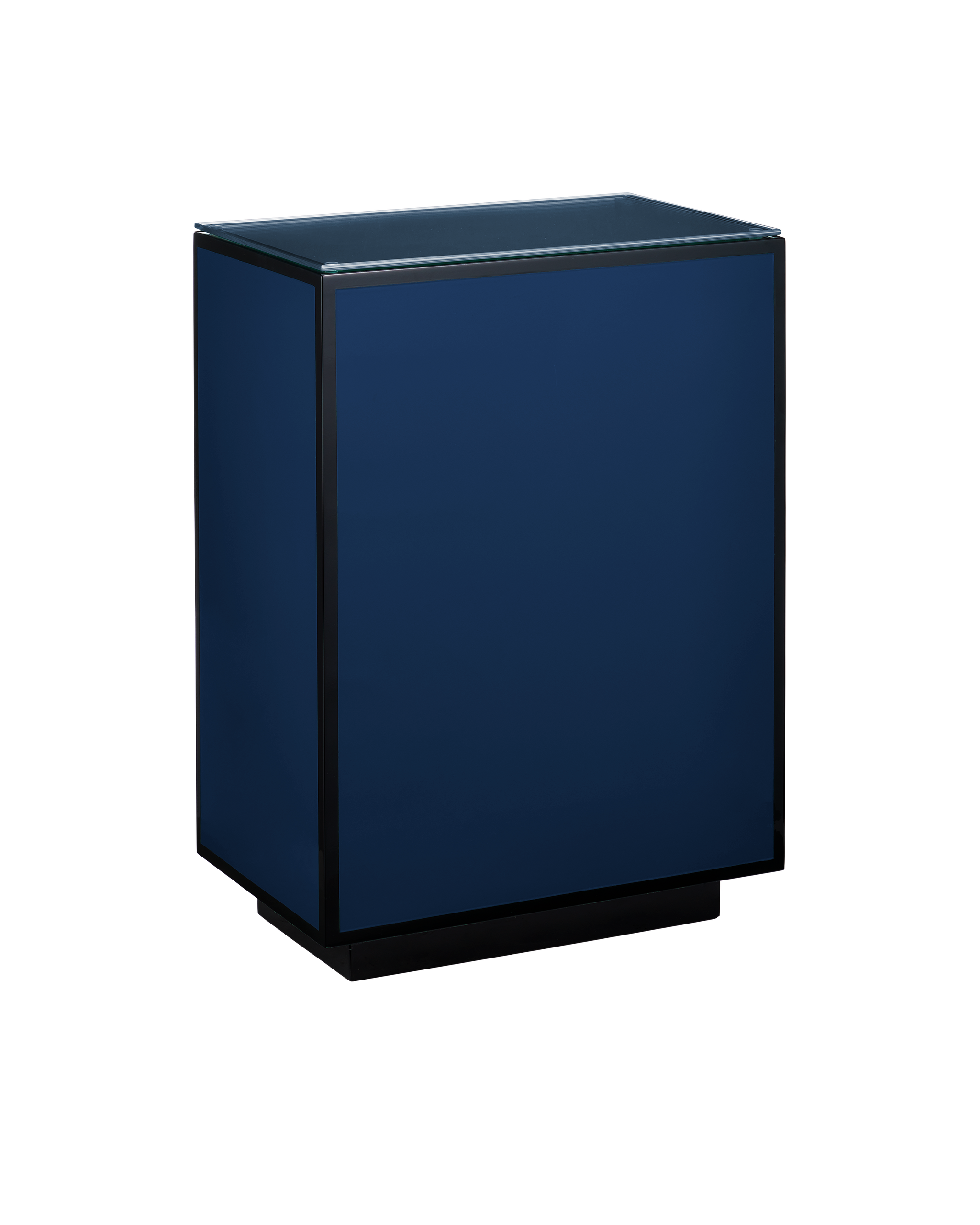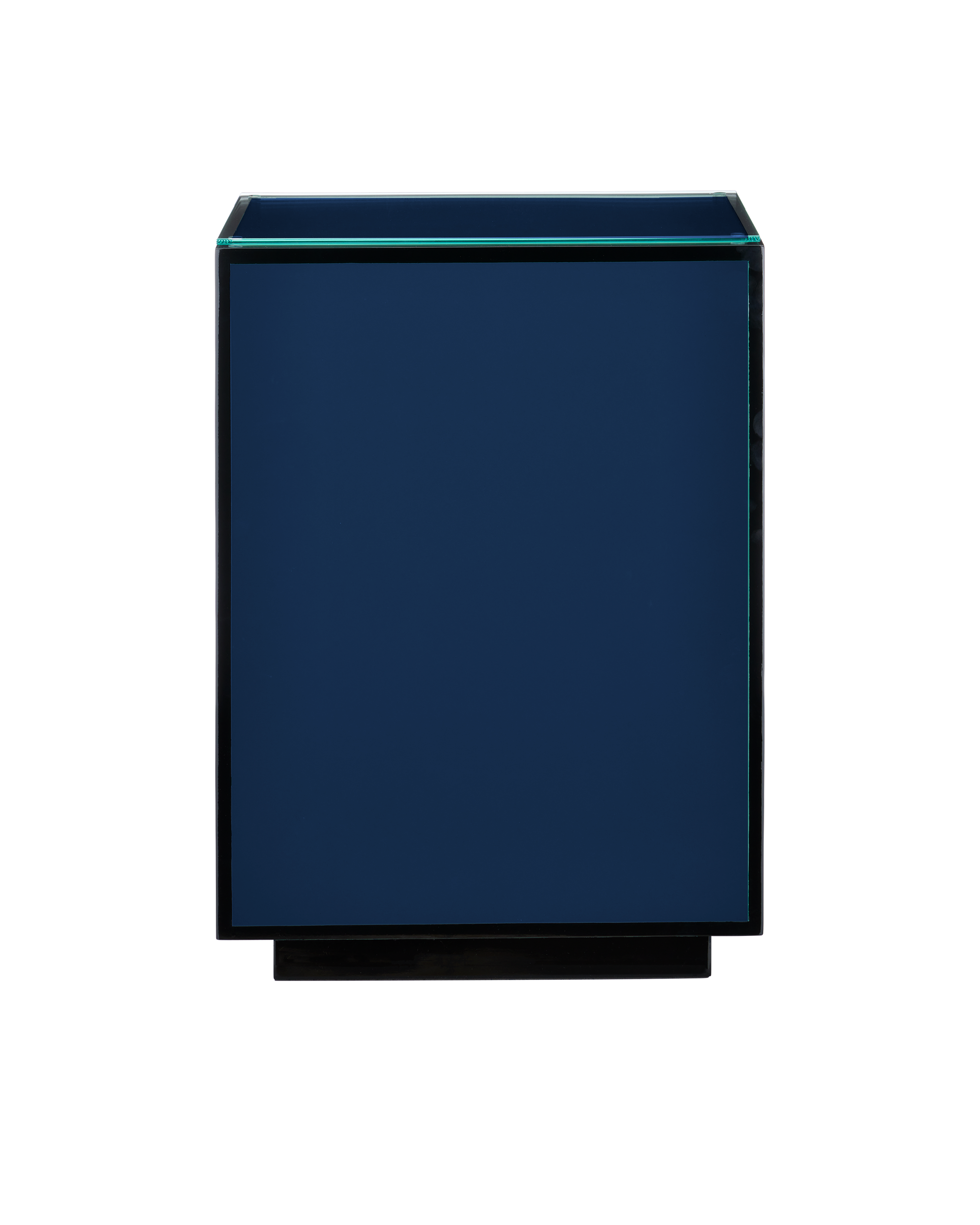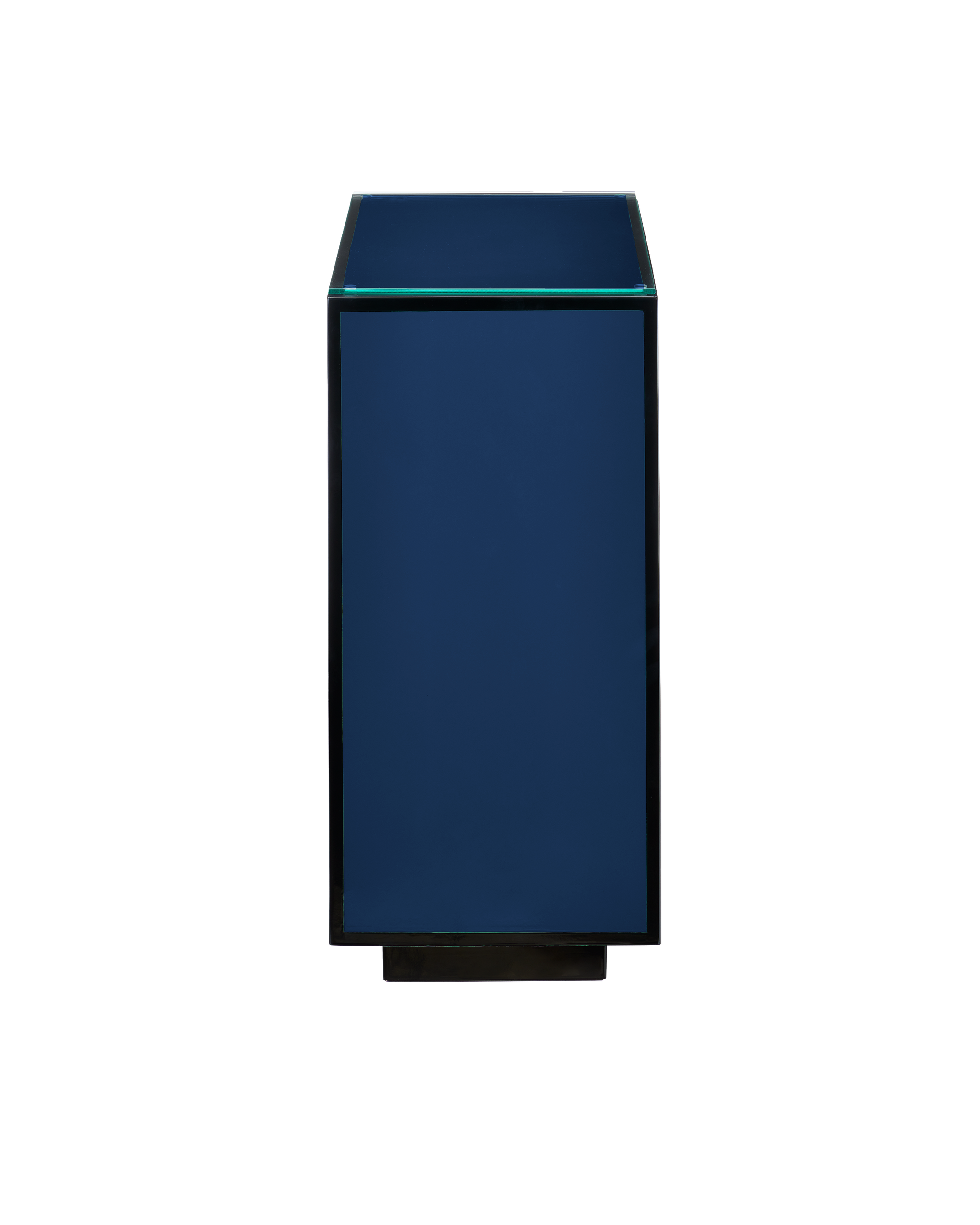 • Nothing beats the sheen of lacquer where decorative elements are concerned, as is evident in the sleek surfaces of the Navy Lacquer Side Table. Made of wood, the accent table has been covered in the time-honored lacquer process. The luxe blue surfaces are rimmed in rich black, and the top is fitted with a square of tempered glass. The plinth base is a design feature of note.