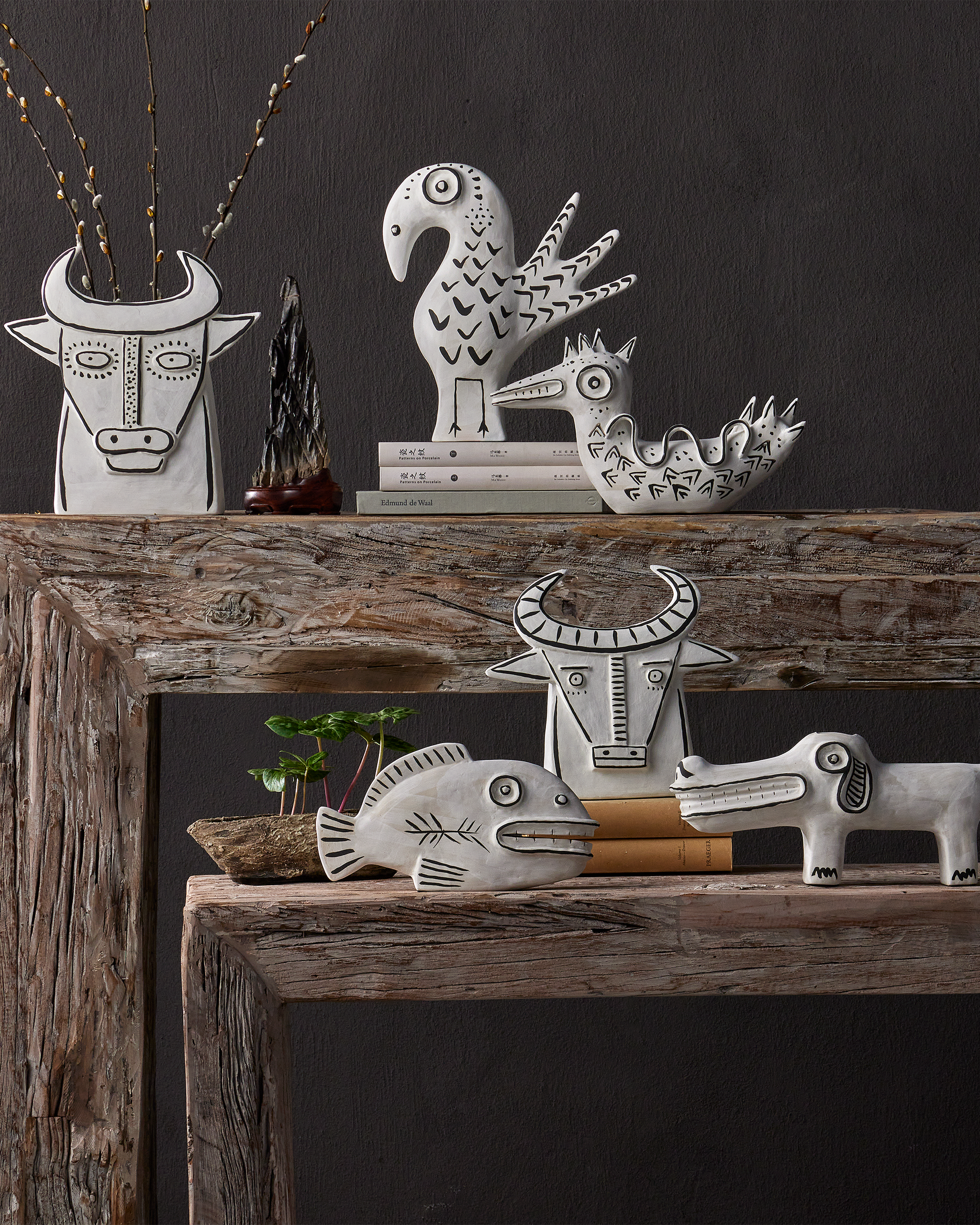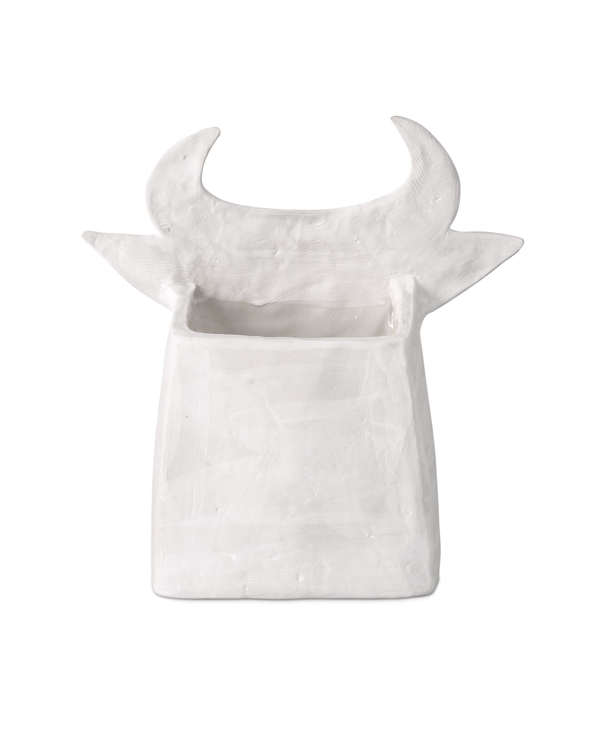 • Artist Xiang Yang, a brilliant ceramist, took a walk on the wild side when he created Thomas the Bull. Made of porcelain in a washed-white finish with black whimsical details painted by the artist, the haunting vessel will create a stir not unlike Picasso's work did during his ceramics period as he experimented in the South of France.