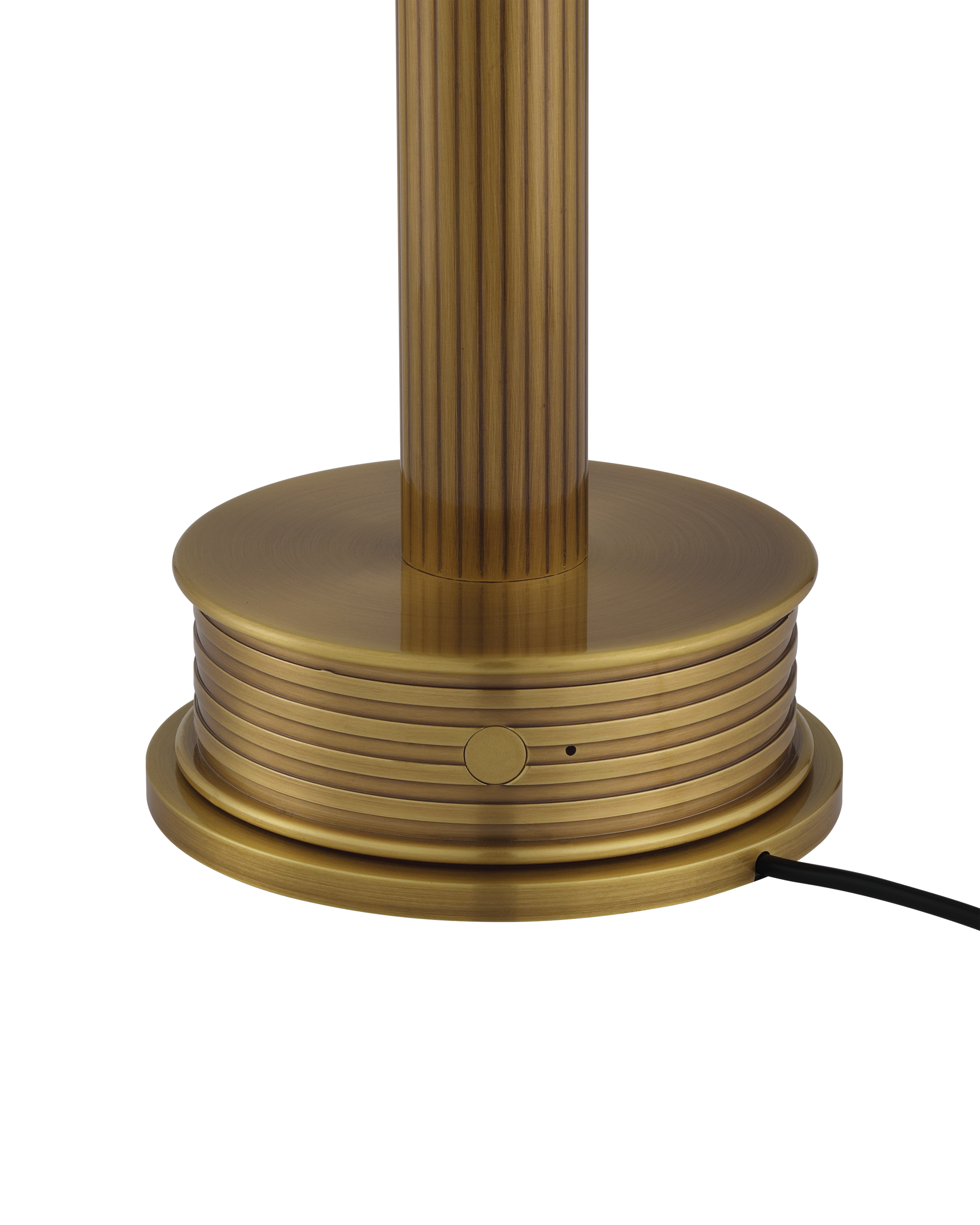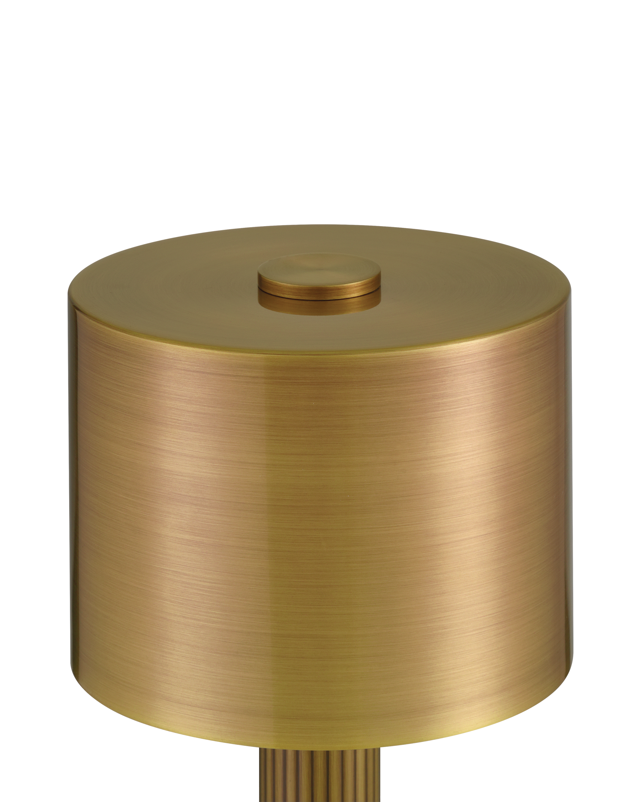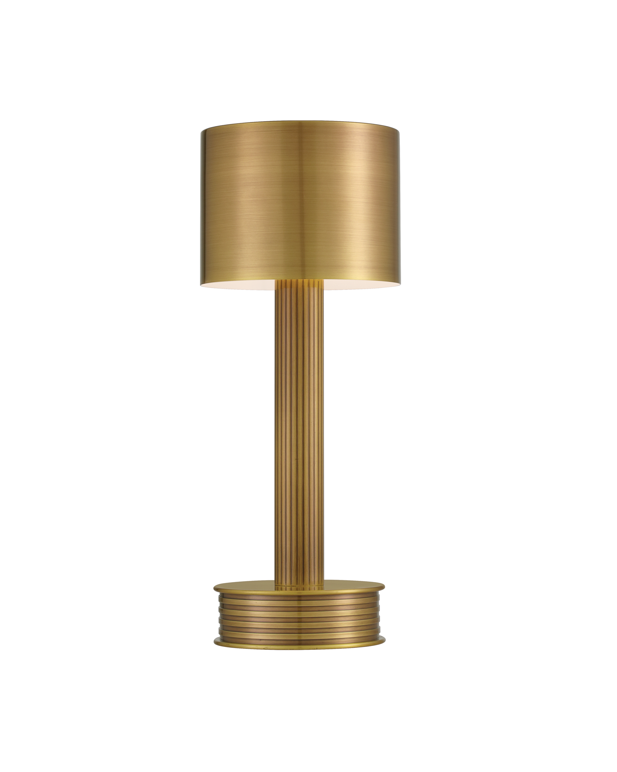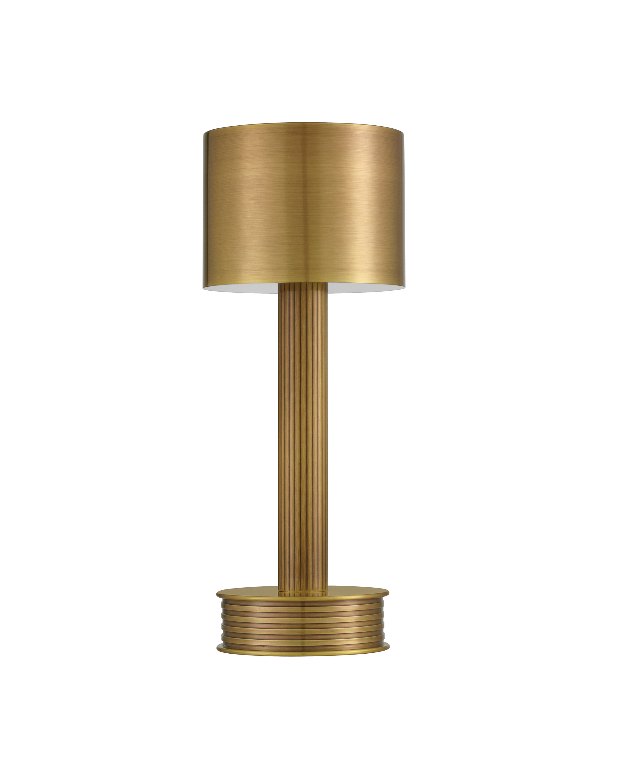 • The Traverse Brass Cordless Table Lamp is a gold lamp that moves around easily. The metal lamp in a polished brass finish is petite in size, and its base holds the on/off switch. The matching metal shade has the same brilliant sheen as the rest of it. To recharge, simply place the Sortie on a separate charging pad.