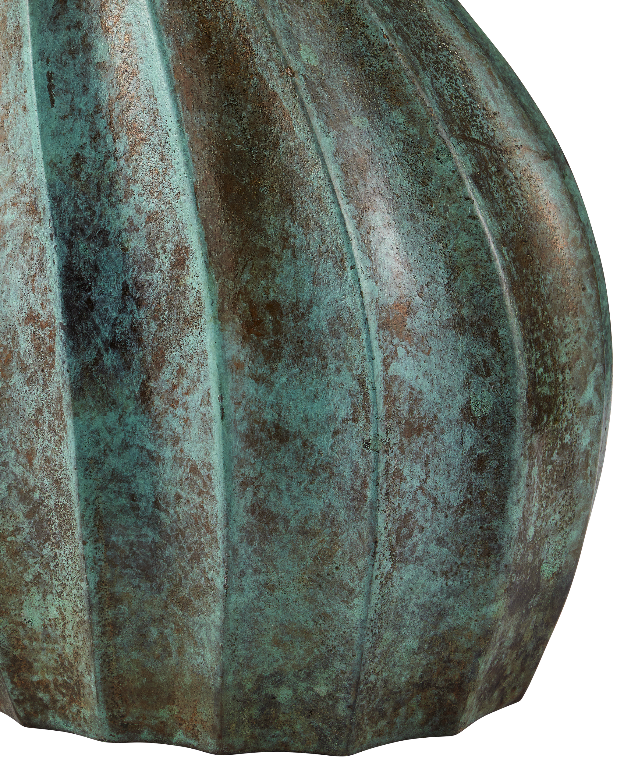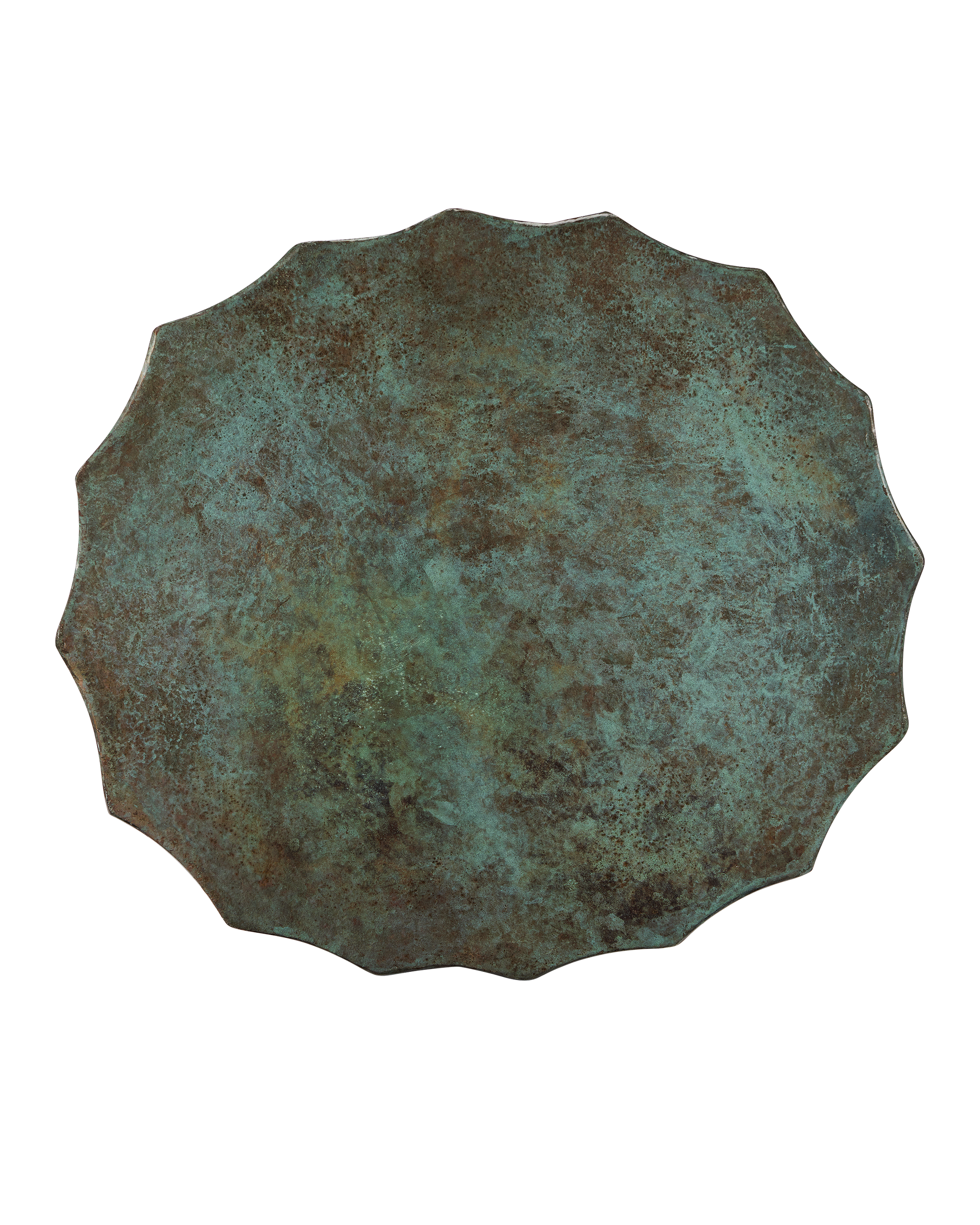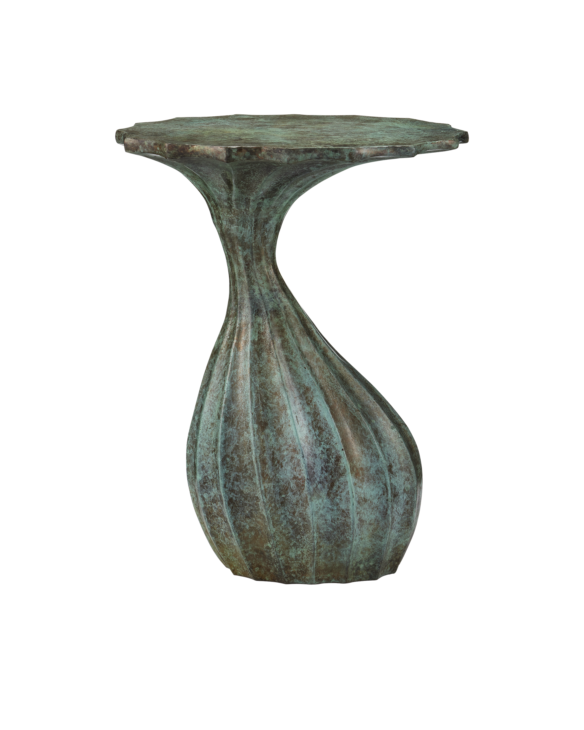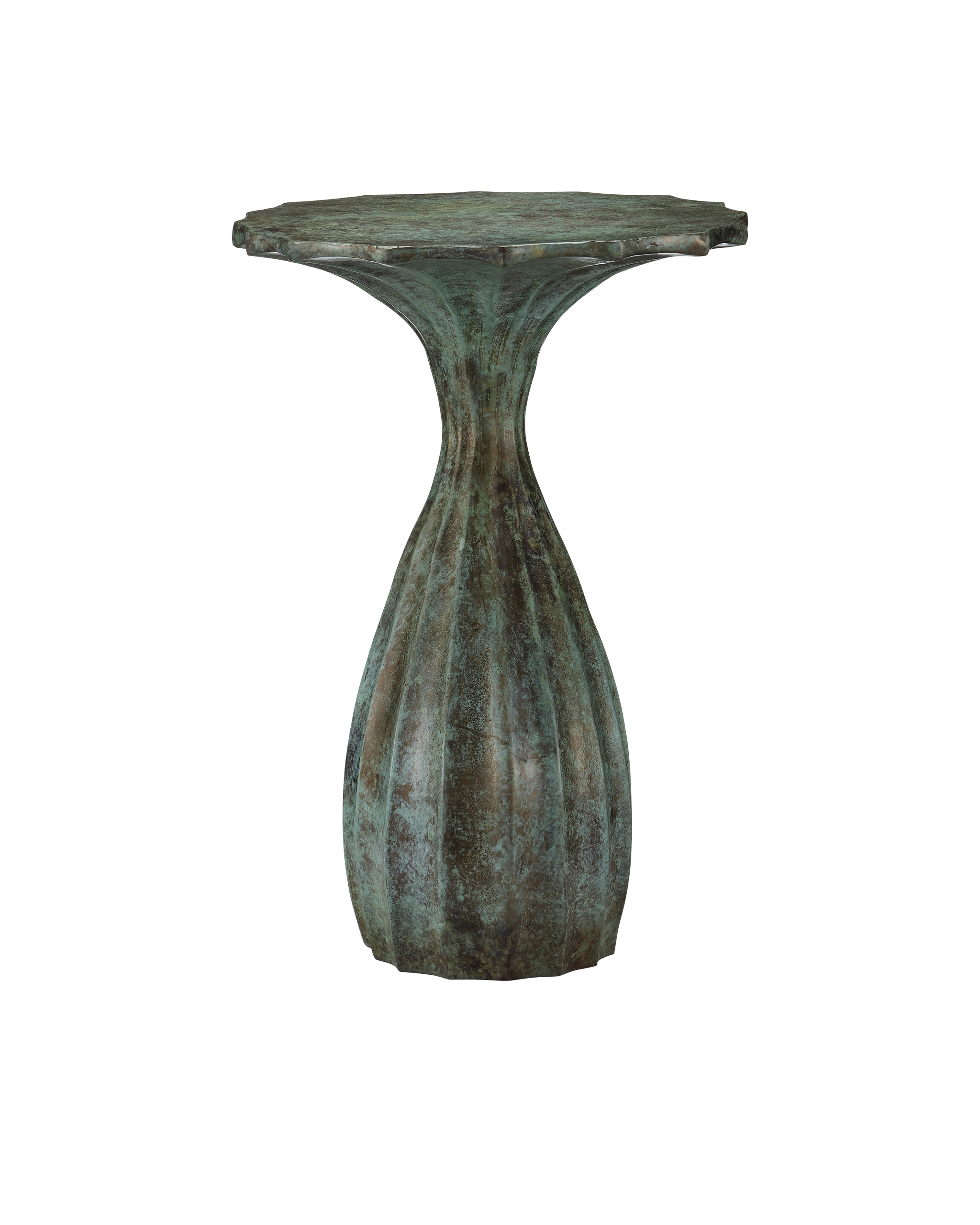 • The Tunis Accent Table is made of cast aluminum in a faux verdigris finish. There is a touch of sheen on the mottled surfaces that flow around it and extend up to its top. The artisanal hand of the craftsman who makes this is evident in the strong variations in the placement of the different tones, accentuated by the peaks and valleys.