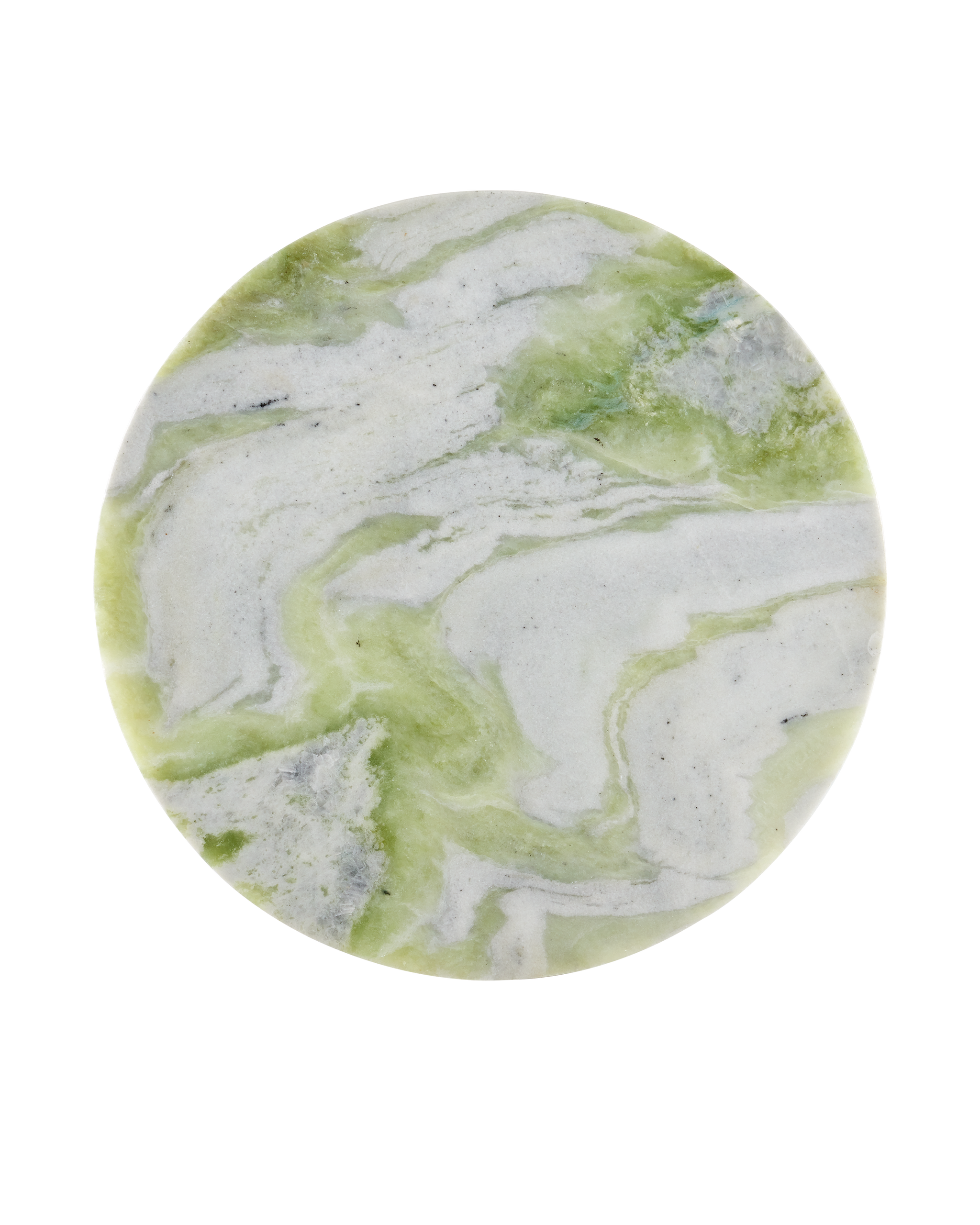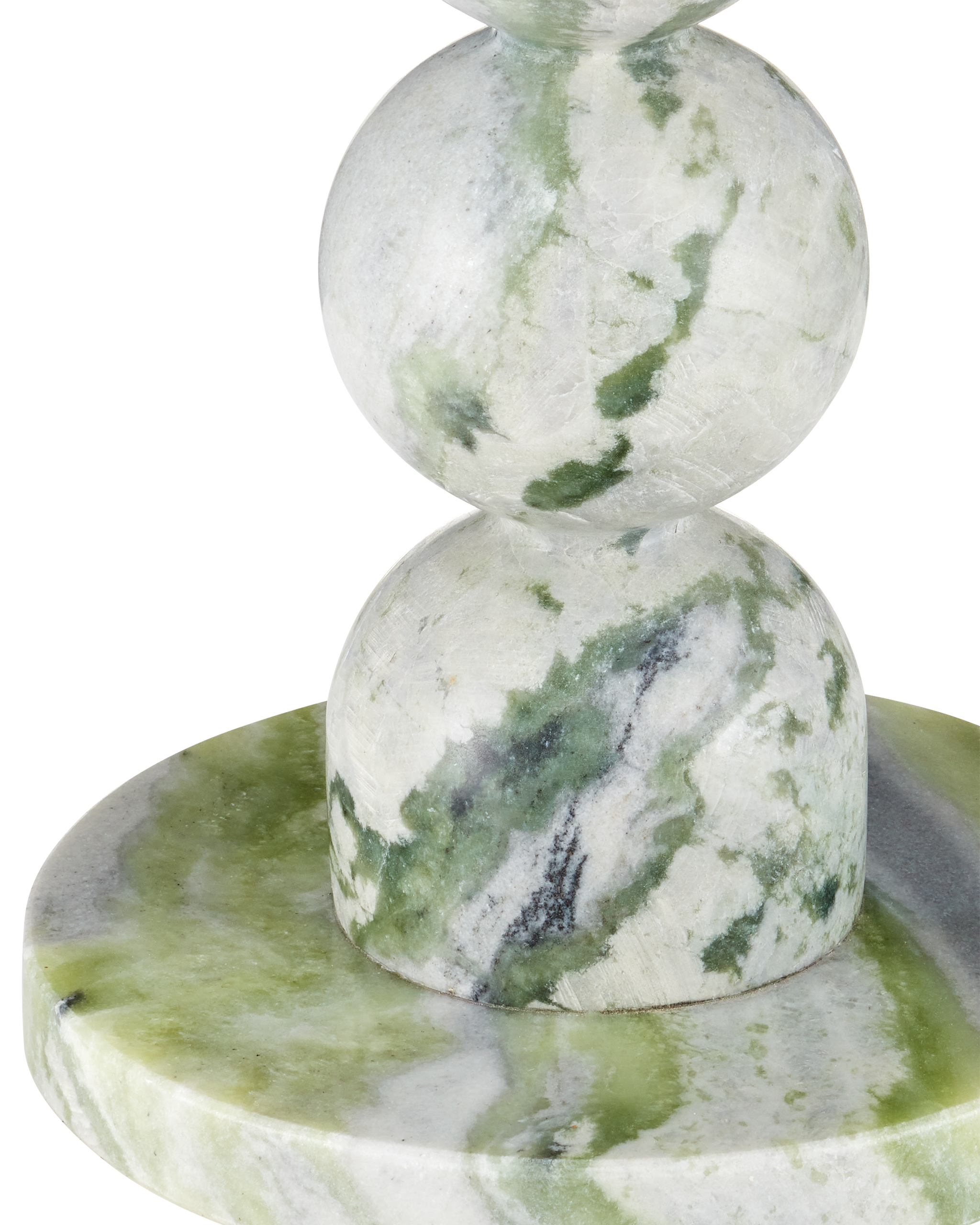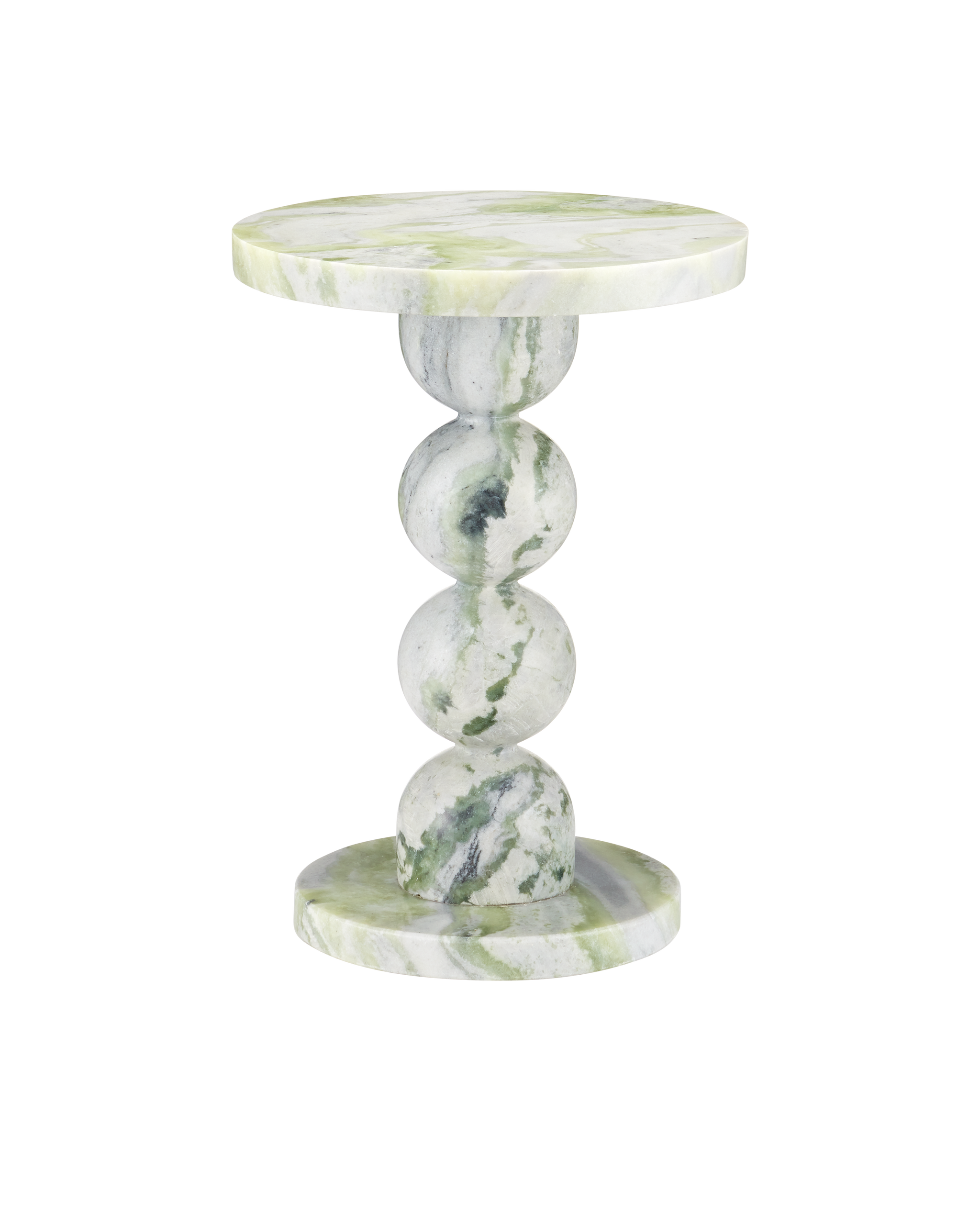 • The Turner Green Onyx Accent Table exhibits natural beauty and refined craftsmanship. Made from richly patterned green onyx, striking veins of green, gray, and beige flow along its surfaces to make each table unique. The pedestal, designed to resemble stacked spheres, is actually a meticulously turned column. The table rises from a round base to a slightly larger round top, reaching nearly 20 inches tall.
