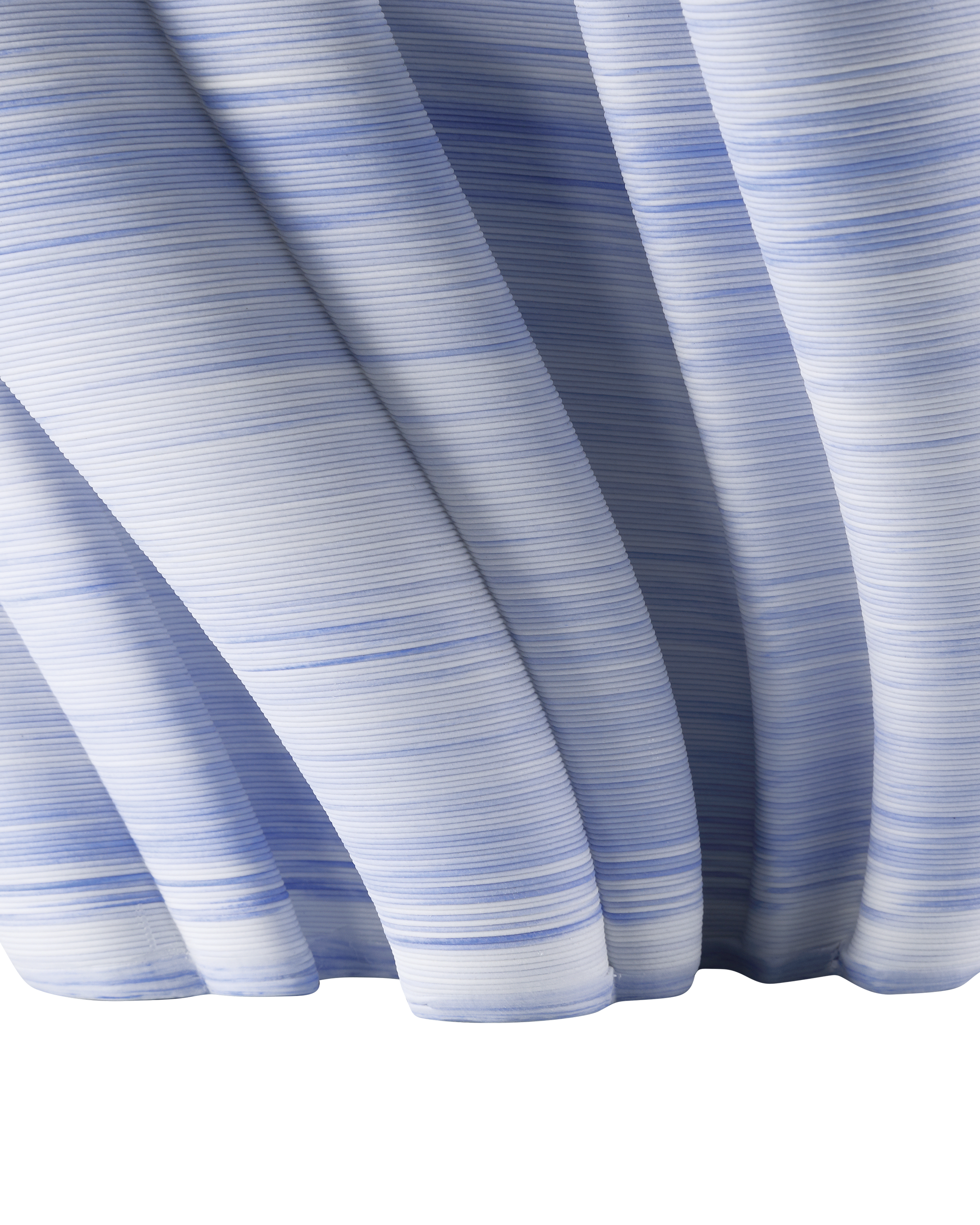 • The Twirl Blue Bowl is made of 3D-printed porcelain to create the illusion that the vessel is twisting as it rises. The blue and white clays are mixed before they are fed into the printer, creating textural striations on the surface of the vase, which is a little over 6inches high and expands in waves to 12.5 inches in diameter. This means the placement of the color will vary, but the overall design will be perfectly uniform. This vase is not watertight.