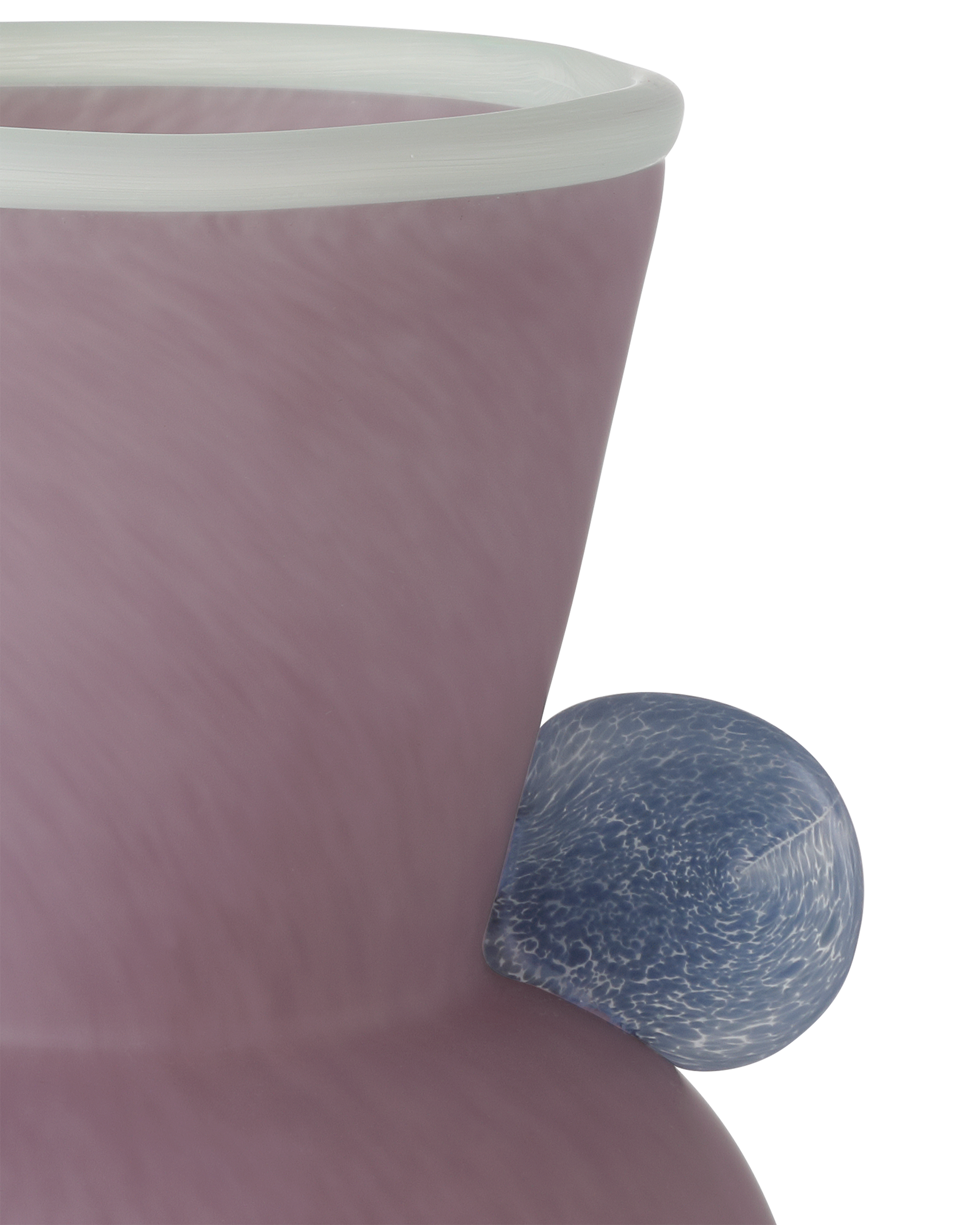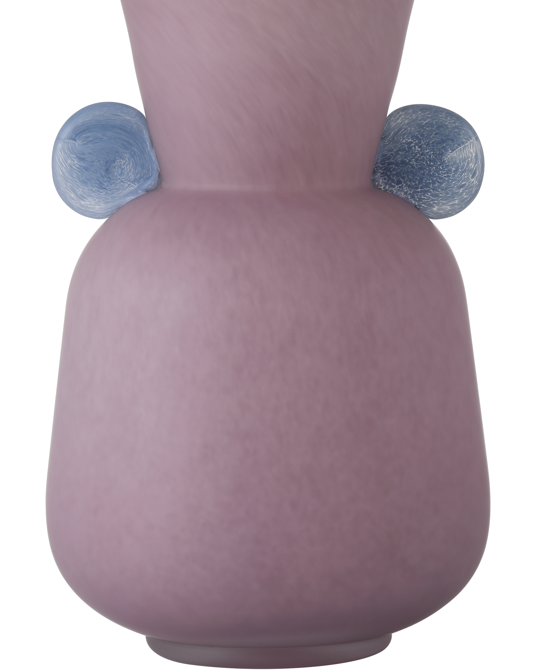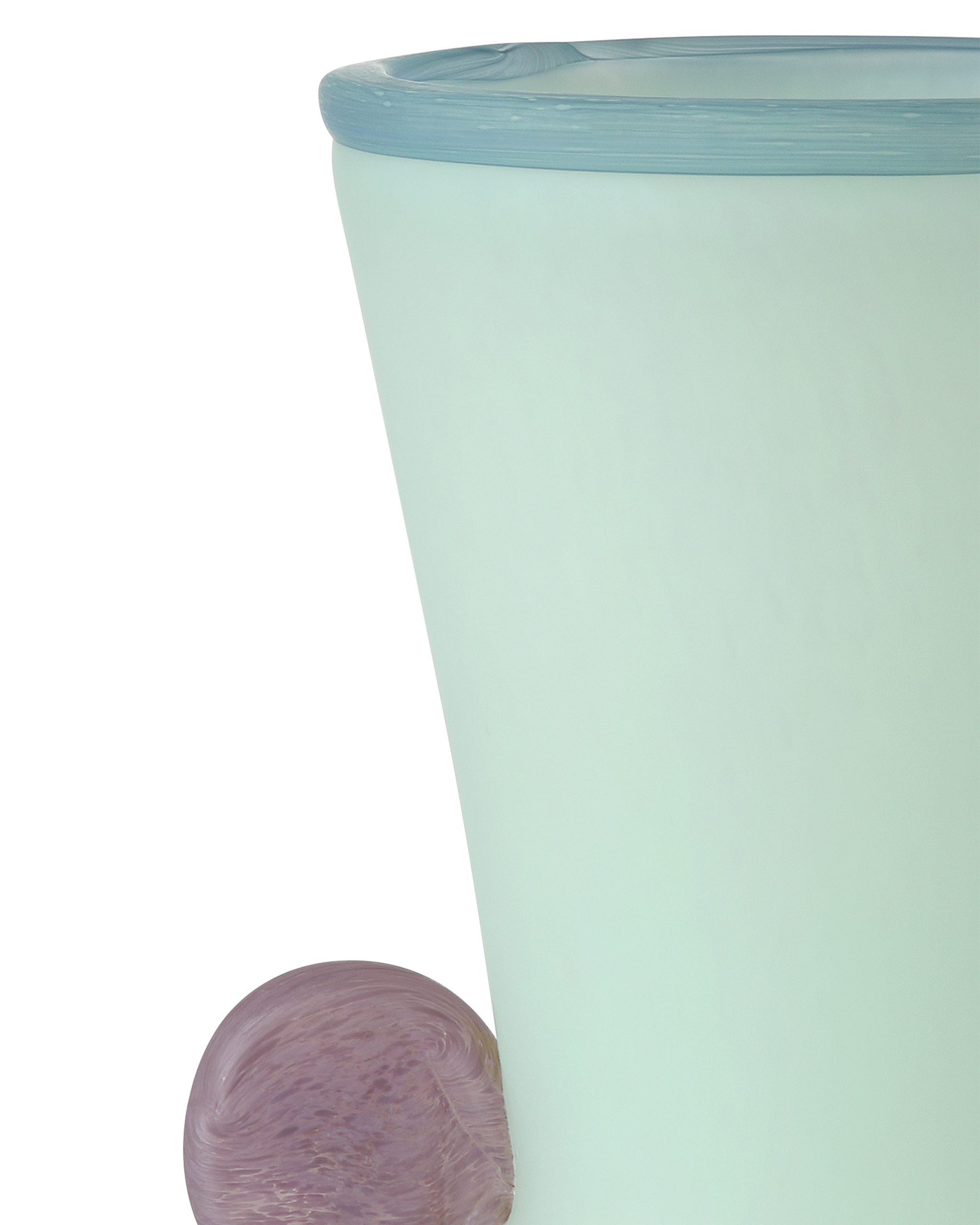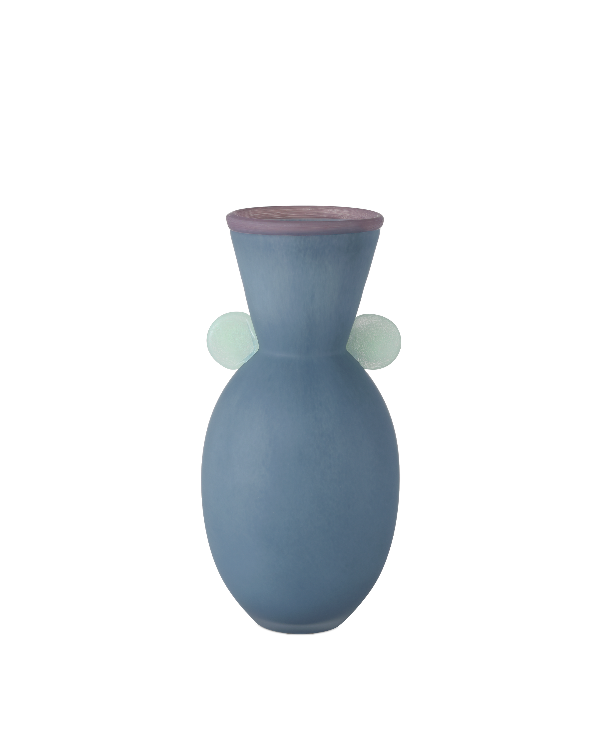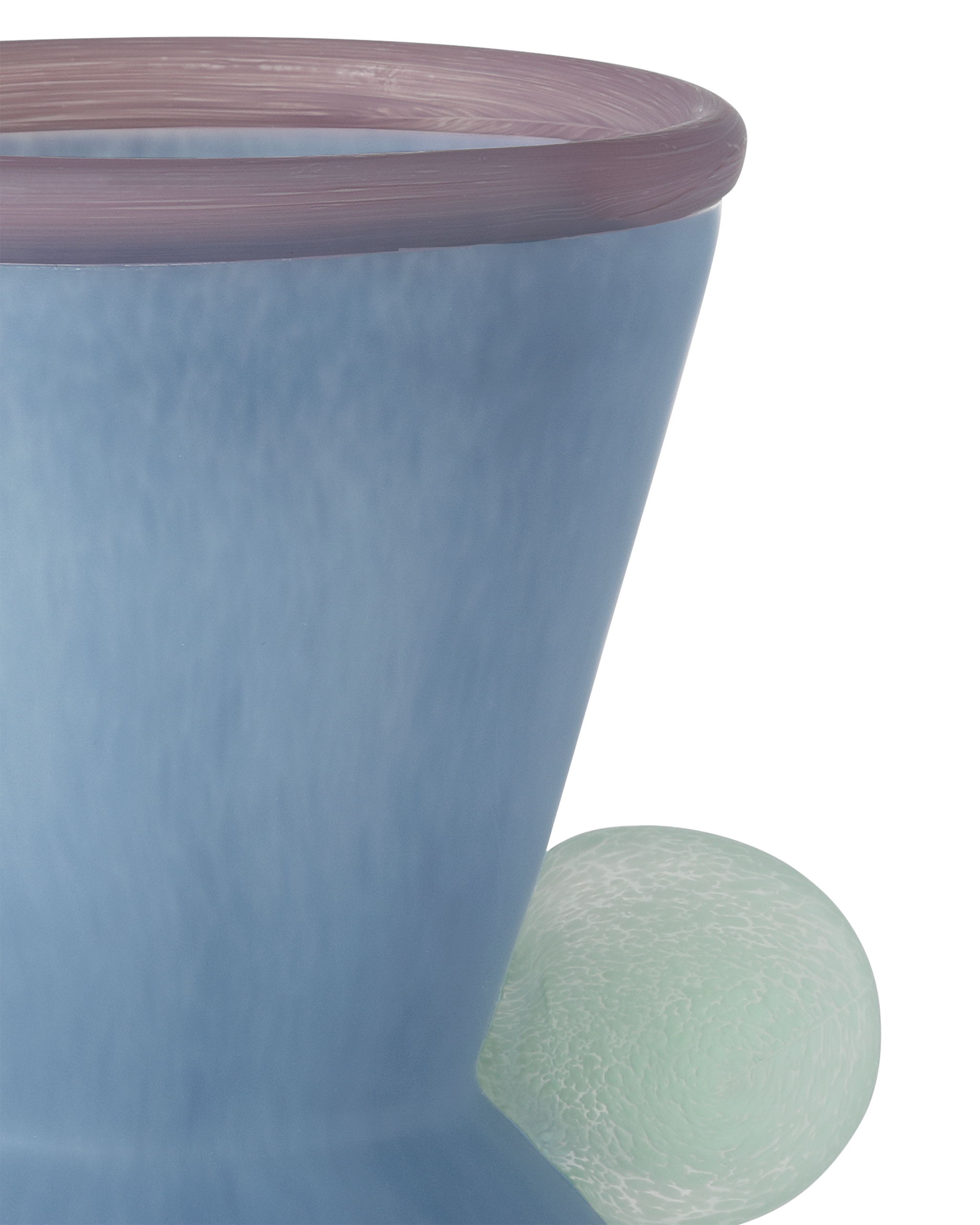 • The Vassily Vase Set is a trio of mouthblown glass vessels, each individually fired in separate ovens to achieve each color: one for blue, one for purple, and one for mint green. After firing, each pastel vase is sand-blasted to provide the surface with a matte texture that appears as if it has been lightly sprayed or frosted. With their clean silhouettes and misted surfaces, the Vassily Vases make a modern statement whether grouped together or displayed individually.