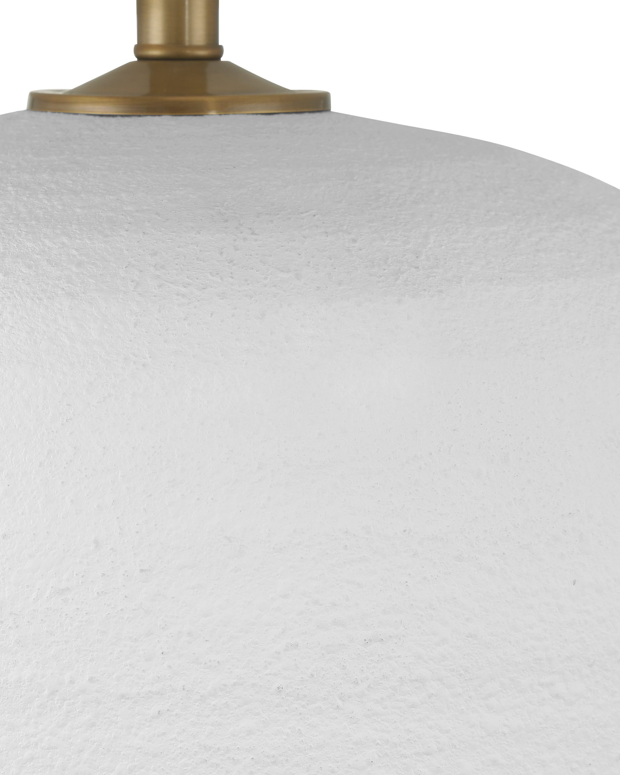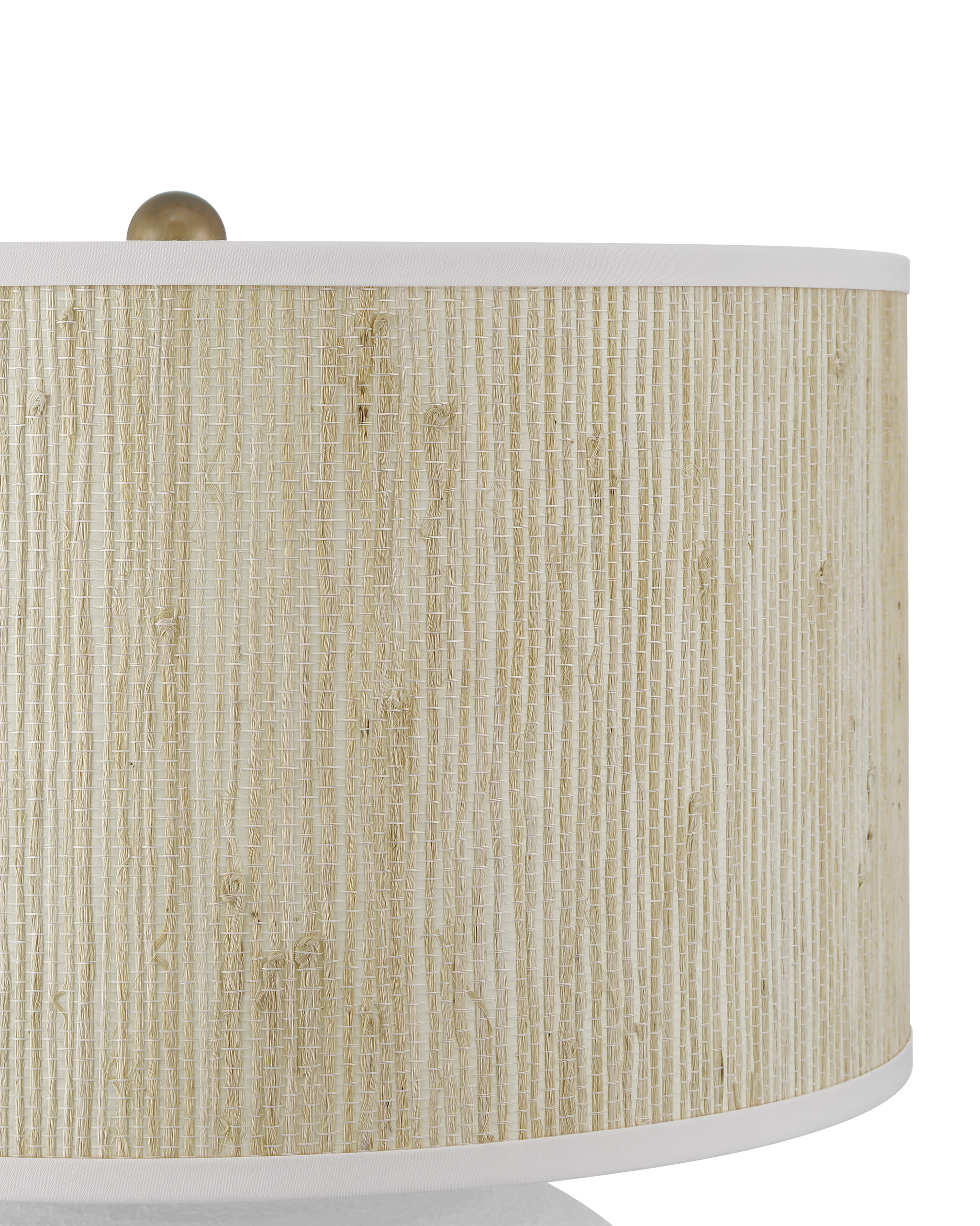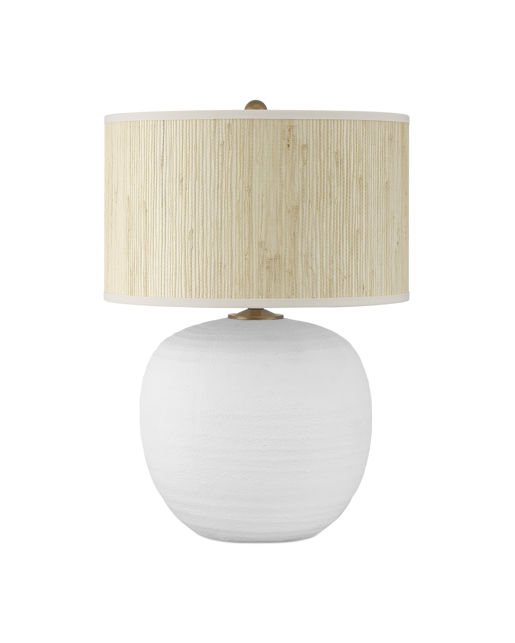• The Zena White Table Lamp has a terracotta body with subtle ribbing from the impressions left by the fingers that created it. The textured white finish adds another dimension to its surface character. A thicker than normal grasscloth shade with rimmed edges tops the lamp with its rotund shape in a crisp shade of white. The antique brass finish on the metal is a warm contrast to the pastel hue on the Zena.