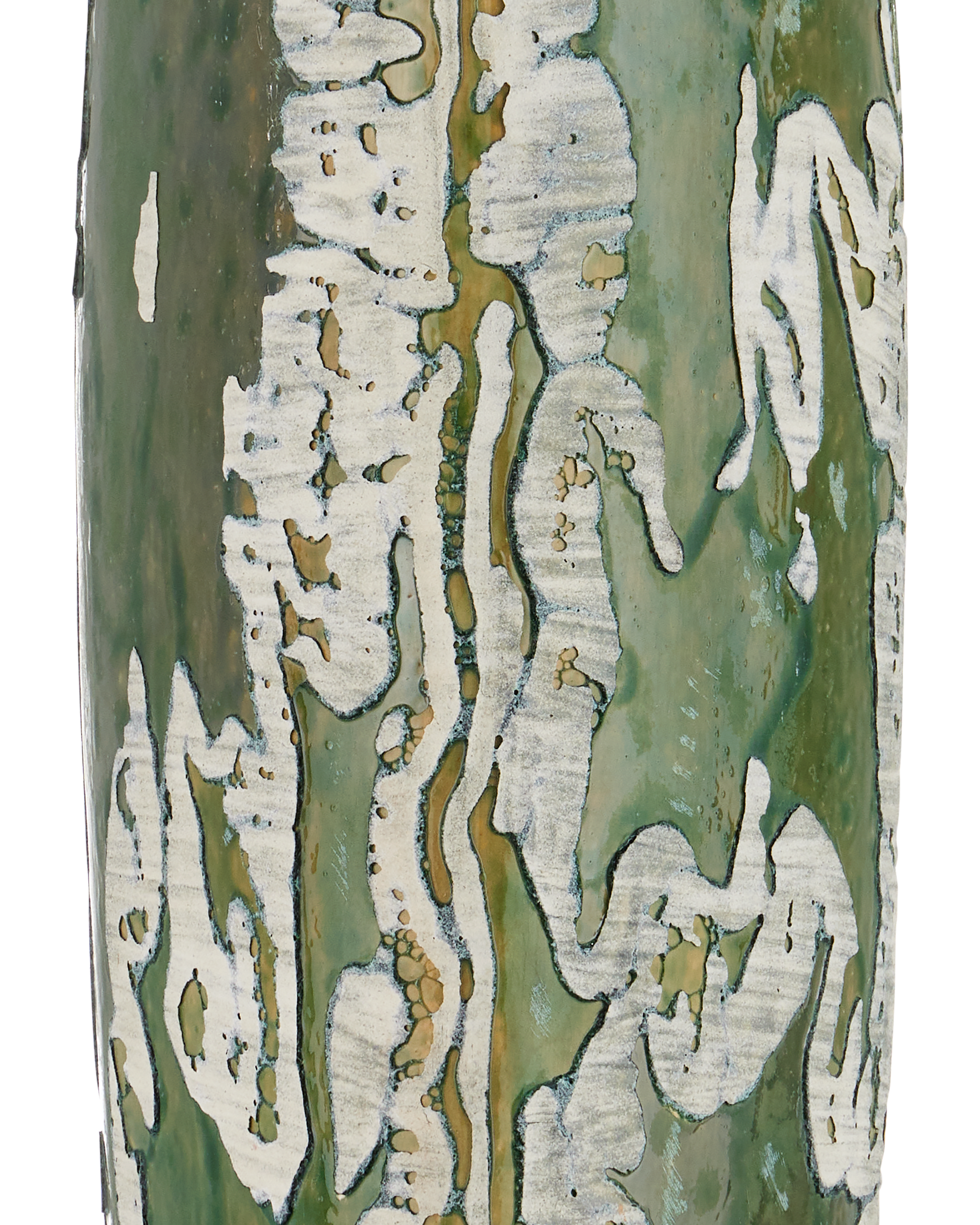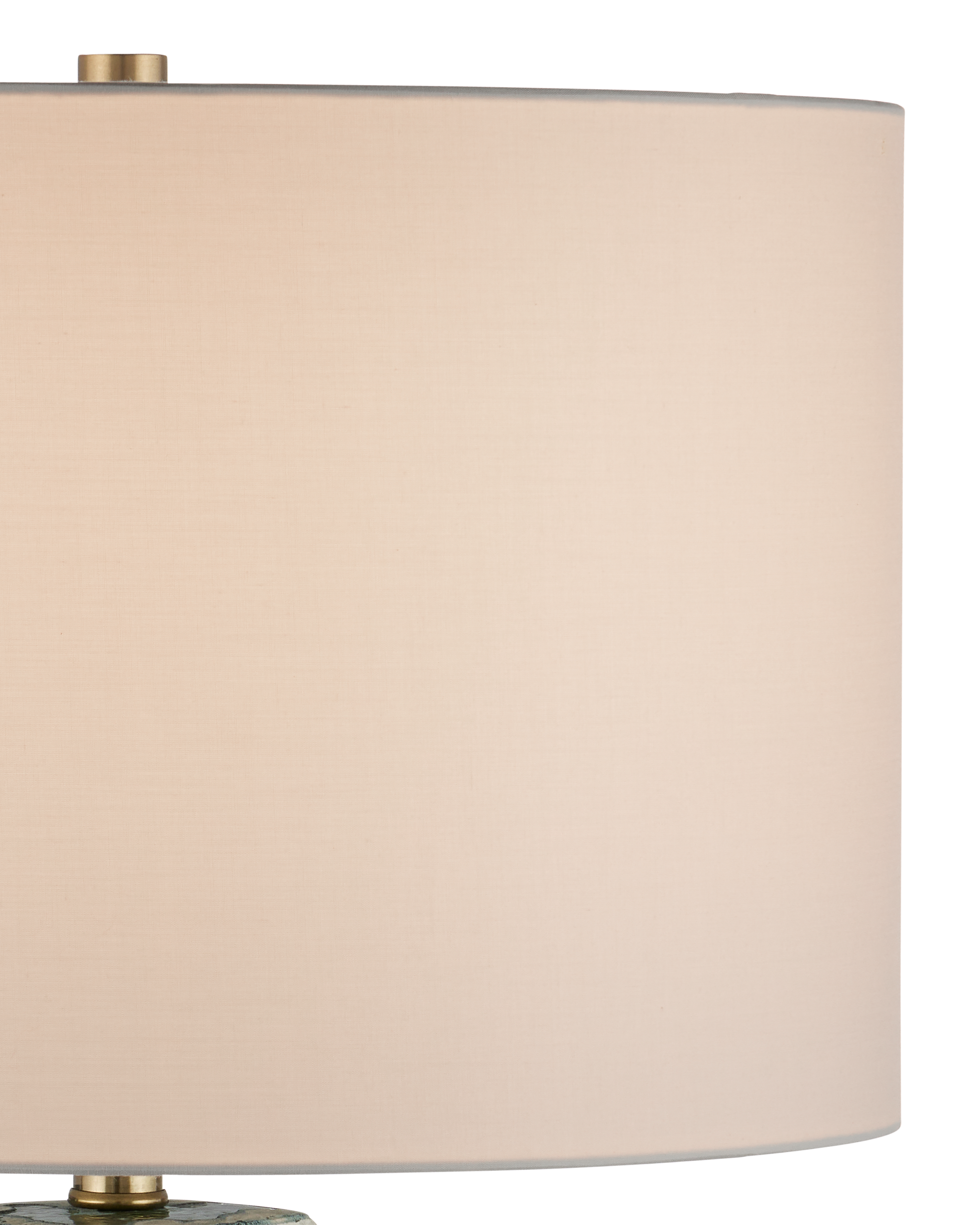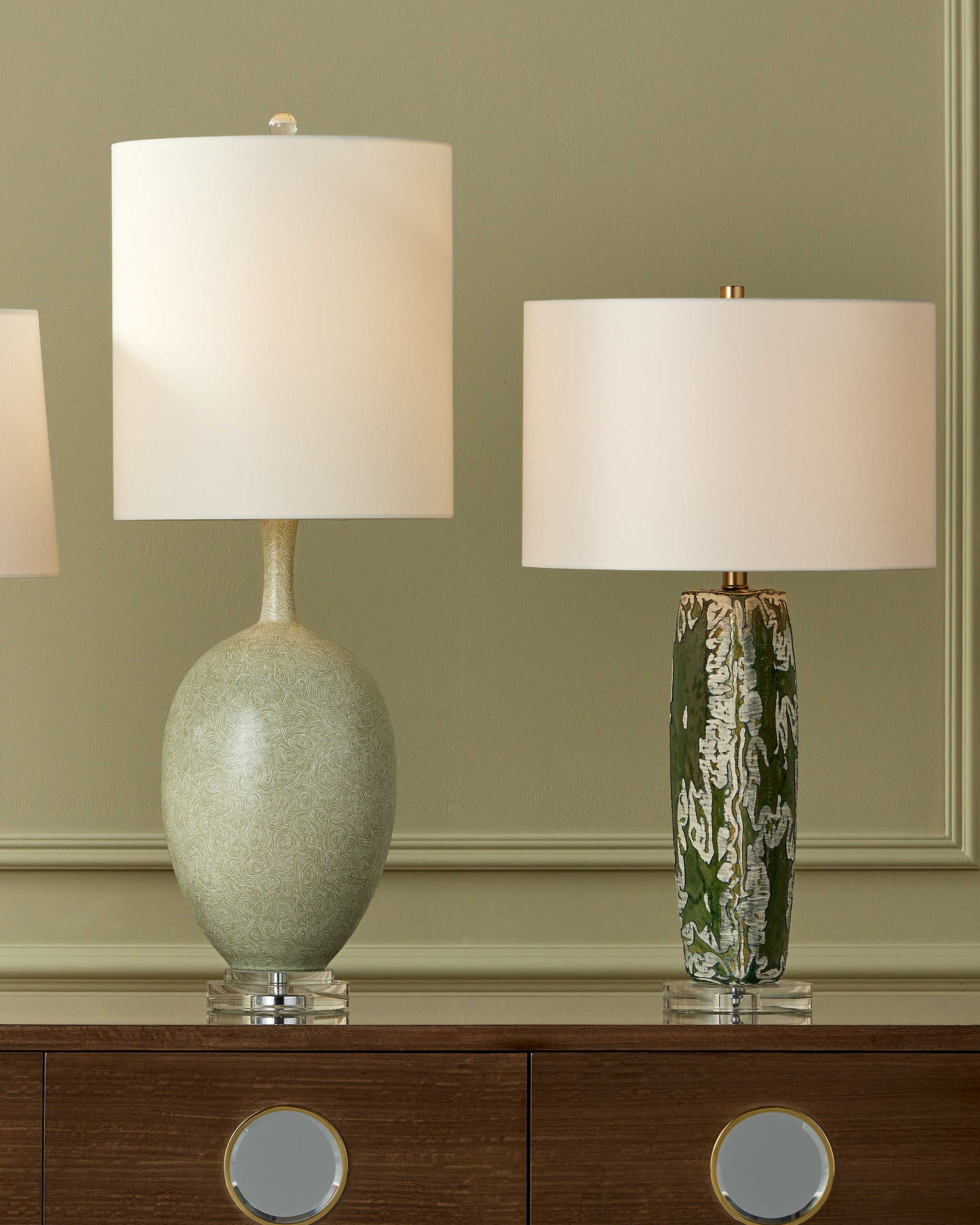 • The Zowan Table Lamp is made of ceramic in a matte green smoke glazing flowing along its surface that looks like a genealogical map. The cream that overlays the green has been hand-applied to bring the lamp an artful feel, and the optic crystal base from which the fixture rises leaves the painterly column to be the focal point of the design. One of the interesting things about this green lamp is that the pattern will change slightly when seen from different angles.