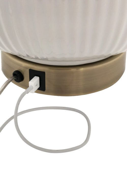 The Sophia lamp by Wildwood features an almond finish, an antique brass base and USB port! Accented with an off-white linen shade, the Sophia is sure to tie a room together!