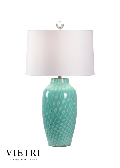 Inspired By The Crystal Blue-Green Waters Of The Caribbean, Antigua Lamp Features Mouth Blown Italian Glass With A Polished Nickel Mounting And French Wiring. The Off White Silkette Drum Shade Is Secured On Top With A Classic Acrylic Ball Finial Creating Ample Light For Your Coastal Themed Design.