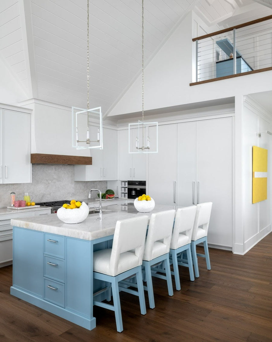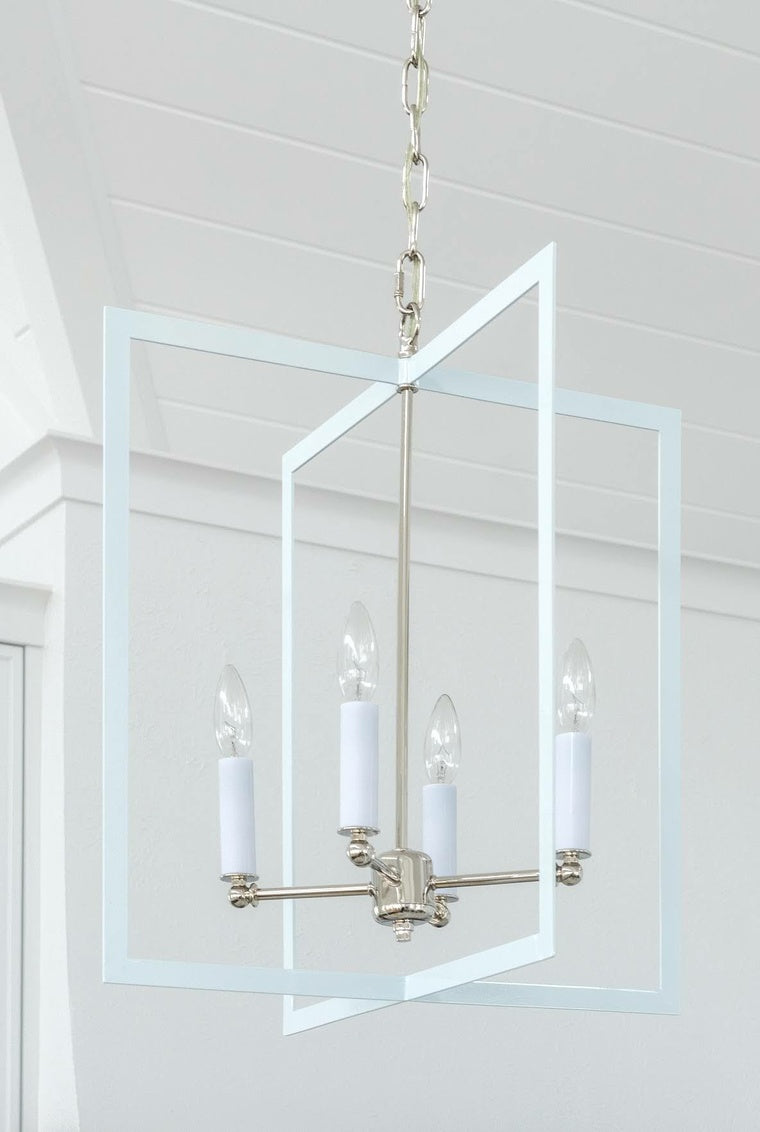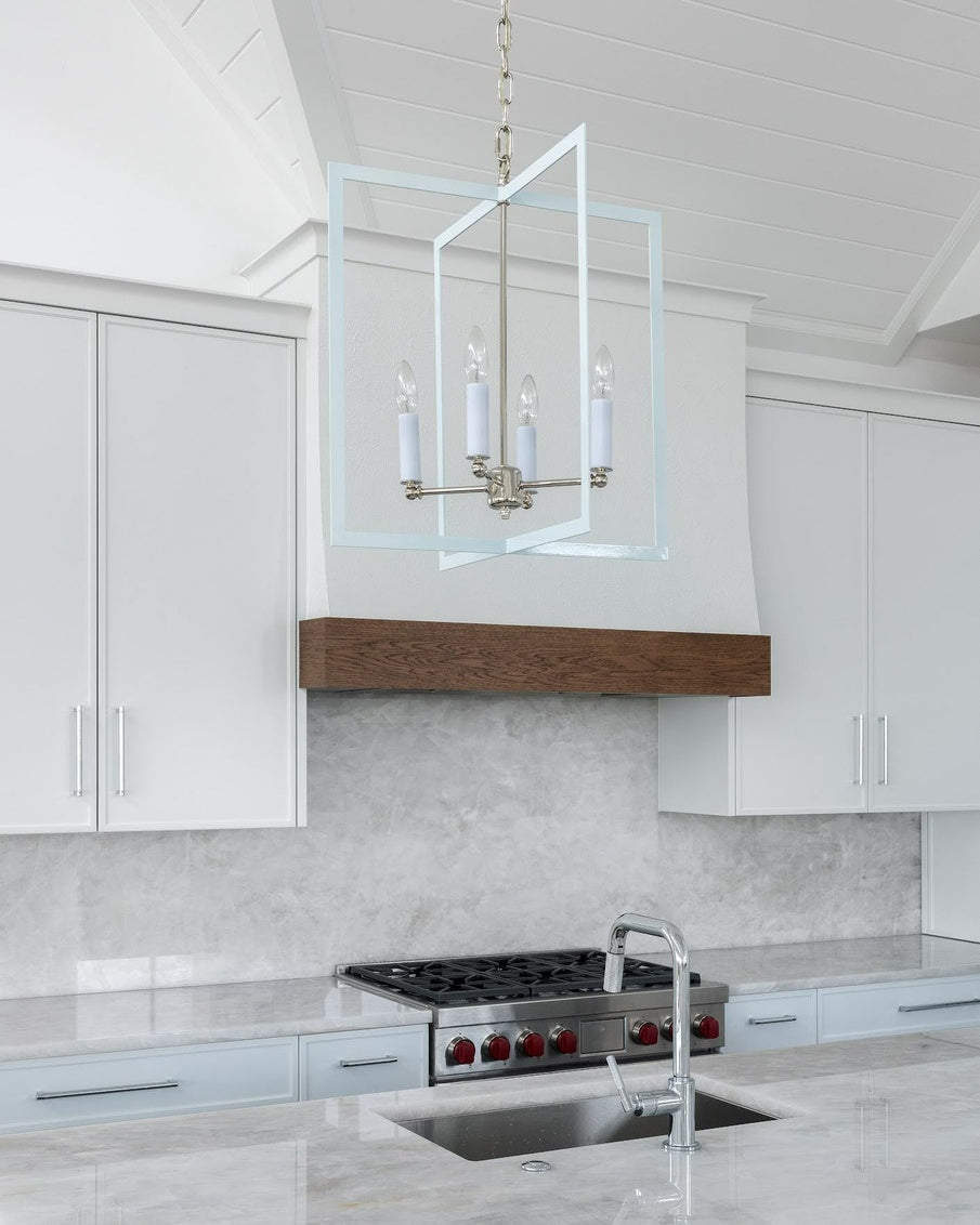 • The Bayberry Hanging by Megan Gorelick Interiors is ideal for over kitchen islands. The crisp white finish and polished nickel accents provide a super clean aesthetic.