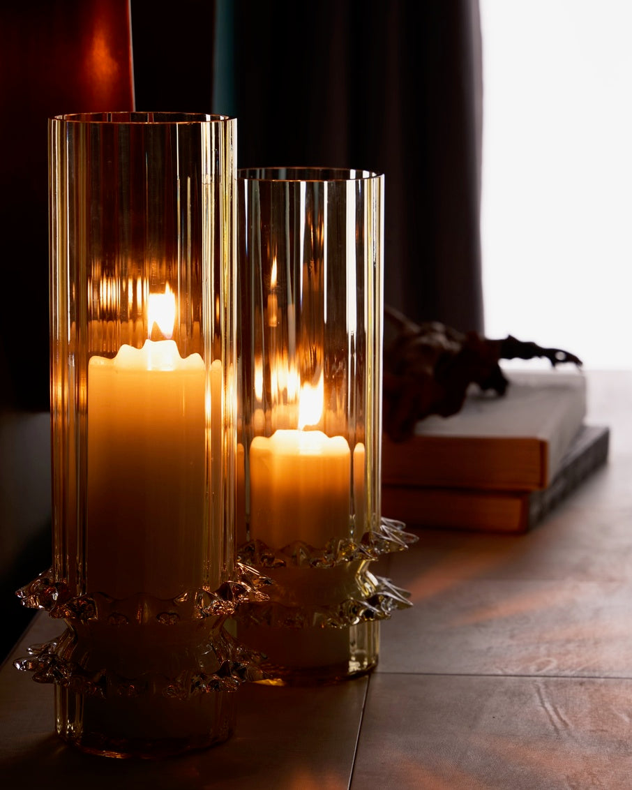 • The Maria Vase is crafted from mouth-blown Italian glass, showcasing a warm golden or deep blue hue and intricate, sculptural detailing at the base. A luminous accent piece that brings both texture and elegance to any setting.