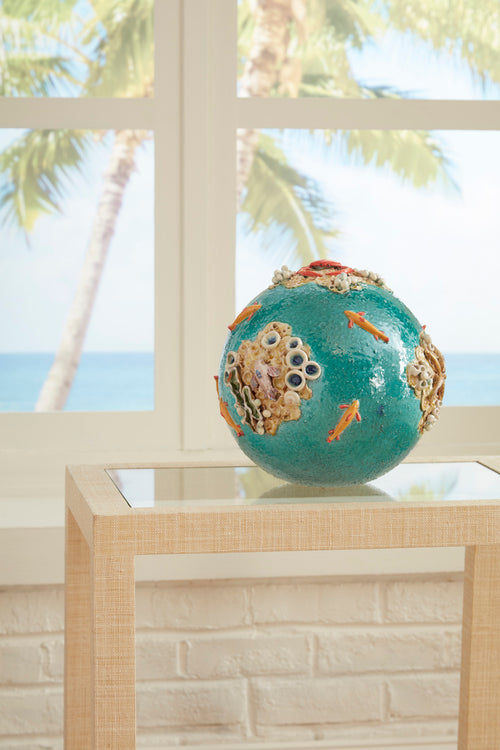 • Hand sculpted and painted ceramic sphere decorated with a crab, starfish, barnacles and fish in glaze colors from the sea.