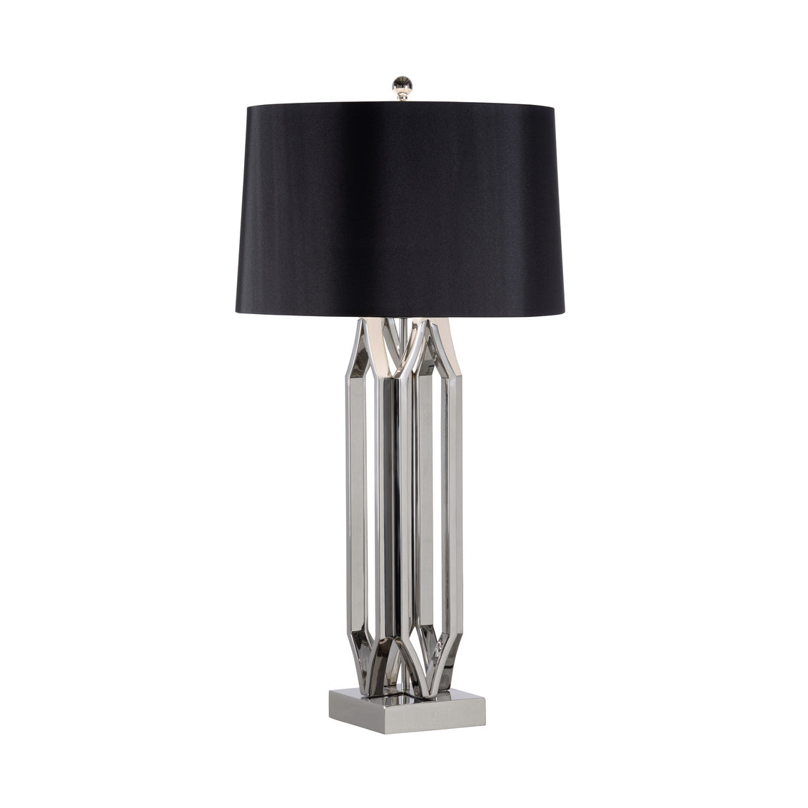 • Make a statement in your great room, master suite or two story foyer with this tall, transitional table lamp. A modern geometric design boasts a sleek polished nickel finish that catches light that falls from under the black tapered shade and complements any design style.
