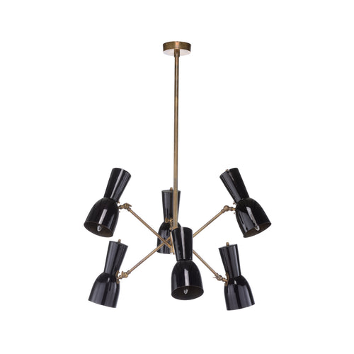 • Thayer Chandelier Is A Six Arm Chandelier Inspired By The Mid-Century Modern Style. Each Arm Features A Matte Black Cone Shaped Shade That Tilts To Provide Directional Illimination Throughout Your Space.