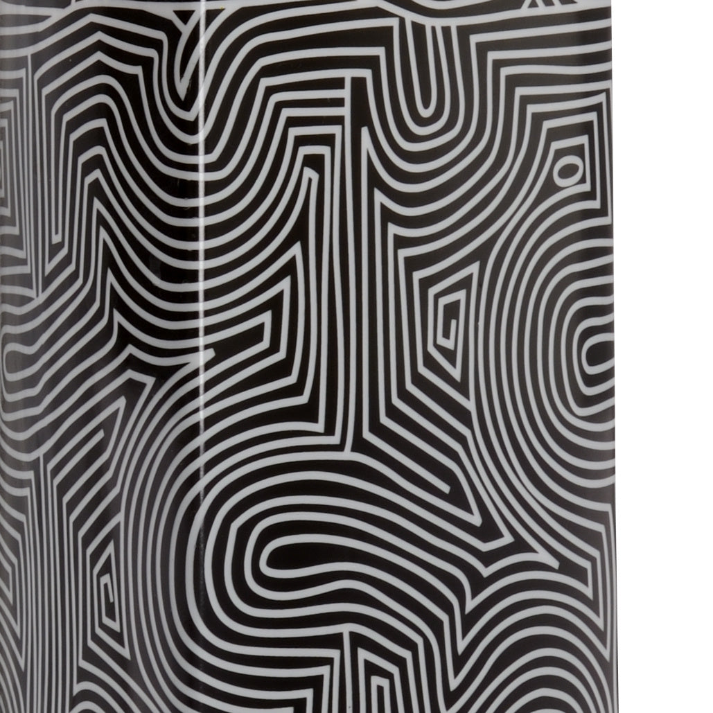• Bring sophistication to your space with this black and white glazed ceramic canister with metallic gold trim. It features a unique triangular shape that boasts a captivating geometric design. An off white silk shade and round brass finial lend elegance to this transitional lamp that is sure to be a focal point in a bedroom or living area.