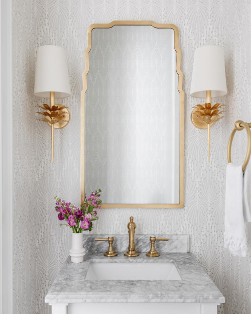 Add a cozy interplay of light and shadow to any room with this elegant, one-arm sconce featuring a graceful, three-layer botanical motif.  Finished with hand-applied gold leaf and topped with a white linen shade, Delilah evokes an inviting, radiant sophistication, especially when paired to accentuate a mirror or secretary.